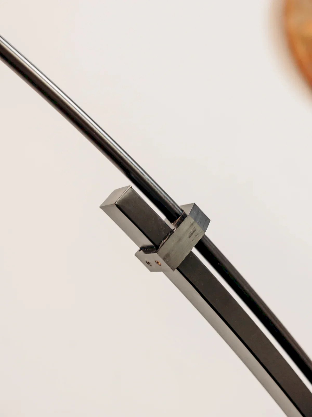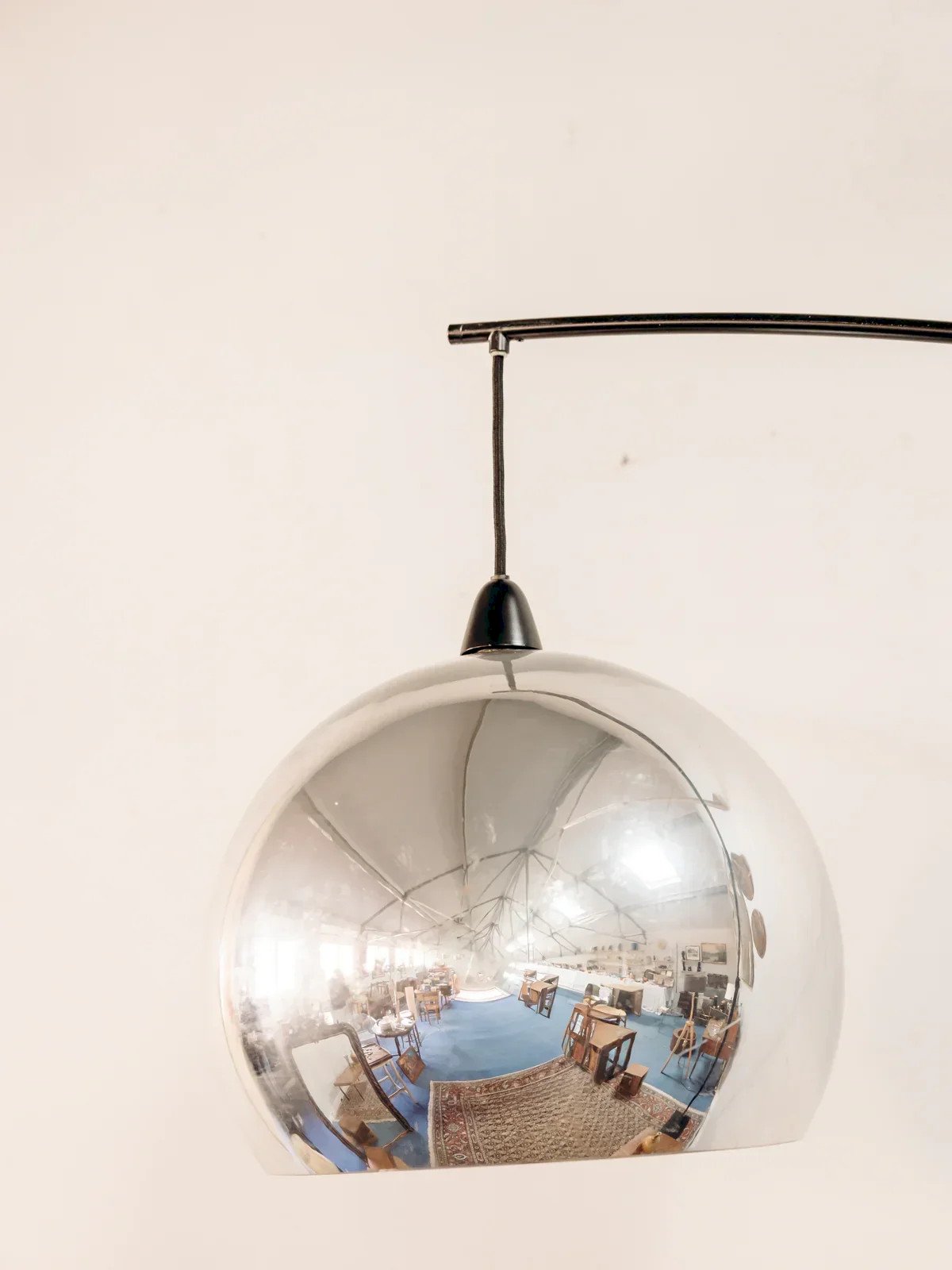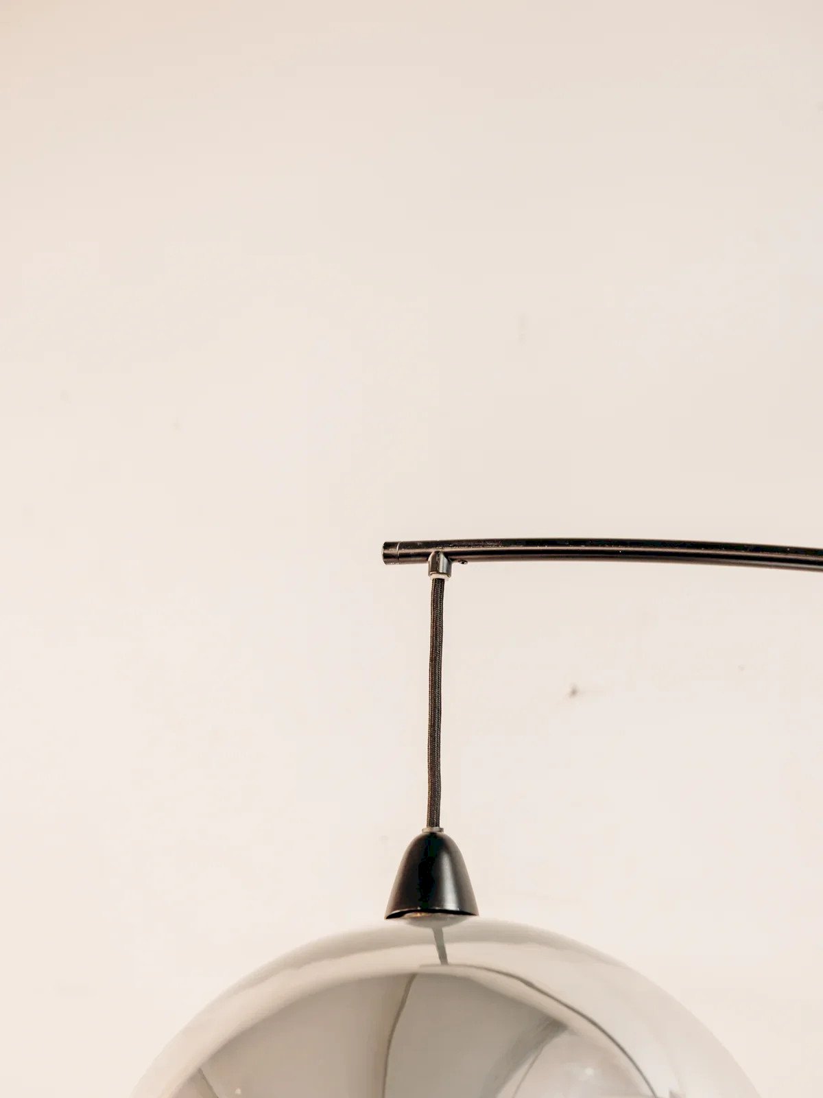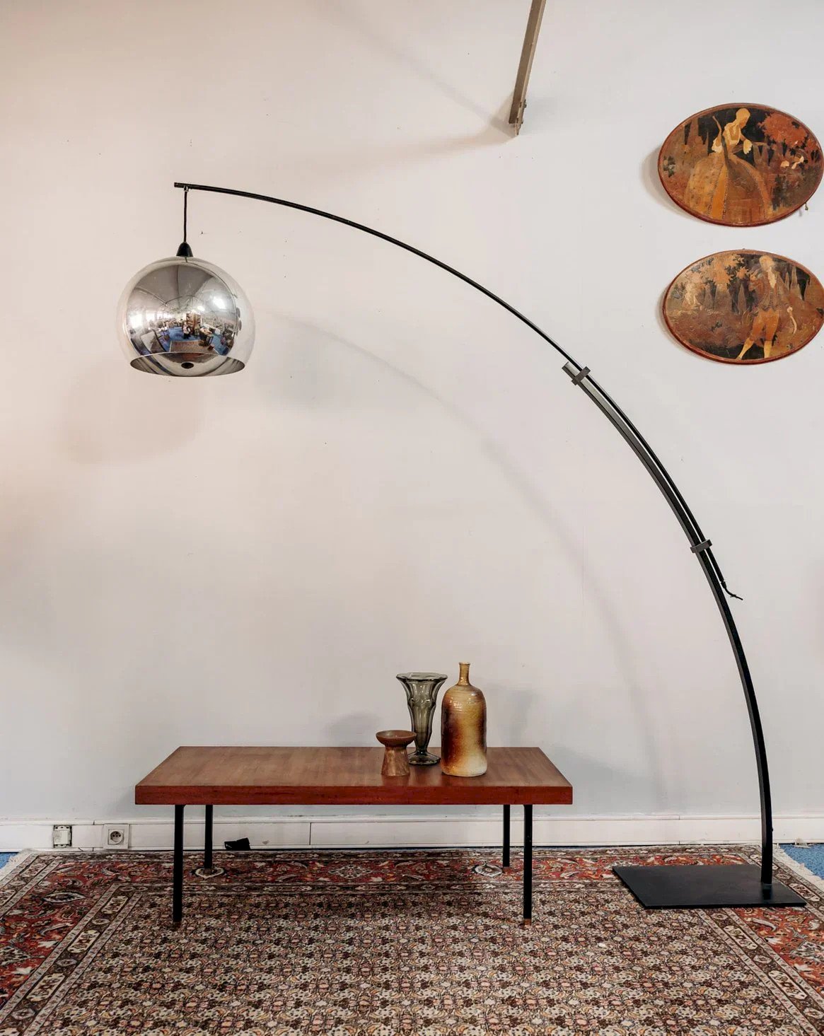 Invitez ce grand lampadaire incurvé au sein de votre intérieur, dont l'abat-jour en inox pend tel un luminaire suspendu et crée un point de lumière aérien et raffiné. Sa portée généreuse et sa silhouette élancée permettent d'éclairer une table à manger ou un coin salon sans encombrer l'espace, tandis que son socle lourd noir assure stabilité et contraste élégant. Matériaux métalliques et lignes sculpturales participent à une ambiance contemporaine et graphique, chaleureuse sans ostentation. Longueur du socle : 185 cm Largeur du socle : 31 cm Hauteur : 205 cm État:Occasion: Objet ayant été utilisé. Objet présentant quelques marques d'usure superficielle, ...Occasion: Objet ayant été utilisé. Objet présentant quelques marques d'usure superficielle, entièrement opérationnel et fonctionnant correctement. Il peut s'agir d'un modèle de démonstration ou d'un objet retourné en magasin après une courte période d'utilisation. les éventuelles imperfections. Marque:Debongout Type:Produit chiné Vintage:Oui Style:Contemporain
