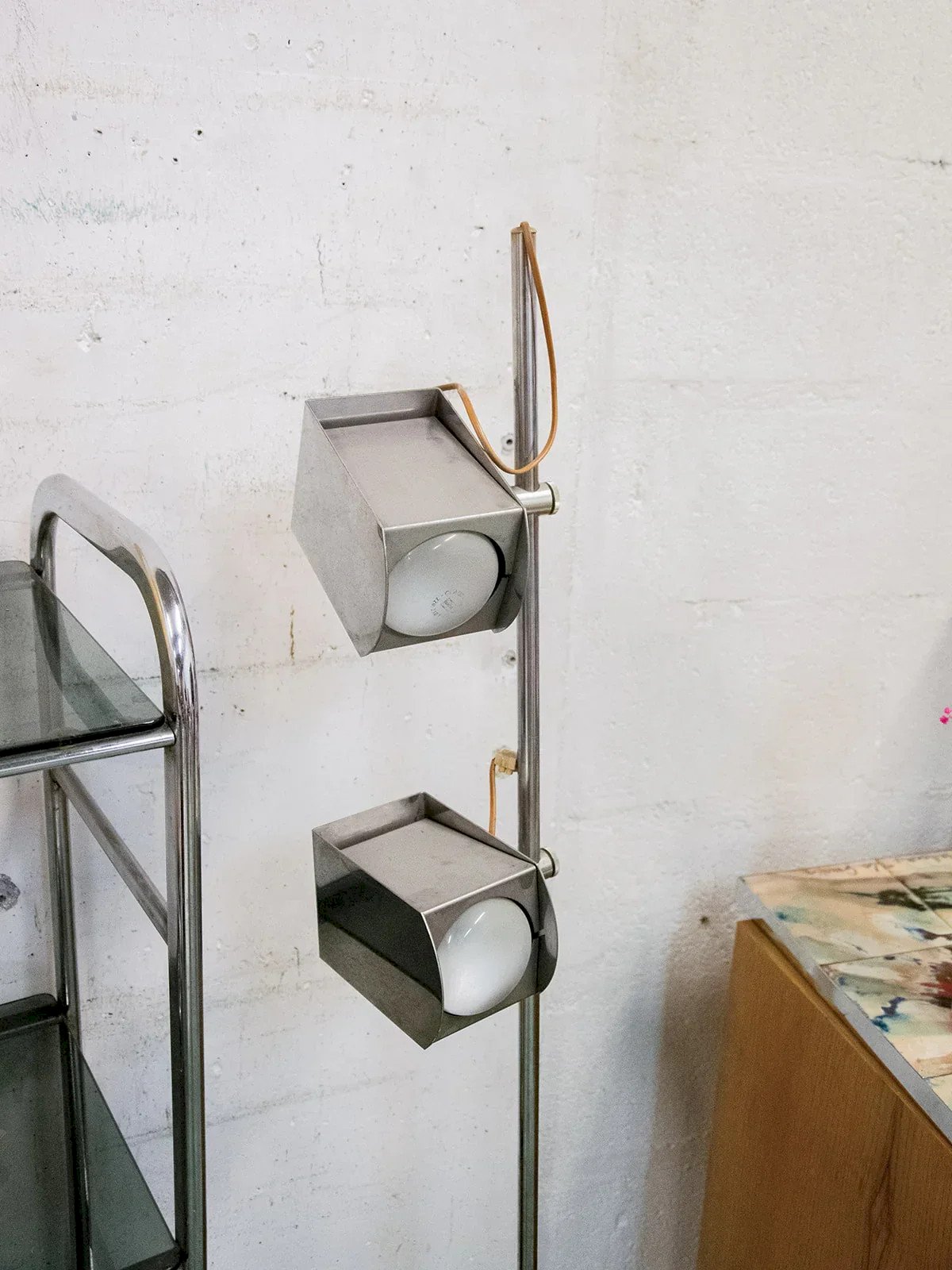Ce lampadaire chromé à deux ampoules apporte une lumière douce et chaleureuse à vos soirées. Son design minimaliste et sa finition brillante en font une pièce forte, à la fois discrète et élégante. Placé dans un salon ou un coin bureau, il crée une ambiance feutrée tout en affirmant une vraie personnalité dans la déco. Longueur : 10 cm Largeur : 9 cm Hauteur : 142 cm État:Occasion: Objet ayant été utilisé. Objet présentant quelques marques d'usure superficielle, ...Occasion: Objet ayant été utilisé. Objet présentant quelques marques d'usure superficielle, entièrement opérationnel et fonctionnant correctement. Il peut s'agir d'un modèle de démonstration ou d'un objet retourné en magasin après une courte période d'utilisation. les éventuelles imperfections. Marque:Debongout Type:Produit chiné Vintage:Oui Style:Contemporain