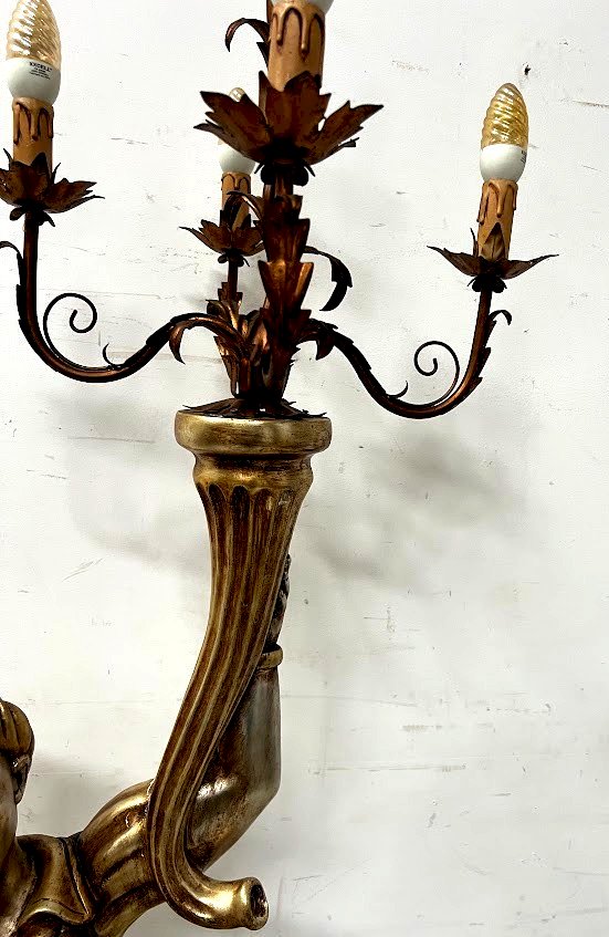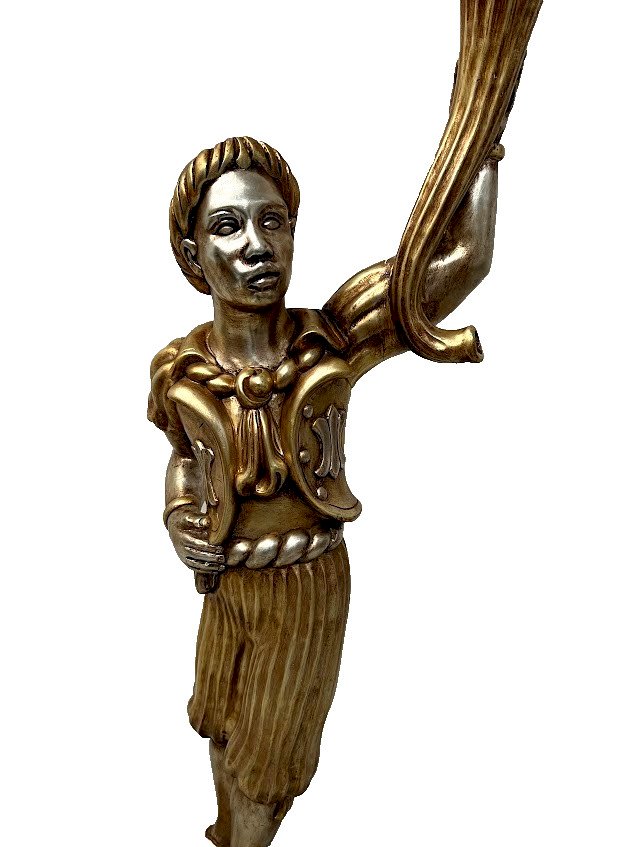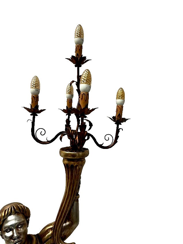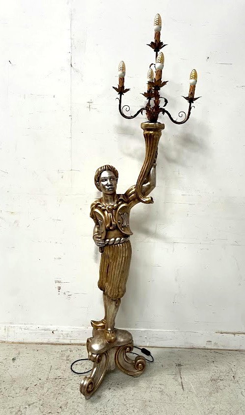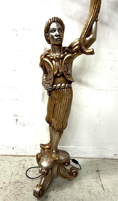 Lampadaire a décor d'un nubien en bois sculpté Nubien en bois sculpté doré et argenté Piétement tripode a enroulement Corne d'abondance surmonté d'un chandelier a cinq bras de lumière en métal Bon état Dimension H 180 x L 40 x 40 cm XX siècle État:OccasionObjet ayant été utilisé. Objet présentant quelques marques d'usure superficielle, entièrement opérationnel et fonctionnant correctement. Il peut s'agir d'un modèle de démonstration ou d'un objet retourné en magasin après une courte période d'utilisation. les éventuelles imperfections. Type:lampadaire