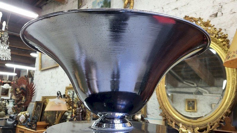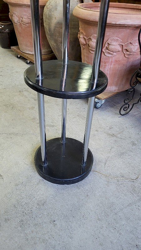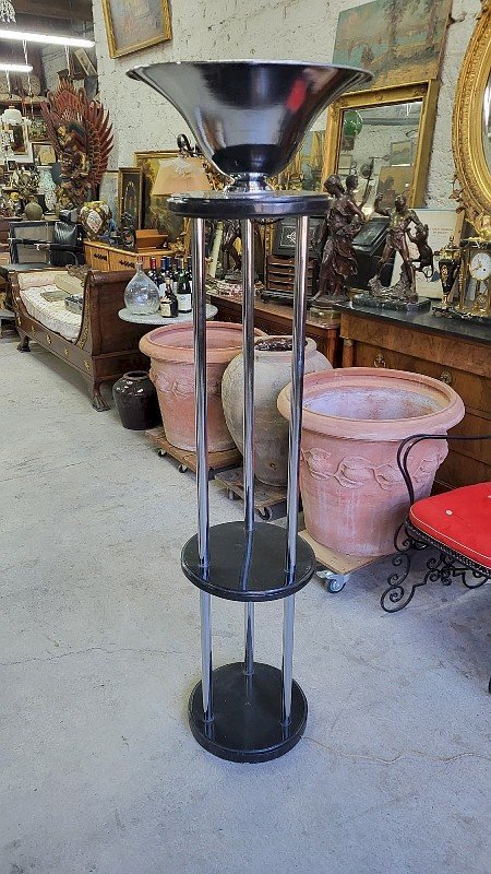 superbe lampadaire Art Déco 1930 en bois et chrome il est en bon état il y a 3 plateaux cylindriques en bois et 3 tubes chromés ainsi que l'abat jour chromé il y a quelques légères traces d'oxydation sur le chromes mais rien de bien méchant c'est juste un peu visible il fonctionne avec 2 ampoules dans l'abat jour il y a un interrupteur à pied sur le fil il devait y avoir un interrupteur sous l'abat jour (voir photo) car il y a un trou il mesure 169 cm de haut sur 50 cm de diamètre pour l'abat jour Je reste à votre disposition pour toutes vos questions ou par email ou par téléphone : . pour d'autres photos plus grandes envoyez moi votre email. pour une livraison entre le sud et paris demandez le prix a JM TRANSPORTS au 06.12.25.48.48. pour une autre destination contactez moi. Type:LAMPADAIRE Période:Art Déco Matière:BOIS ET CHROME