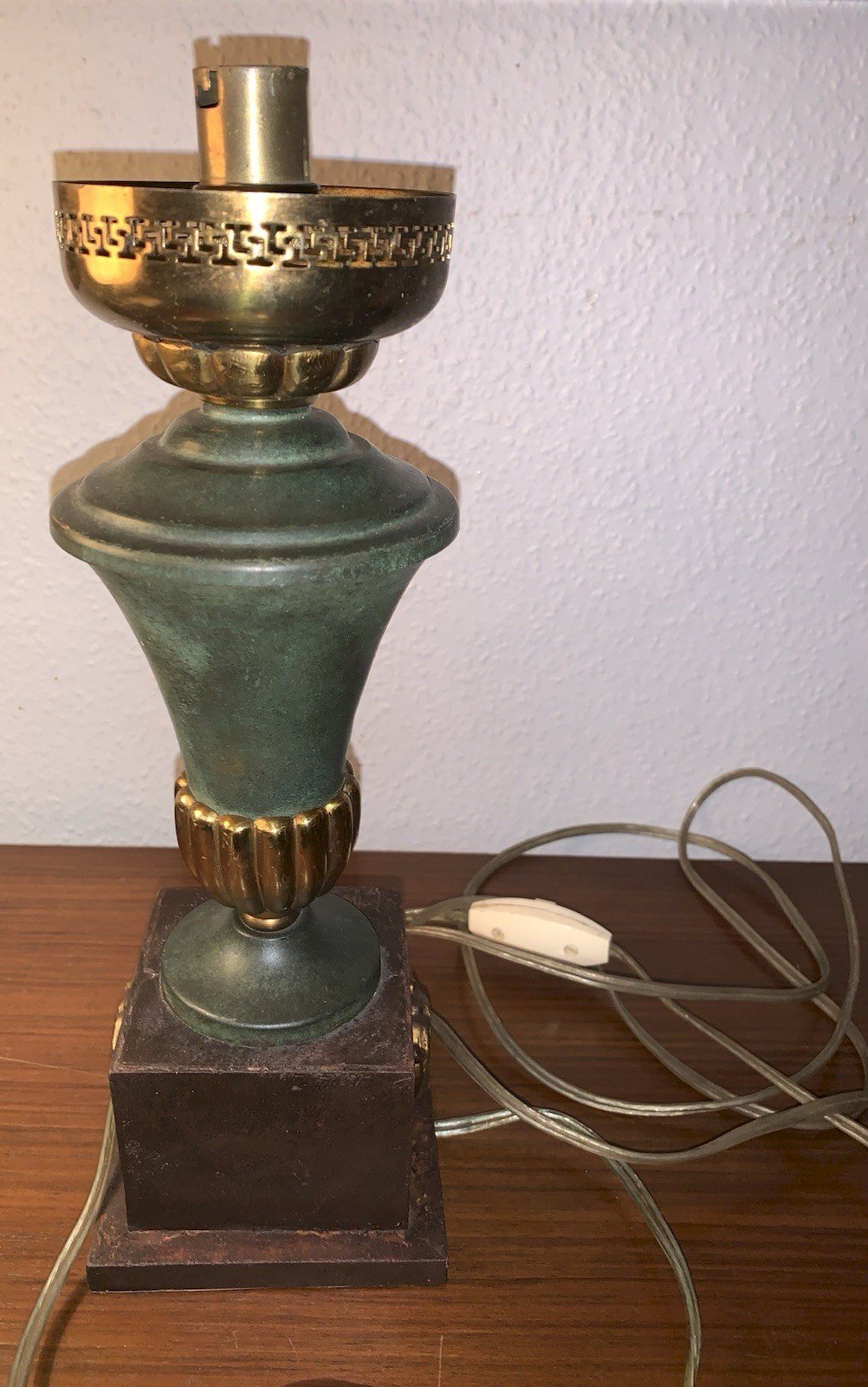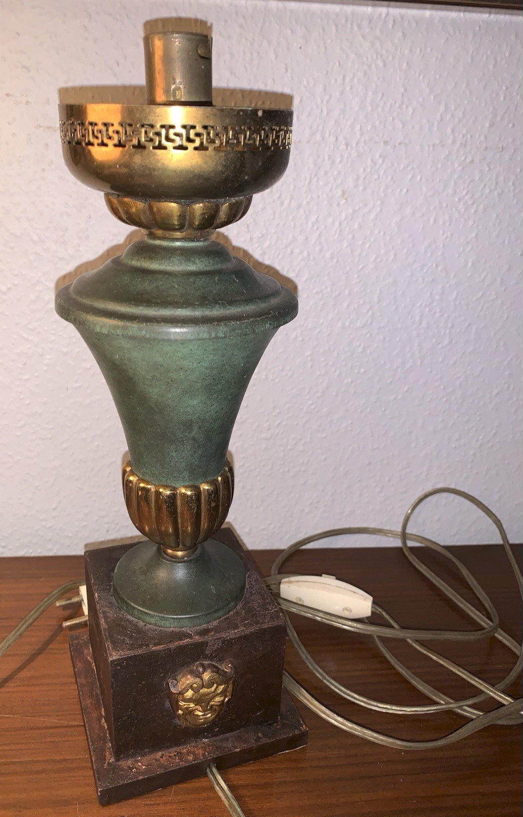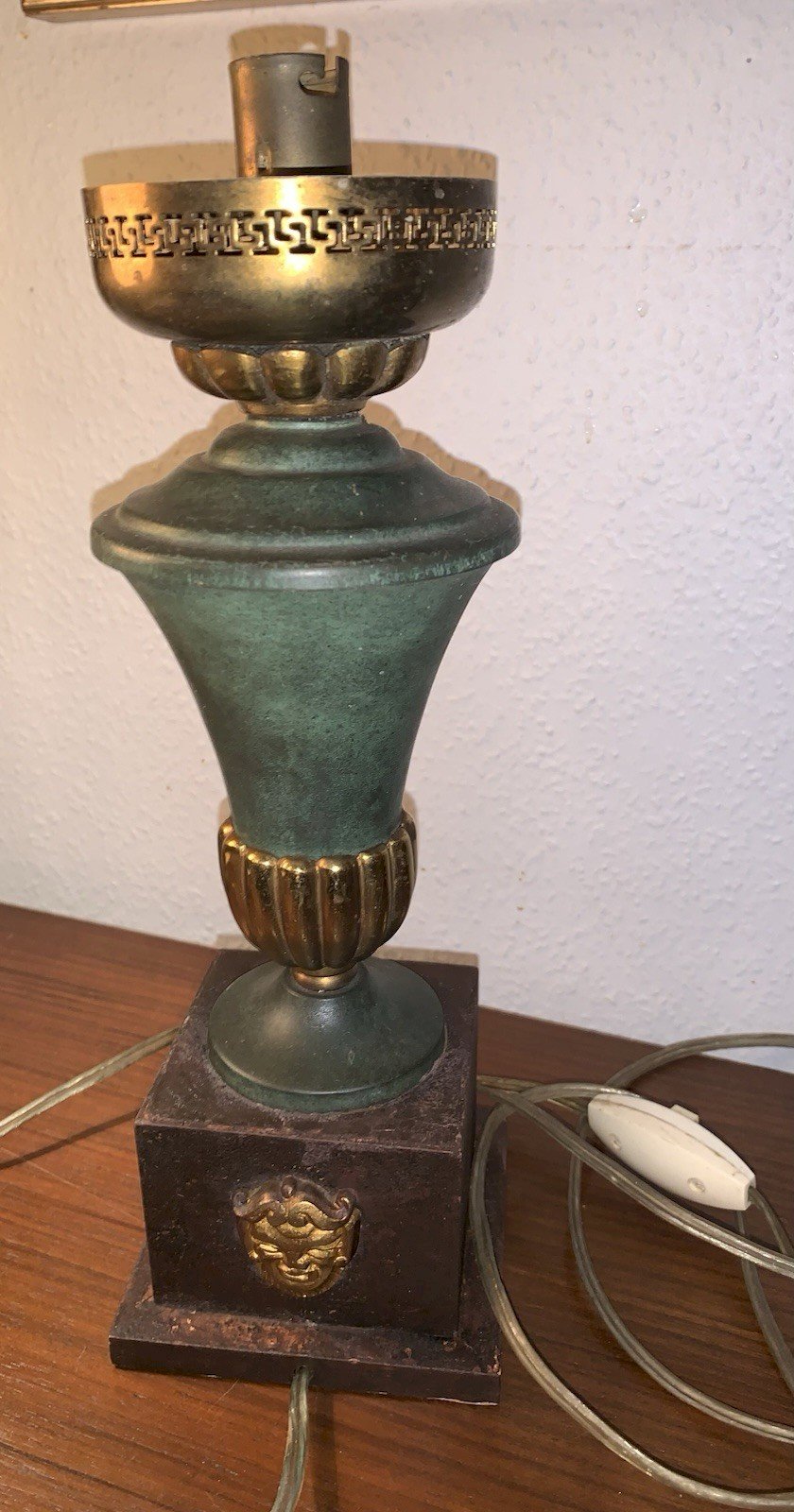 Lampe de style Empire Circa 1940-1950 Fut en métal laqué vert Socle en bois gainé de papier  Décor de mascarons à tête de lion Lucien Gau, Maison Charles...A déterminer Elle fonctionne, électricité refaite, bel état Hauteur:30cm Largeur au socle:10cm Type:Lampe de table Période:Design du XXème Sous-type:Bureau Couleur dominante:Vert Matière:Métal Style:1940-1960 Type d'éclairage:Standard Puissance maxi (Watts):60 Caractéristiques:style empire