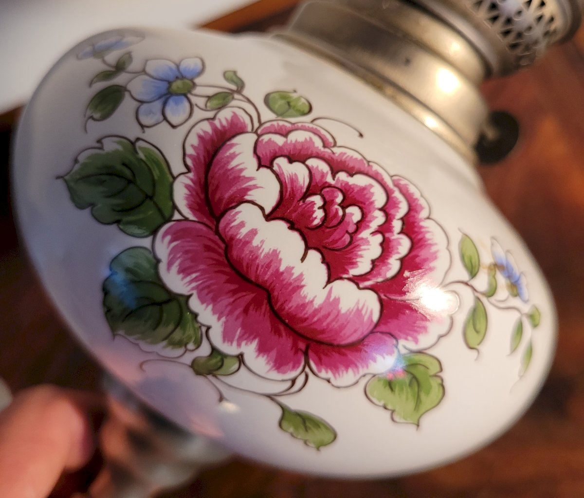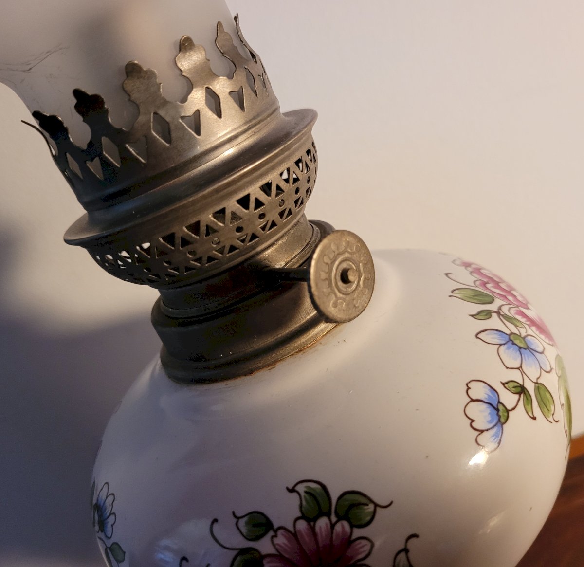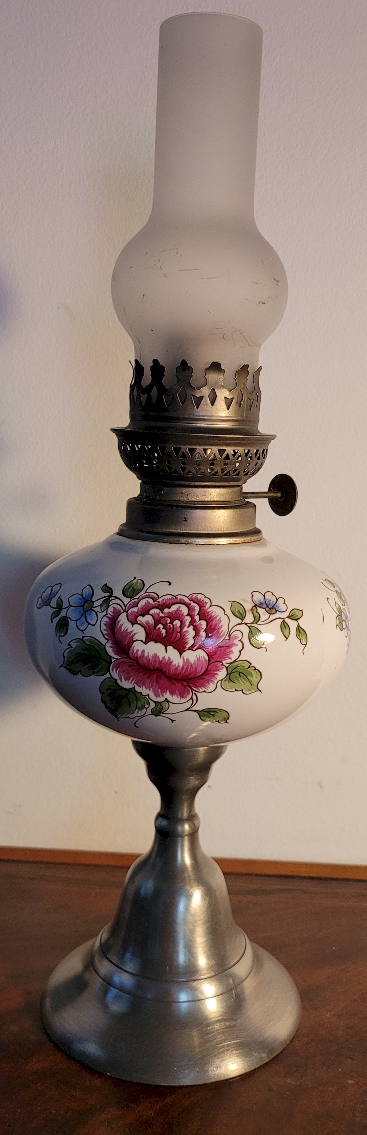 Lampe à pétrole céramique & étain 1950's Vintage Blanc/Multicolore Céramique/Métal Floral,Végétal