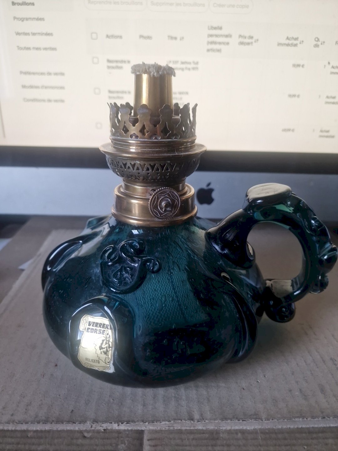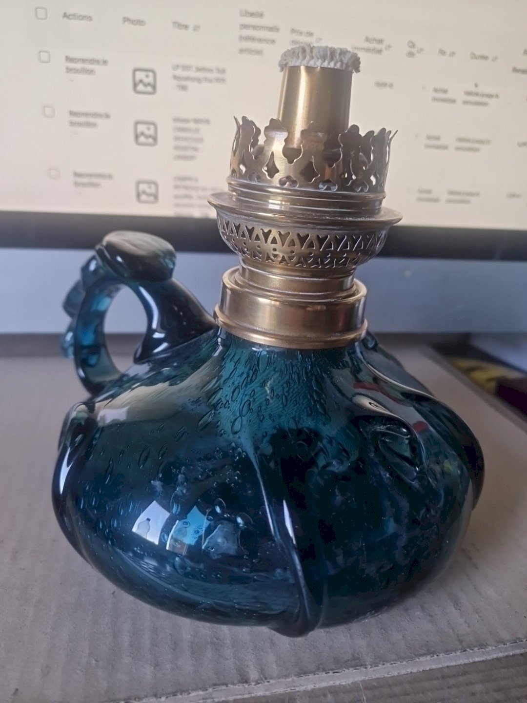 LAMPE à PETROLE en verre soufflé , bullé, verrerie corse Felicito _ TBE