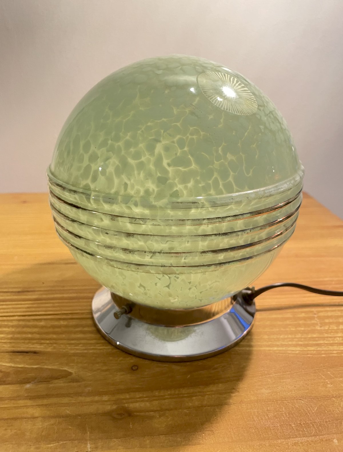 Lampe à poser Art déco avec globe en verre de Clichy vert pâle à liseré doré passé.