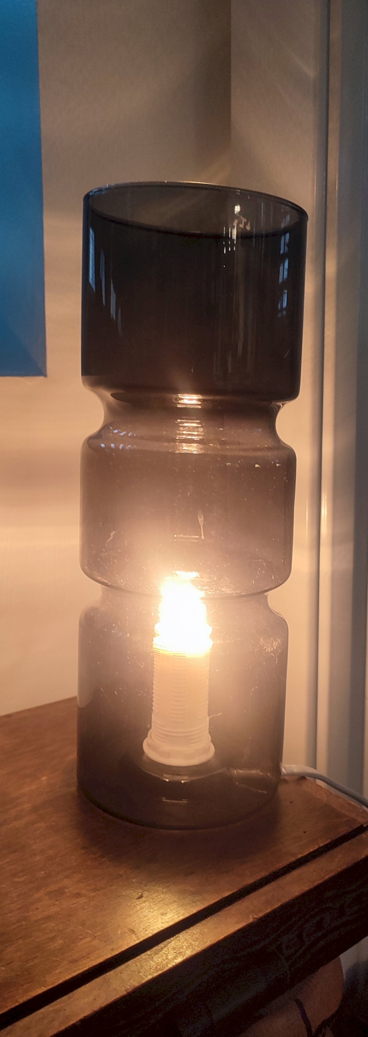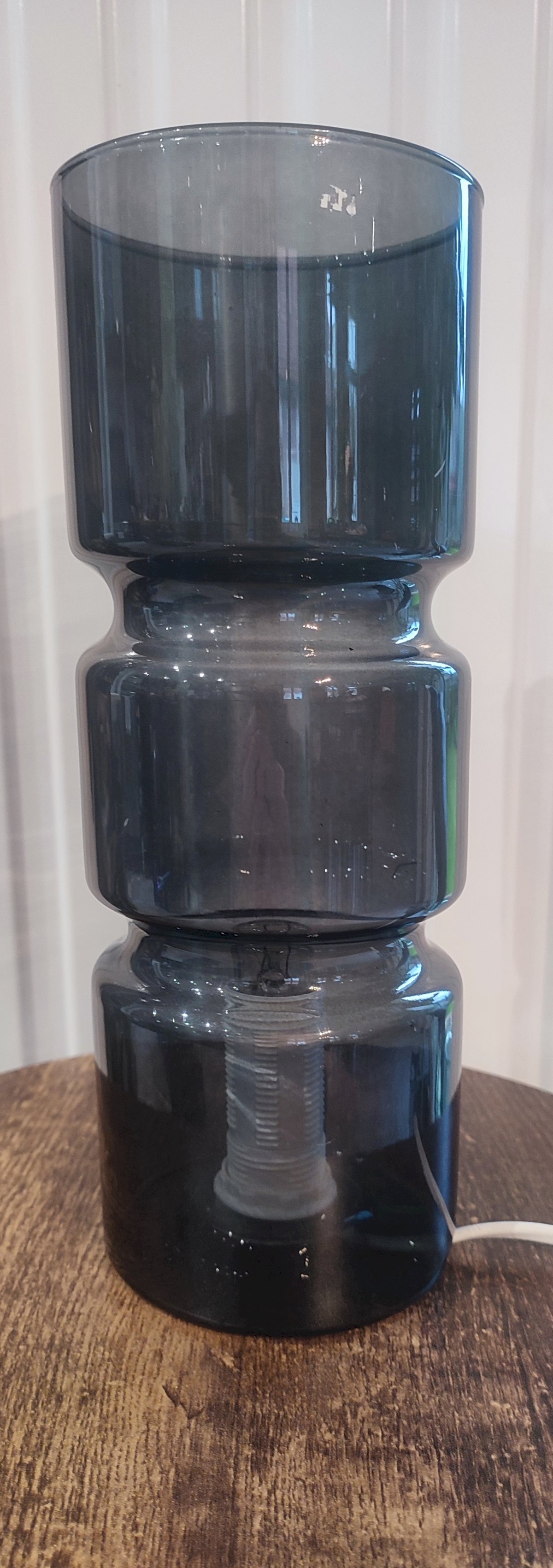 Lampe à poser style Fitz , design Space Age , en verre fumé gris légèrement bleuté . Très décorative éteinte aussi bien qu'allumée.