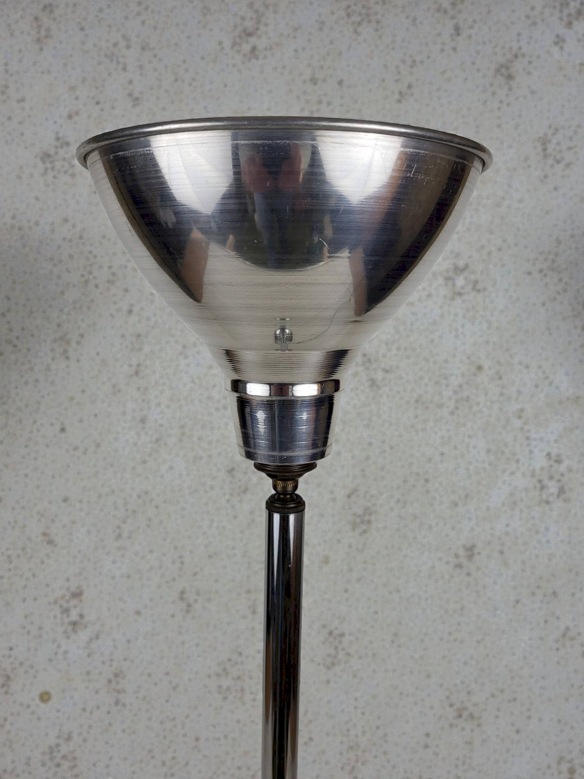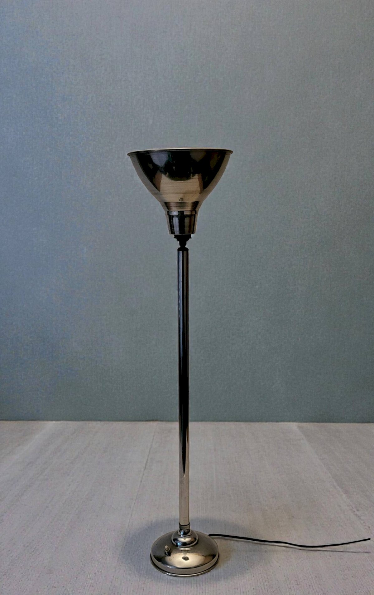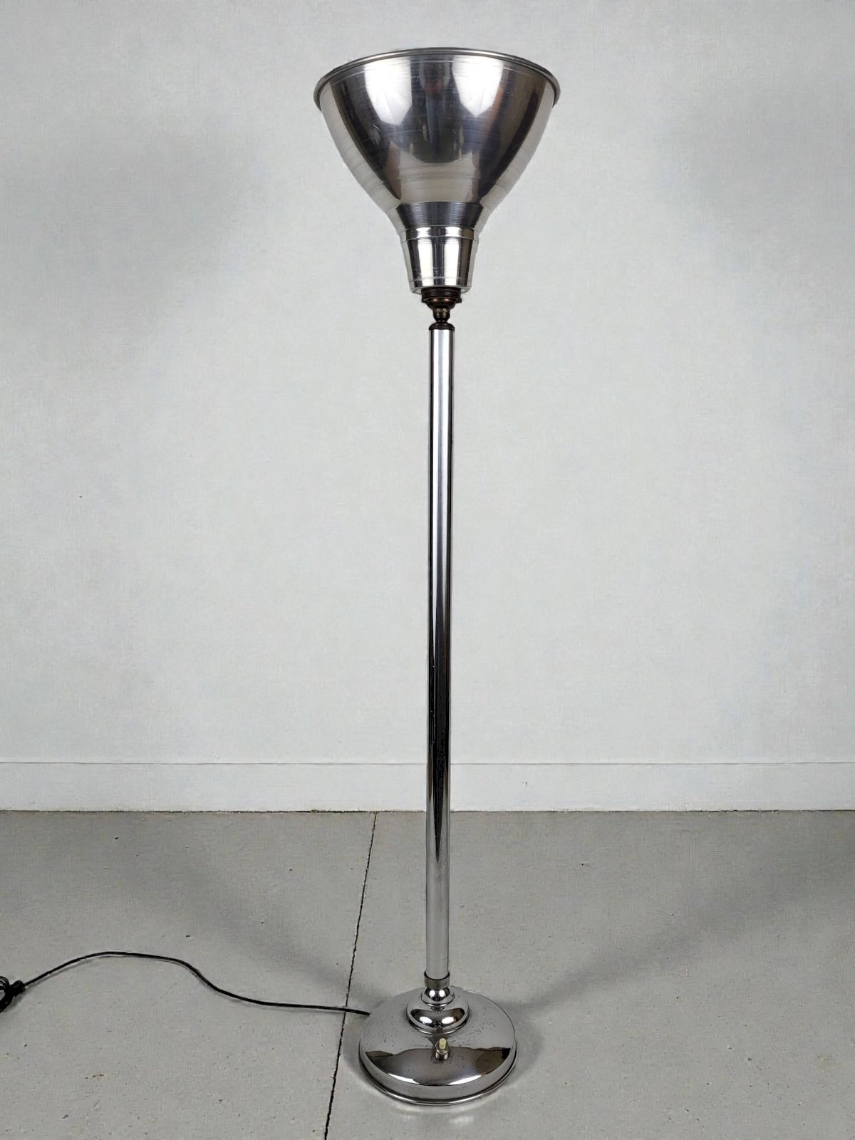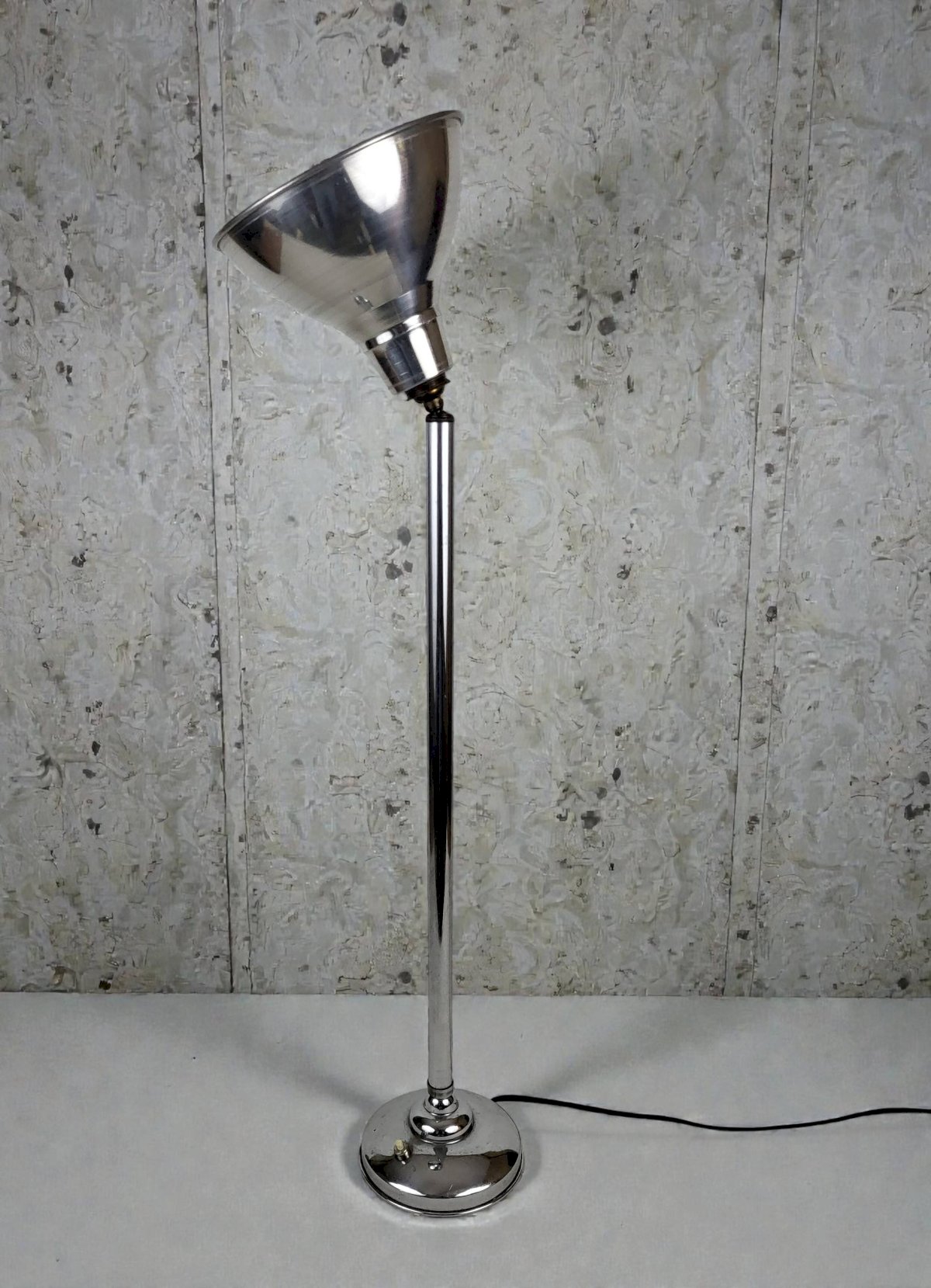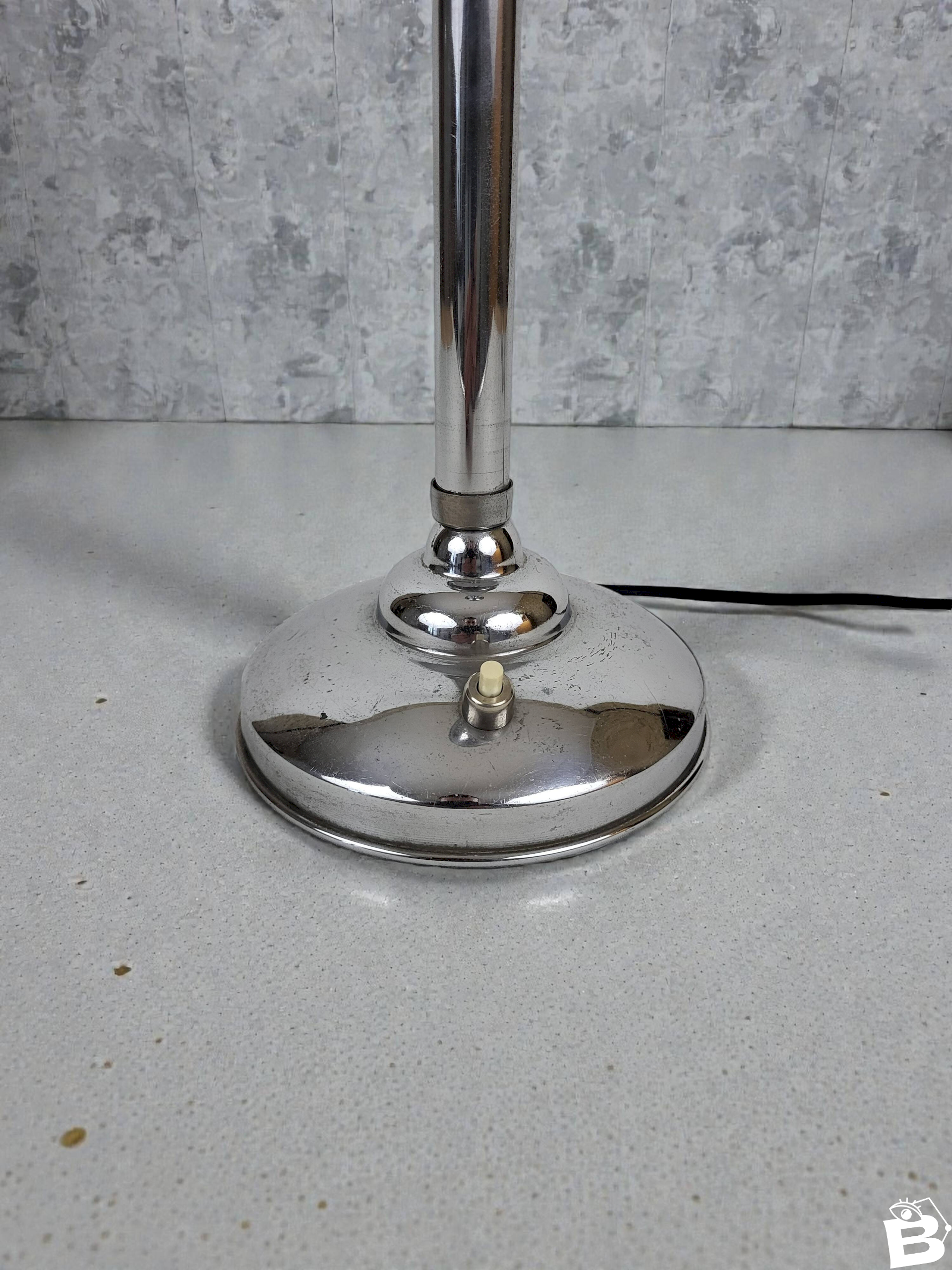 Grande lampe art déco en métal chromé des années 30.Interrupteur en métal chromé et bakélite.Electricité d'origine.Réflecteur rotatif/inclinable (le mécanisme fonctionne parfaitement.On notera traces d'usage et d'ancienneté (2 petits chocs sur le socle) hauteur 77 cm.Diamètre réflecteur 17, 5 cm.