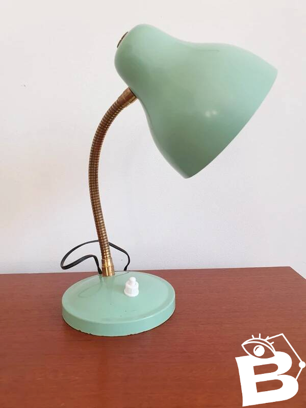Très jolie lampe cocotte en métal des années 50/60, coloris vert céladon.Tige flexible en laiton.Peut être fixée au mur.Très bon état général, électricité d’origine mais fonctionnelle.Hauteur: 30 environ.Diamètre du globe: 11.5 cm.Diamètre du socle: 11 cm.Ampoule à culot fournie.A noter que la prise n'est plus aux normes !.