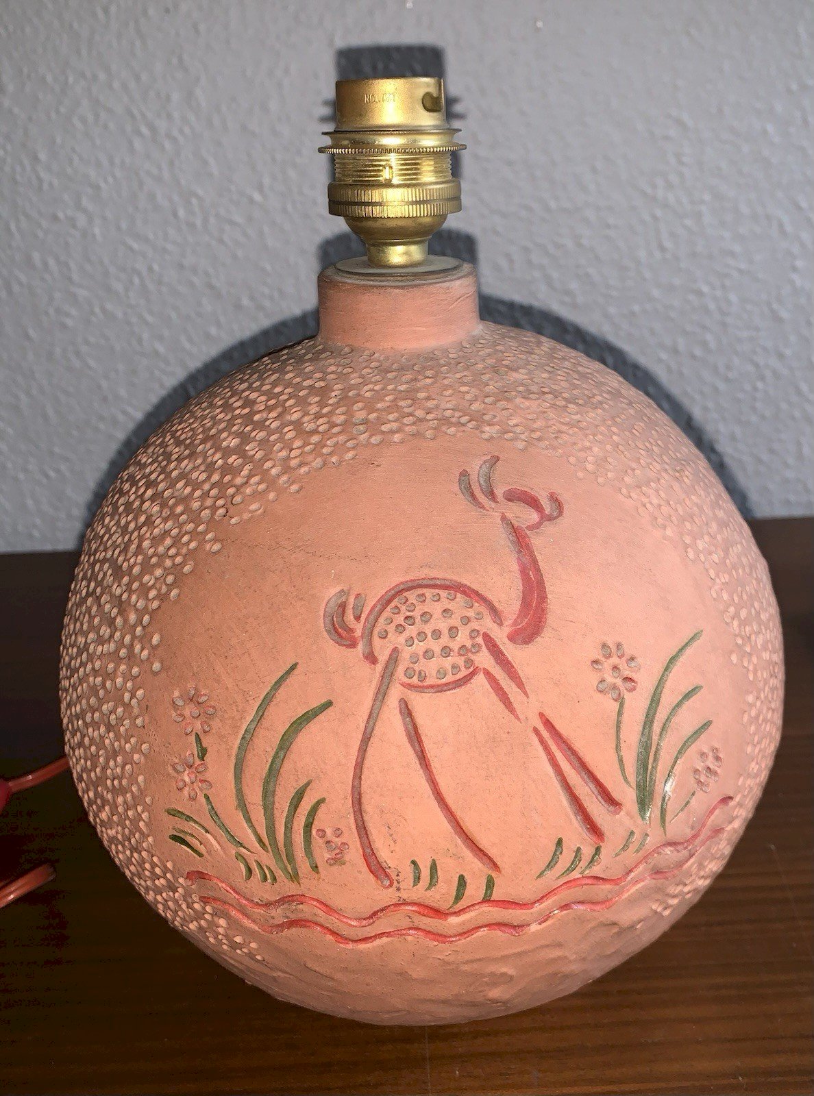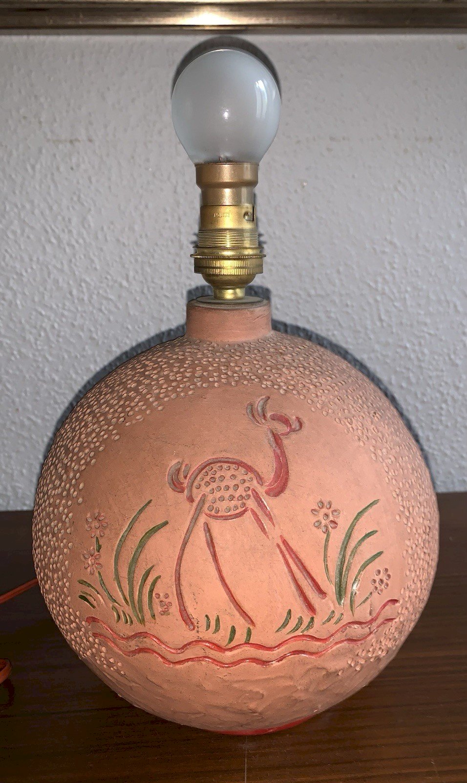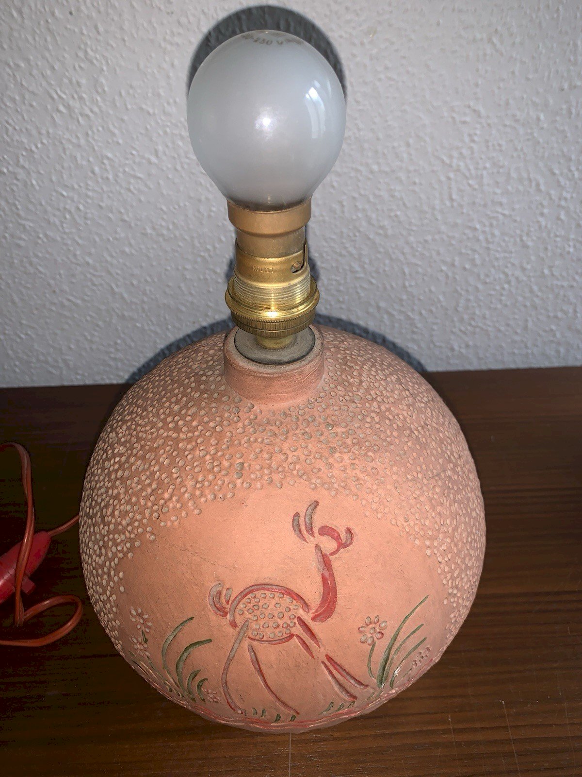 Lampe vintage Terre cuite brute à décor scarifié animalier Un monogramme sur le dessous Pied de lampe en très bel état, l'abat jour n'est pas à vendre Hauteur totale:20cm Diamètre du pied de lampe:18,5cm Type:Lampe de table Période:Design du XXème Sous-type:Intérieure Matière:Céramique Style:1940-1960 Type d'éclairage:Standard Puissance maxi (Watts):60 Caractéristiques:A baïonnette