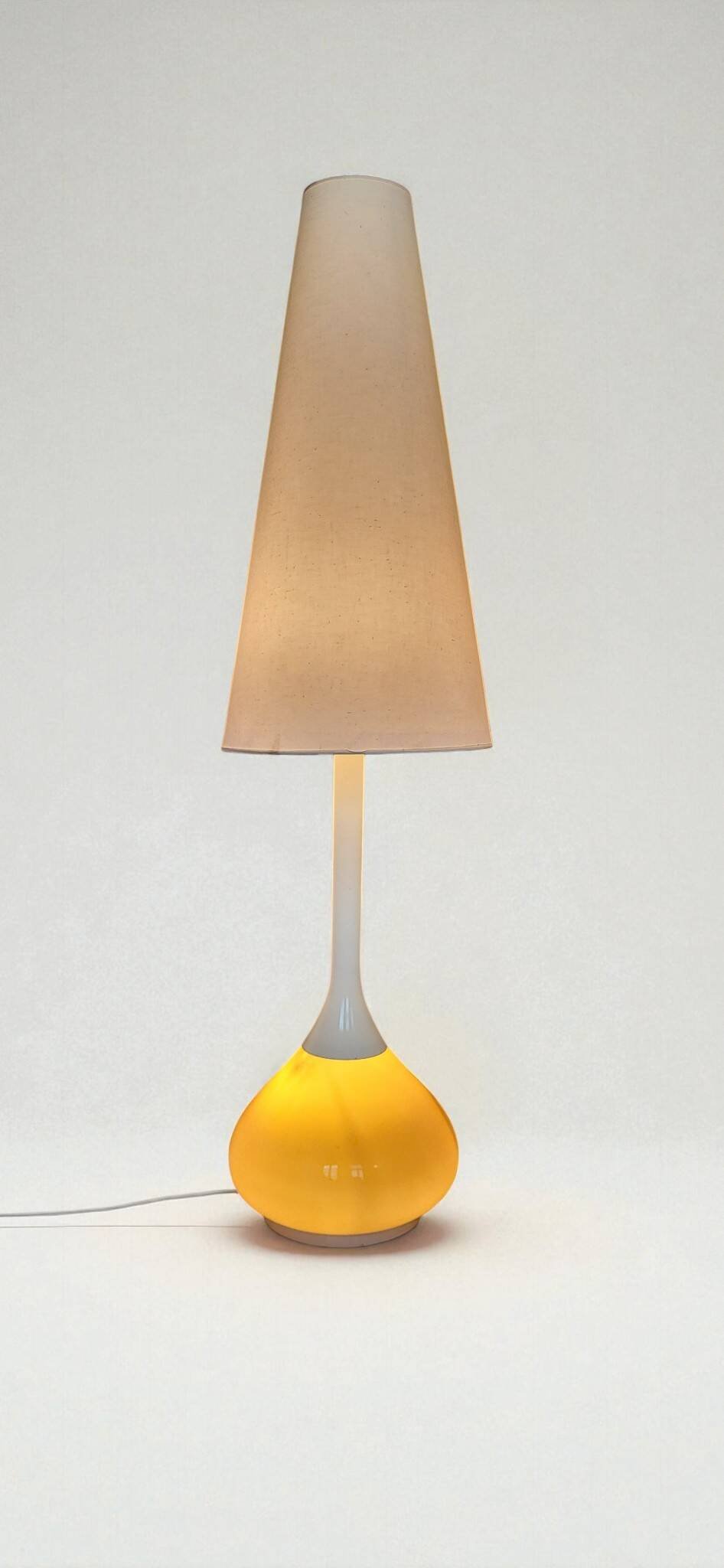 Lampe années 70 en verre orange et structure en métal laqué blanc.Un interrupteur principal et un interrupteur secondaire sur la douille permettant d'allumer la partie haute.Elle est en bon état.