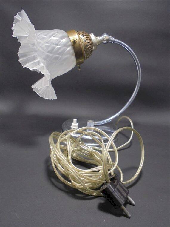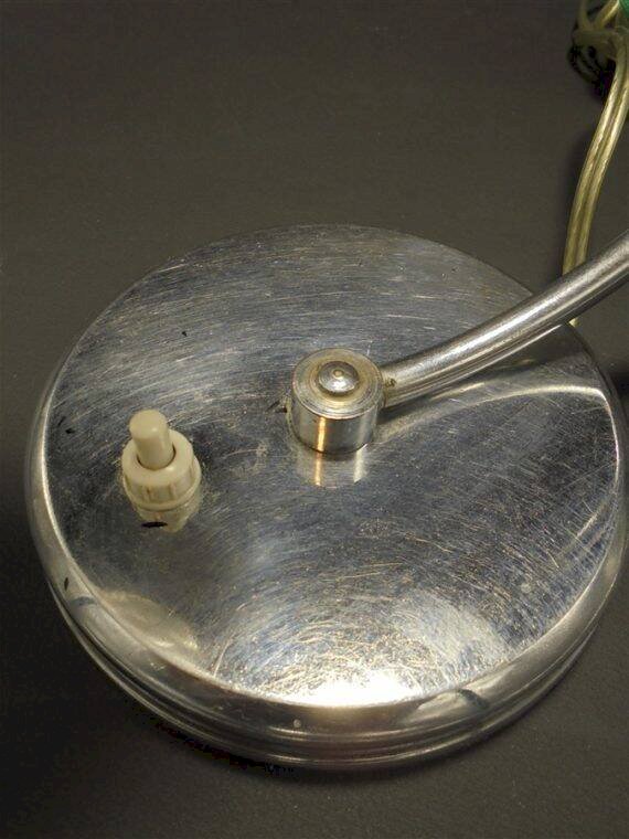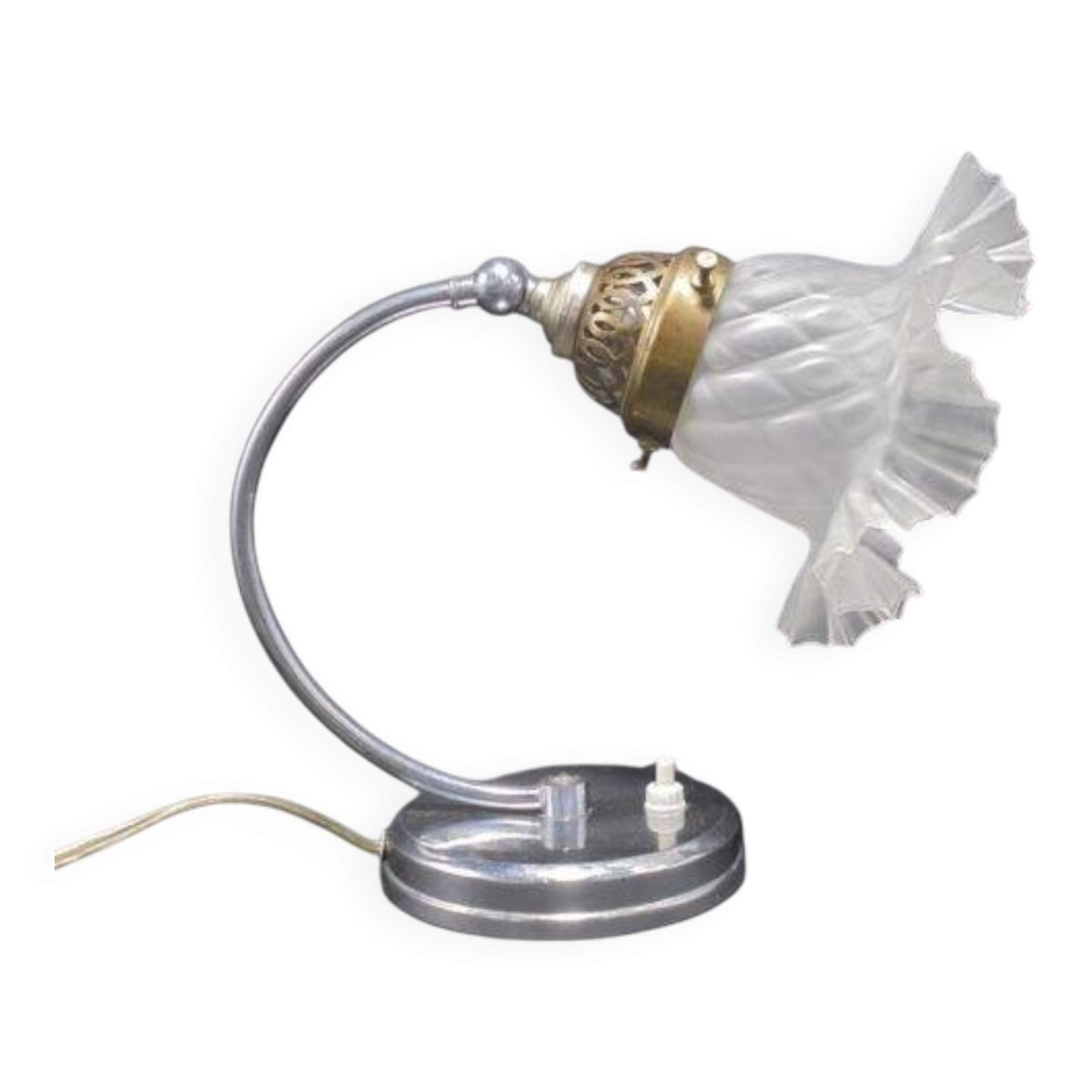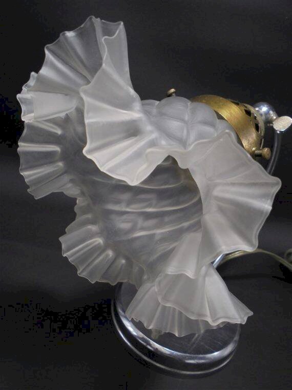 Jolie tulipe en verre dépoli sur un pied chromé.Le chrome est rayé, la tulipe porte de minuscules éclats quasiment invisibles.Il est possible de la placer en applique murale.Douille b22.Hauteur: 22 cm.Largeur: 16 cm.Profondeur: 25 cm.Poids: 570 g.