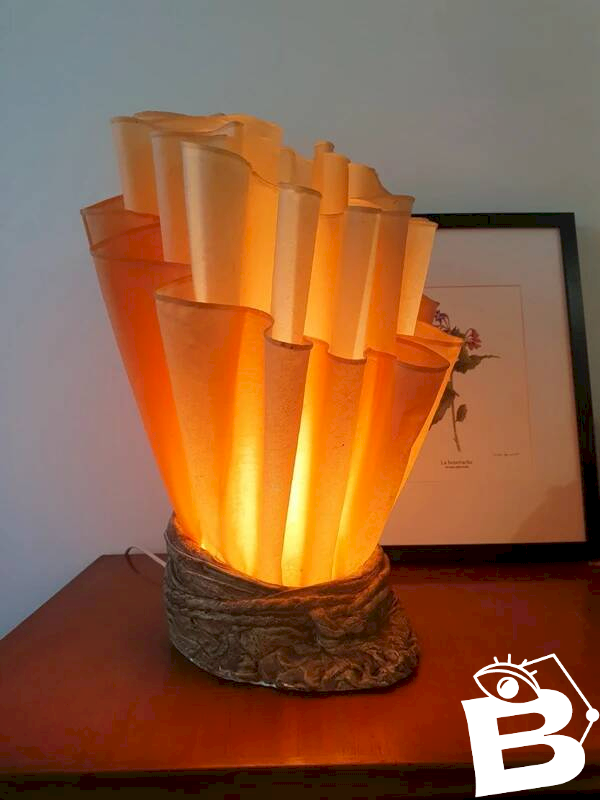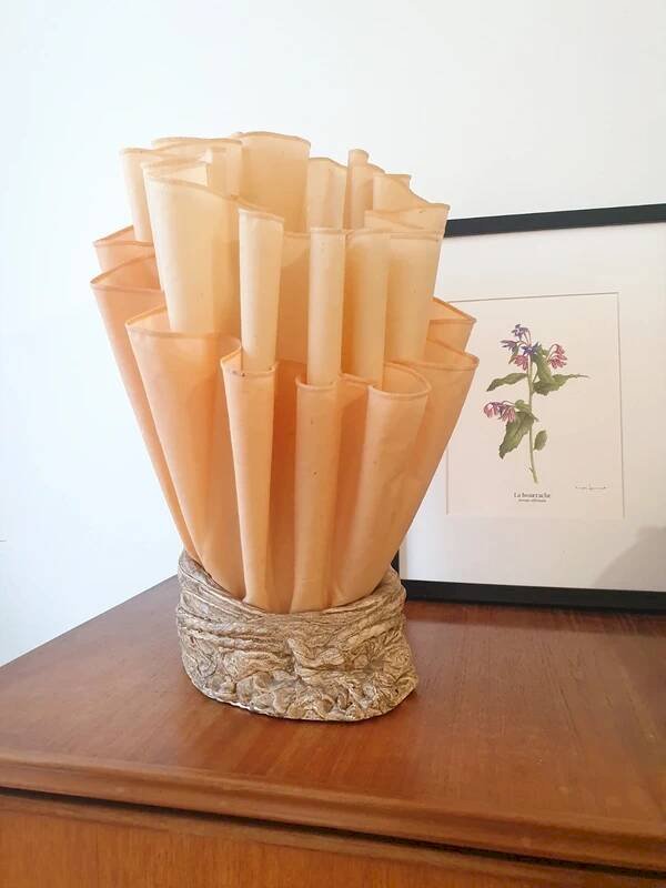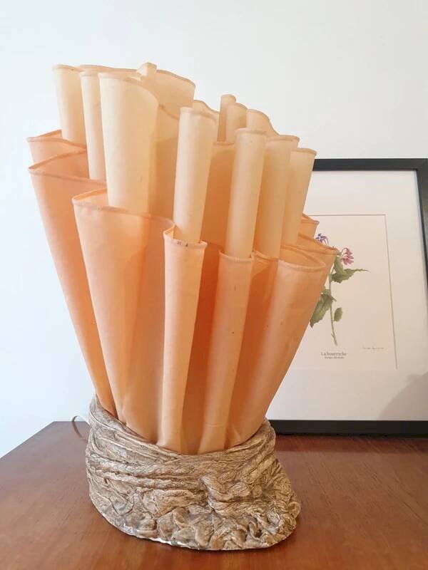 Très jolie lampe drapée ou corolle, des années 70.Superbe abat jour drapé en tissu enduit, 2 tons, rose pale-beige / abricot, sur socle en résine.Électricité d’origine fonctionnelle.Feutrine de protection sous le socle, avec étiquette de la marque.Fabriqué en France.Bon état vintage, usure générale liée à l'âge, un peu de poussière pour les plis.Hauteur 47 cm.