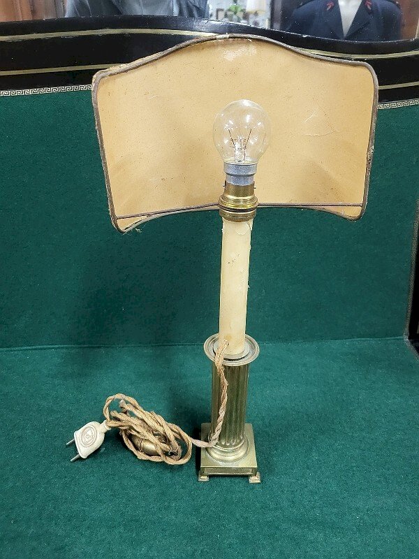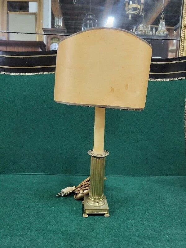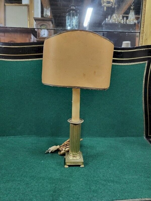 jolie lampe en bronze colonne elle est en bon état elle a juste l'abat jour qui est tâché et un peu abimé sur les bords il y a un vis sous le pied qui n'est pas d'origine elle mesure 41.5 cm de haut sur 21.5 cm de large au niveau de l'abat jour le pied mesure 6.5 x 6.5  Type:LAMPE Matière:Bronze