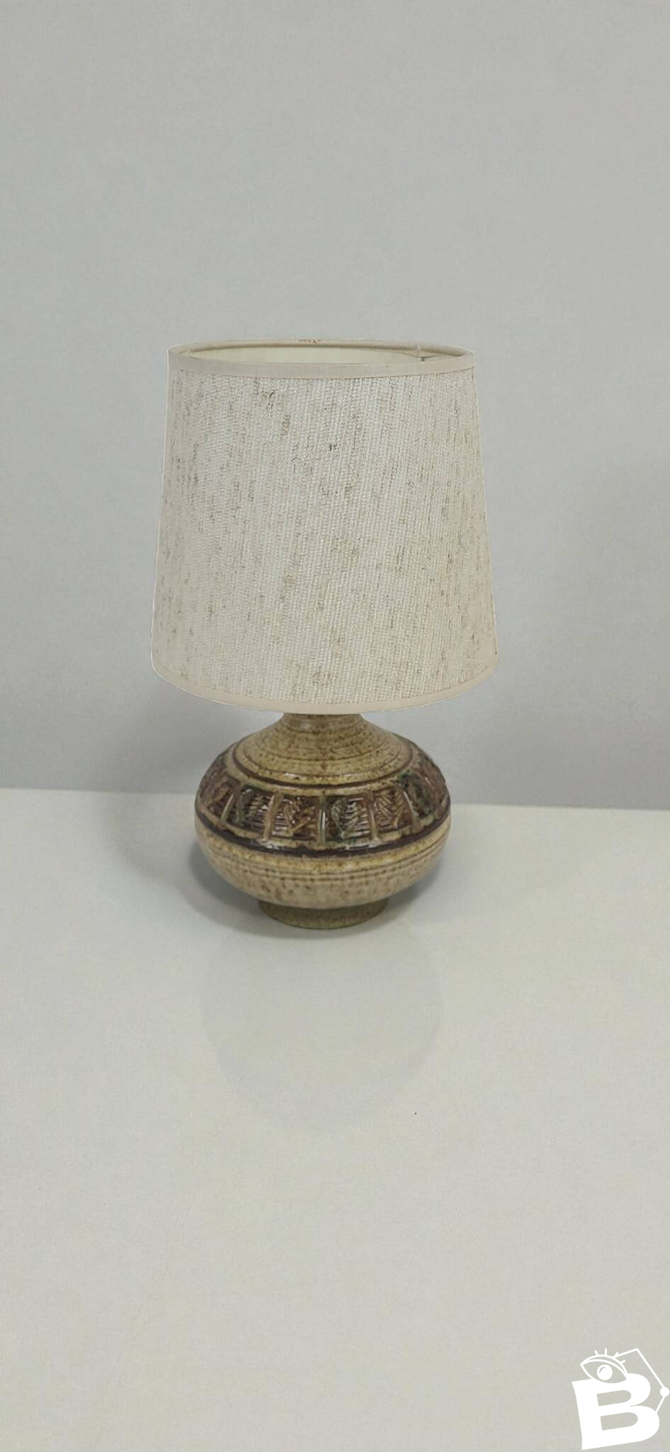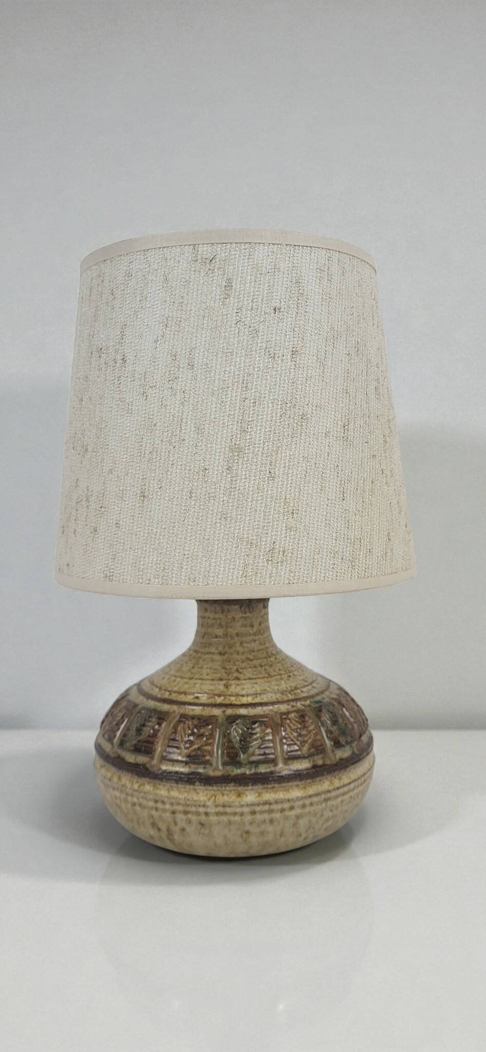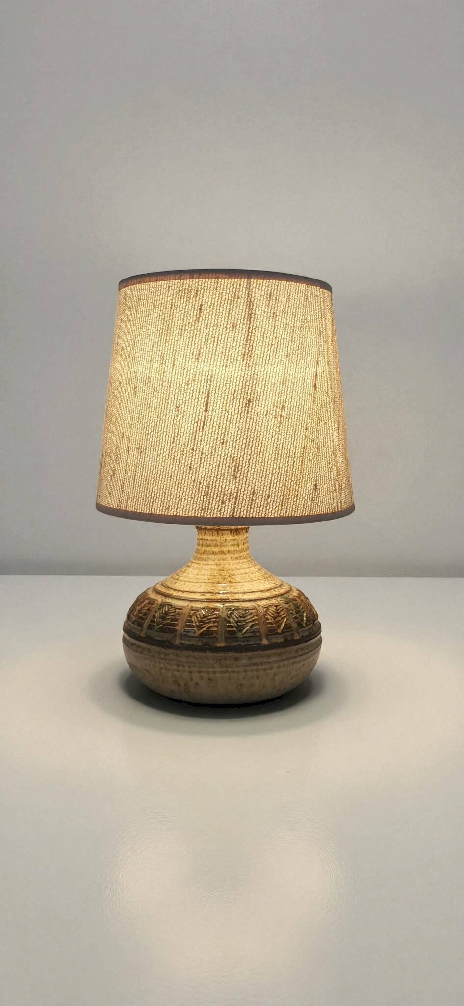 Lampes en céramique par marcel giraud - vallauris - années 1960.A la fois brute et élégante, elle peut se fondre aussi bien dans une ambiance campagne chic que dans un intérieur raffiné, lampe de table ou de chevet / émaillé et décoré de motifs géométriques.Hauteur totale 31 cm / diamètre abat jour 20 cm / Diamètre pied 16 cm.Signée.Marcel giraud, né en 1927 à vallauris, dans le quartier des mauruches, a été attiré très jeune par le monde de la poterie.À l'âge de 13 ans, il quitte l'école pour suivre un apprentissage rigoureux de quatre ans chez le tourneur blaise rubino.Afin de maîtriser la technique traditionnelle de la cuisson au four à bois, il travaille de 1944 à 1946 chez tiola, une entreprise spécialisée dans la construction de ces fours.Entre 1956 et 1960, marcel giraud perfectionne ses compétences de tourneur en travaillant avec divers céramistes.En 1960, il ouvre son propre atelier rue françois donnet, où il produit principalement de la céramique culinaire.En 1975, il retourne dans sa maison natale et reprend la peinture, une passion de longue date, tout en s'initiant à la sculpture sur pierre et sur métal.Ces nouvelles disciplines dynamisent sa créativité, et il se tourne vers une production céramique plus sculpturale.En 1990, bien que l'heure de la retraite ait sonné, marcel giraud ne cesse pas son activité créative.Après une brève pause, il reprend son travail artistique avec encore plus d'ardeur.