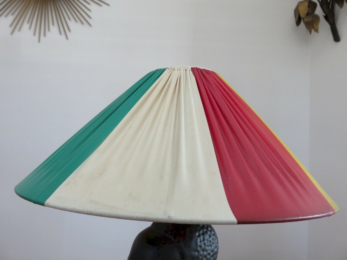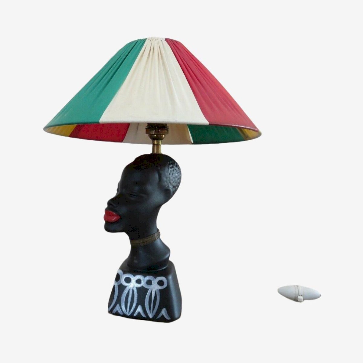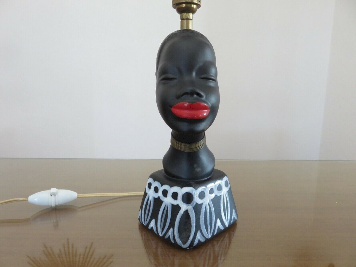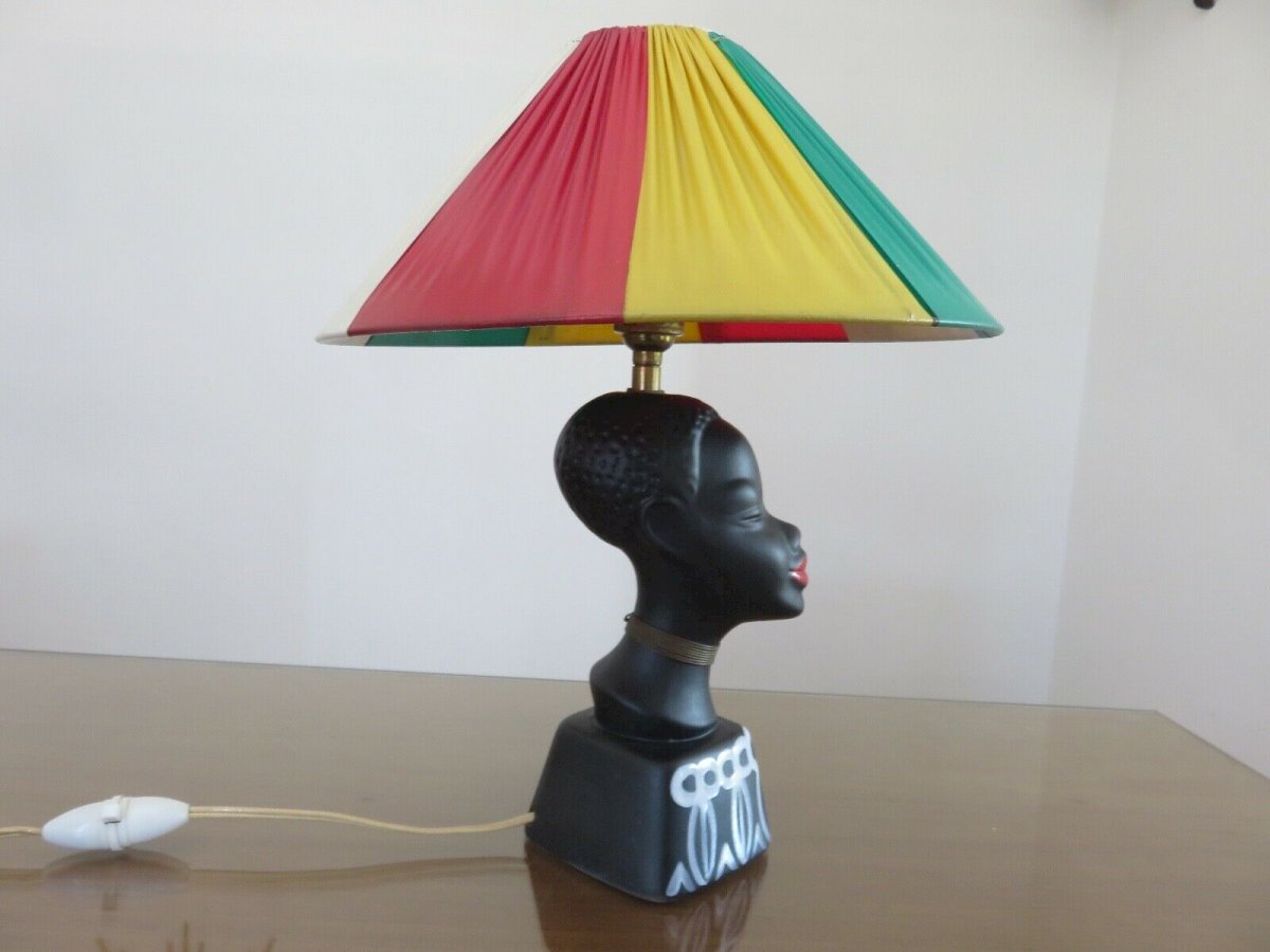 LAMPE EN CERAMIQUE NOIR MAT. " FEMME AFRICAINE "ANNEES 50 60 HAUTEUR AVEC ABAT JOUR 36 CM HAUTEUR SANS ABAT JOUR 27 CM SOCLE 9 CM X 9,5 CM NI CHOC, NI FELE, NI EGRENURE COLLIER EN FILS DE LAITONDOUILLE A BAIONNETTE B22 ABAT JOUR EN LAMELLES PLASTIQUES MULTICOLORES EN ETAT MOYEN PARFAIT ETAT DE FONCTIONNEMENT ENVOI EN EMBALLAGE TRES SOIGNE.000