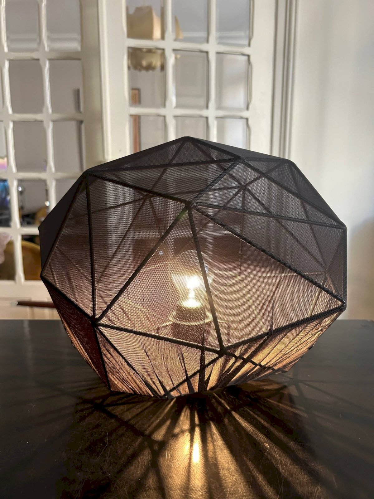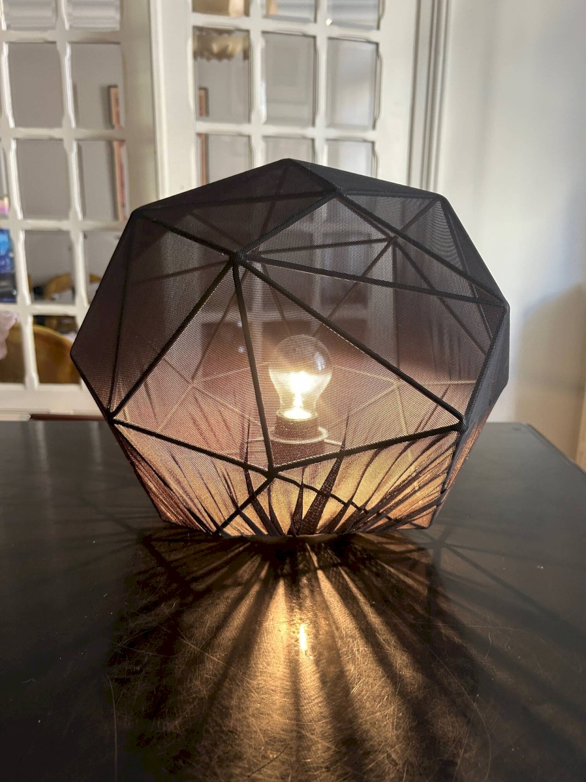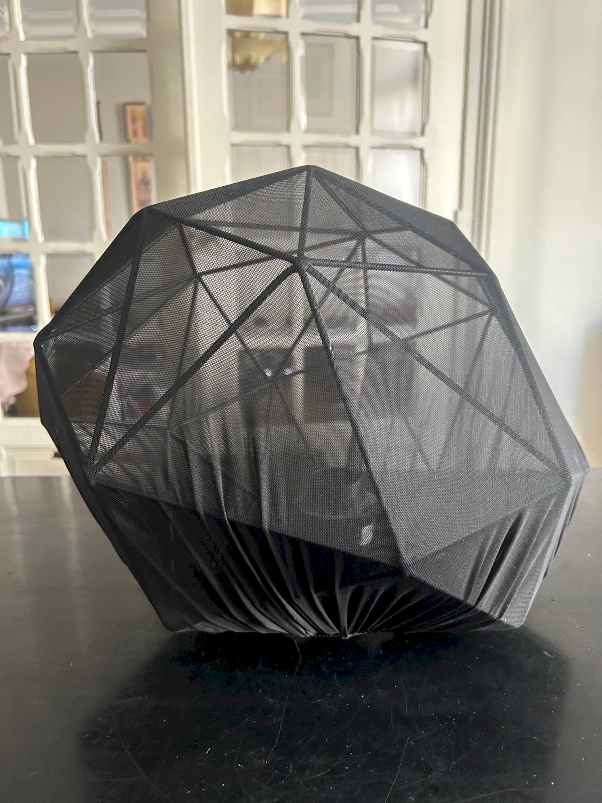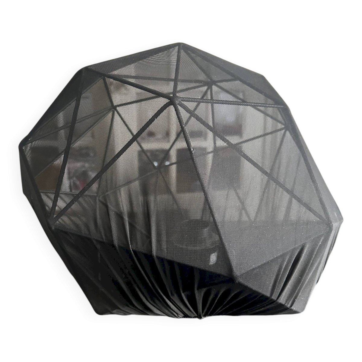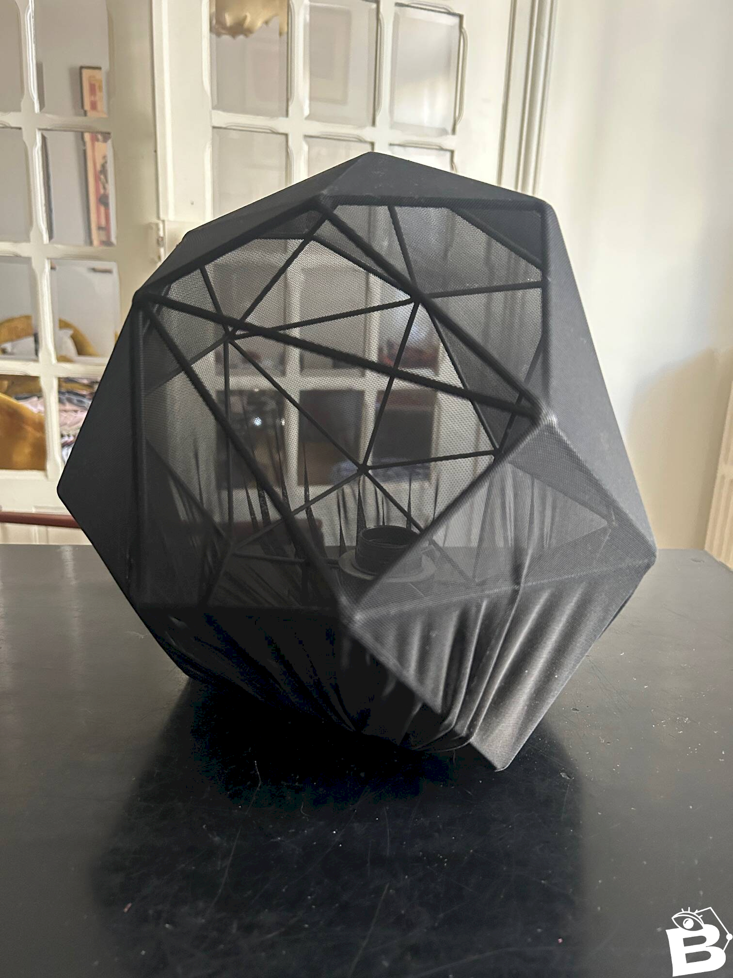 Lampe à poser Aluminor, structure métal recouverte de tulle noir, années 90.