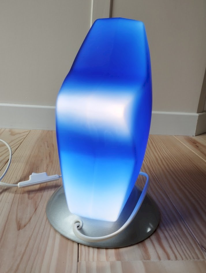 Lampe décorative en forme d’étoile, en verre opalin bleu posé sur une base en métal argenté.