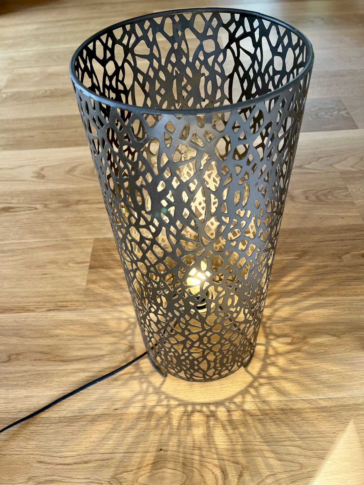 Belle lampe en métal ajouré à poser. Parfait état. Hauteur : 52 cms, diamètre : 20 cms.