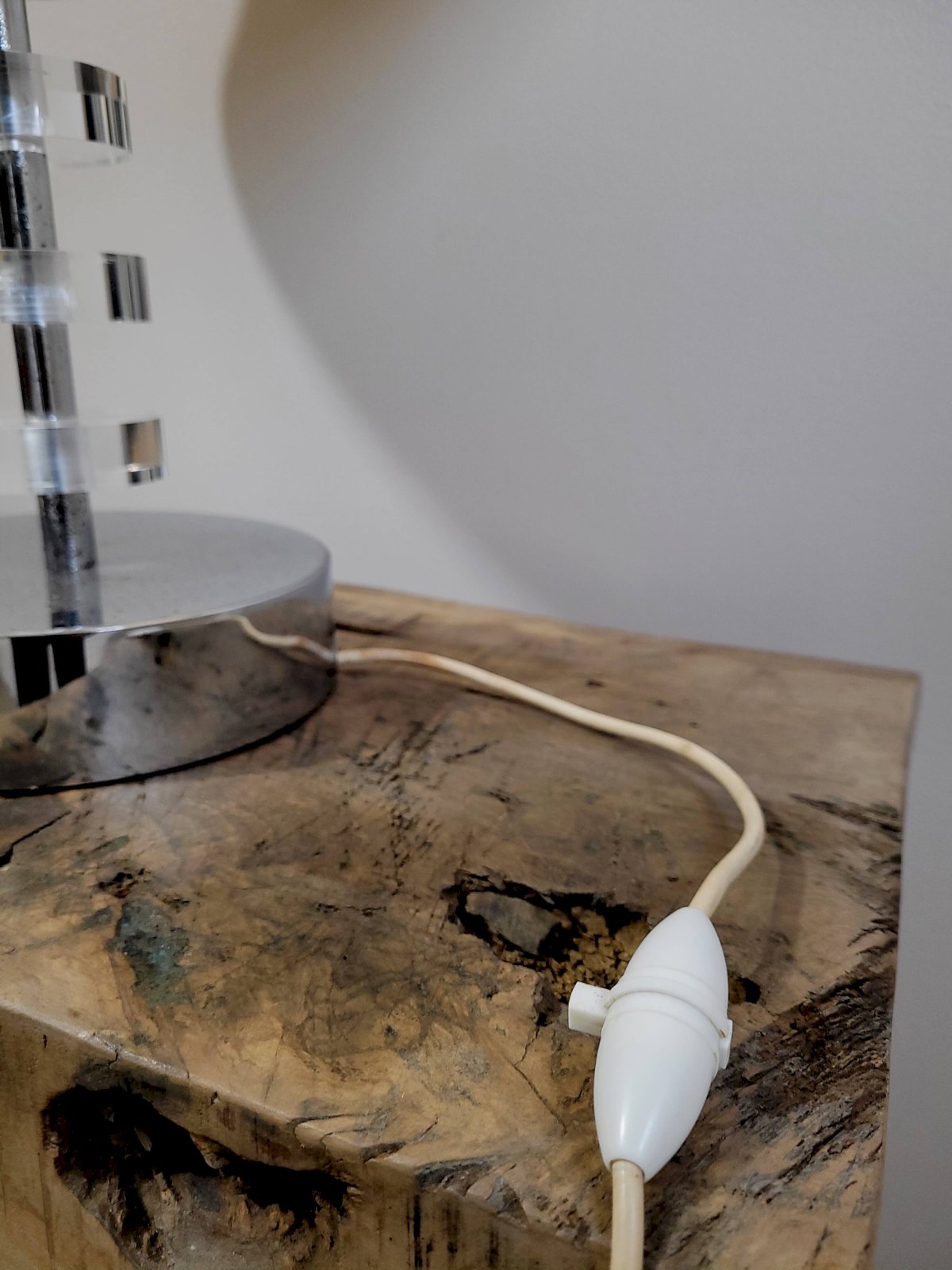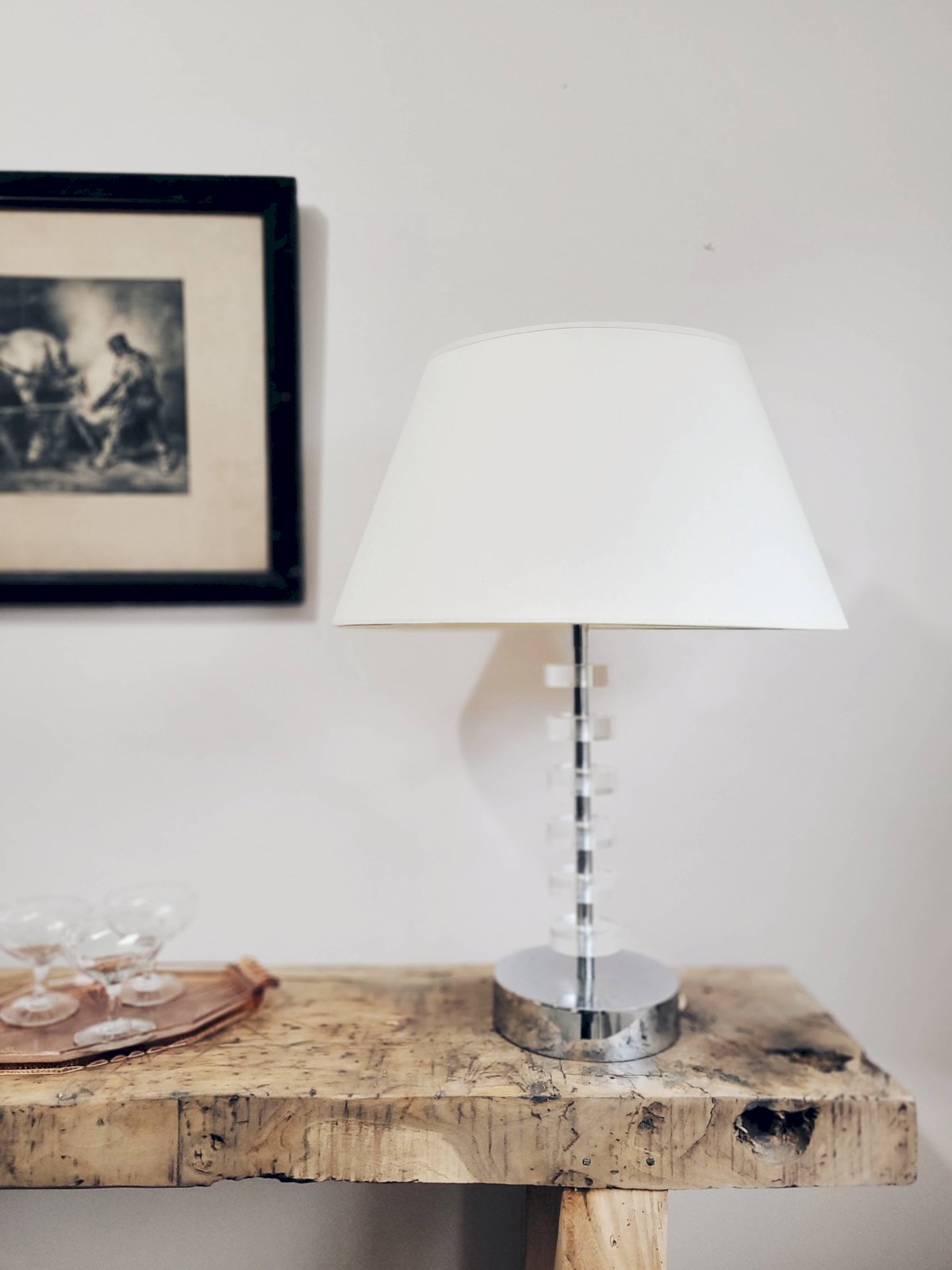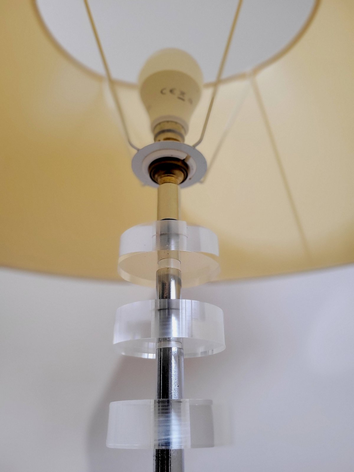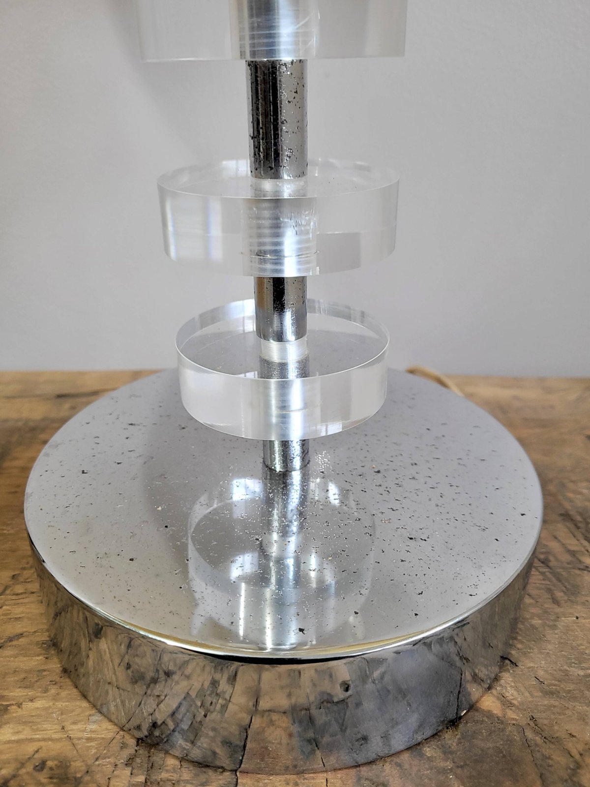 Très belle lampe de la première moitié du XXe siècle, de style contemporain.On apprécie le côté sculptural du pied de la lampe et la transparence des rondelles en plexiglas qui lui donnent un aspect de colonne.C'est une pièce originale et sophistiquée.En bon état général, le chrome de la base est piqué (voir photos).Douille B22 standard.