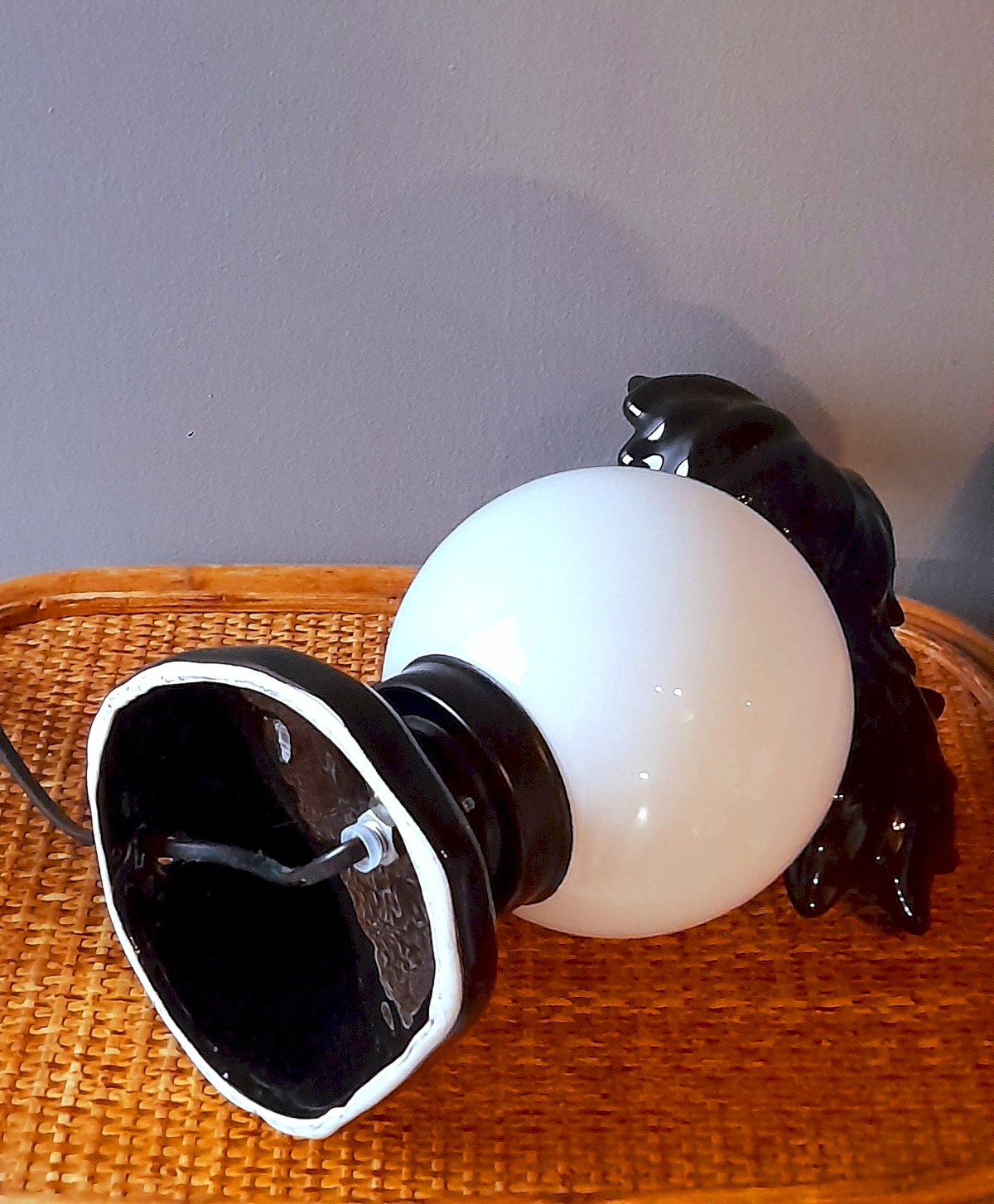 Lampe palmier en céramique émaillée noire ,globe en opaline blanche, série Los Angeles de la marque Mathias des années 1980.