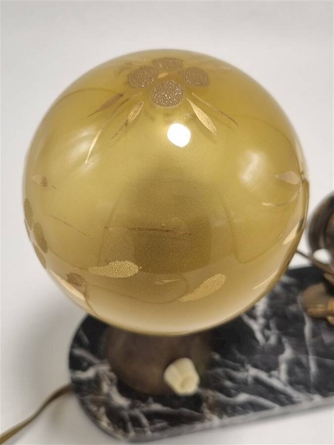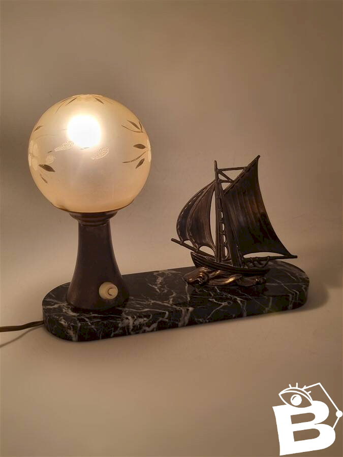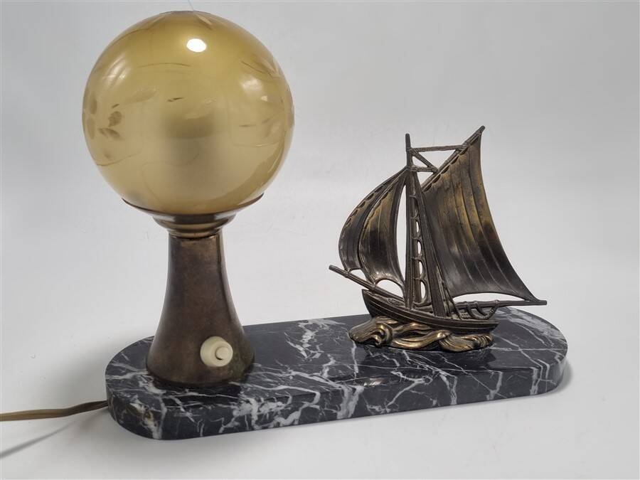 Lampe décor voilier.Son socle est en marbre noir veiné, il présente quelques rayures; le voilier est en régule avec une patine bronze; le pied sous le globe est un peu oxydé; le globe en verre est en bon état.Douille B22.Dimensions: 26 X 8 X 20 cm.Poids: 1.5 kg environ.