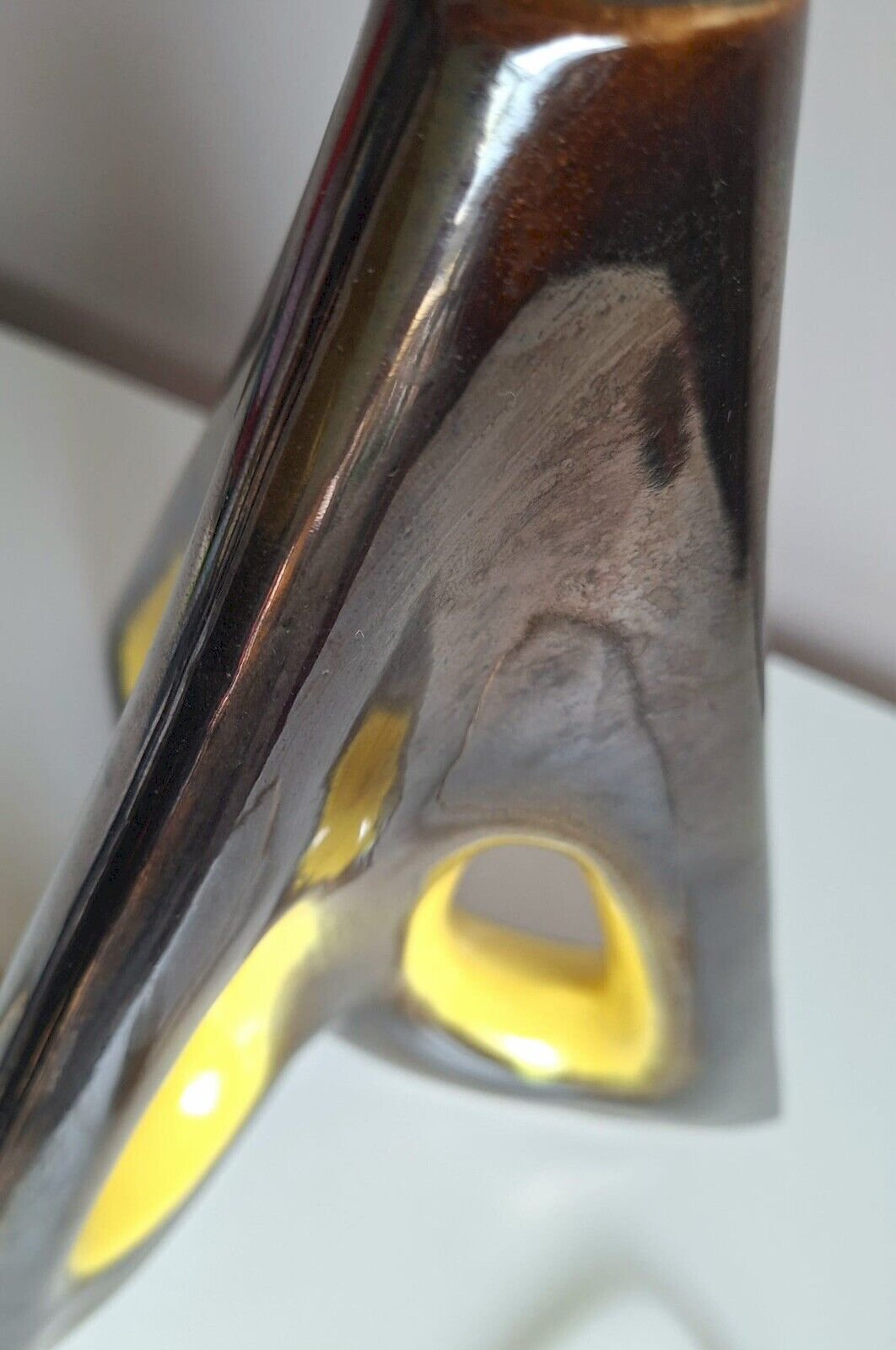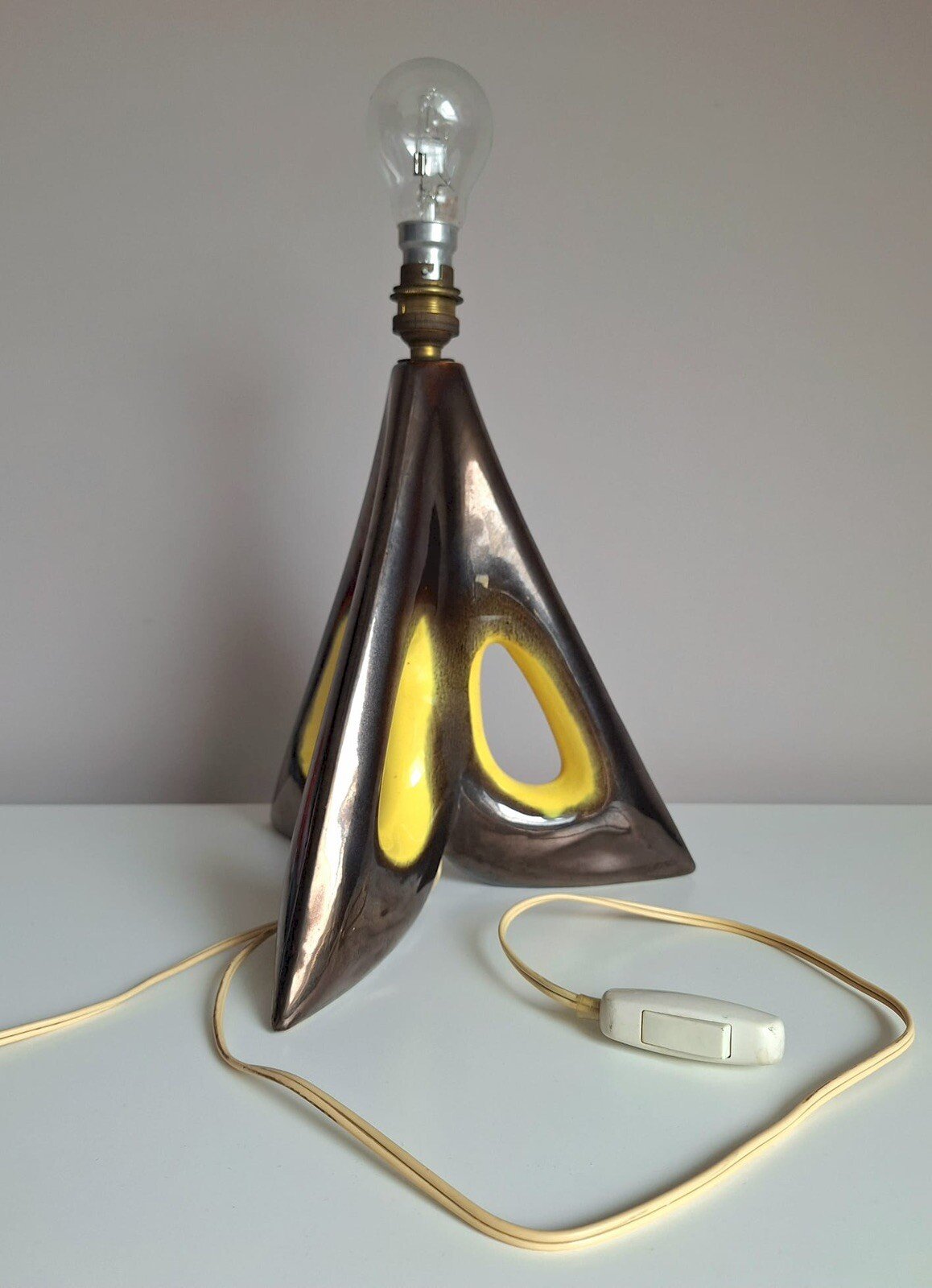 Merci de m’écrire si vous souhaitez me faire une offre. Lampe vintage en céramique, luminaire ancien Lampe à poser de forme triangulaire. Originale avec son interrupteur déporté. Couleurs marron irisé et jaune. Fonctionnelle, très bon état général. Diamètre 25cm, hauteur 29cm . Vendue sans abat-jour. Remise à mon domicile ou livraison possible via transporteur (ex 30€ vers Paris et région parisienne, me contacter pour d’autres destinations). Les délais de livraison de 2 à 4 jours sont imposés par et sont donc donnés à titre purement indicatif. design porcelaine chevet ambiance Matière:Céramique