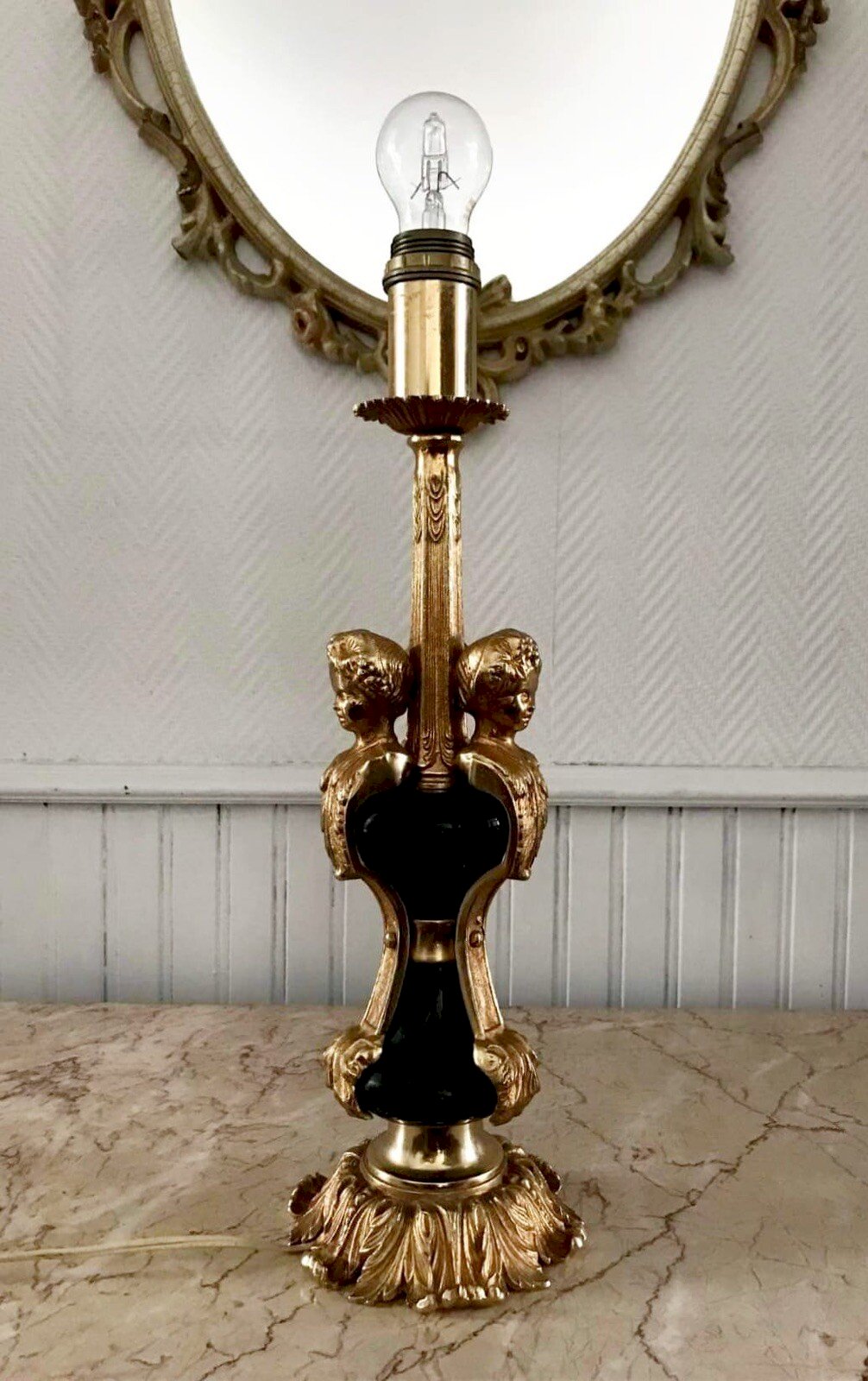 Merci de m’écrire si vous souhaitez me faire une offre. Lampe vintage or et noire style Empire, luminaire ancien Dimensions diamètre au pied 15cm, hauteur 48cm. Vendue sans abat jour. Très très lourde. 3 chérubins ou angelots dorés. Pied en feuillage. Fonctionnelle. Traces discrètes d’usage. Remise à mon domicile ou livraison possible via transporteur (ex 30€ vers Paris et région parisienne, me contacter pour d’autres destinations). Les délais de livraison de 2 à 4 jours sont imposés par et sont donc donnés à titre purement indicatif. Baroque shabby bronze Couleur dominante:Noir