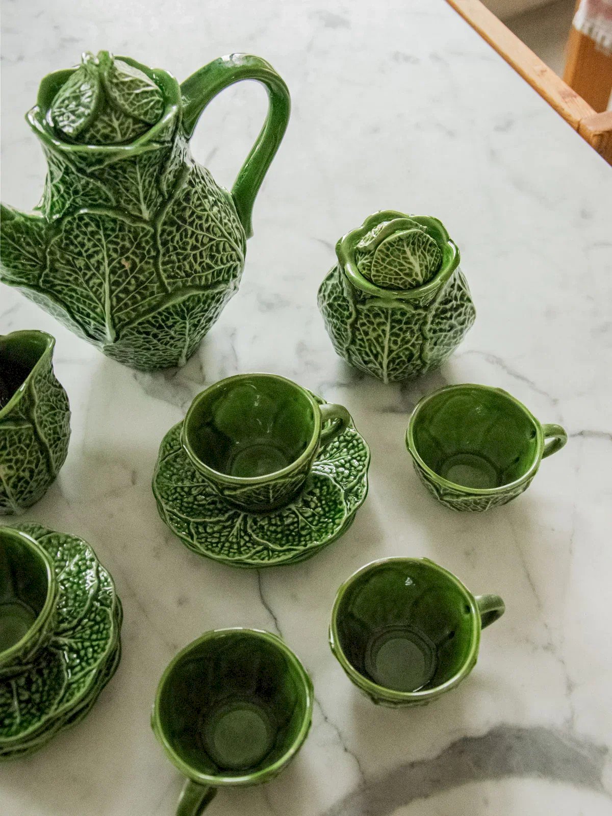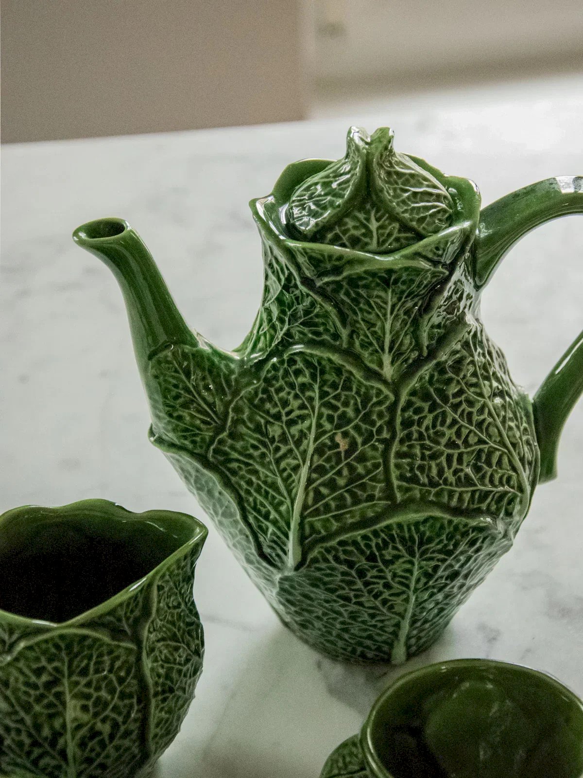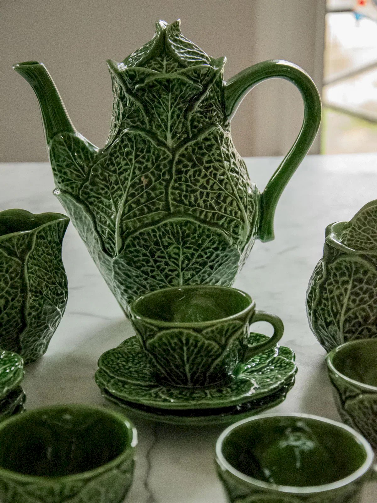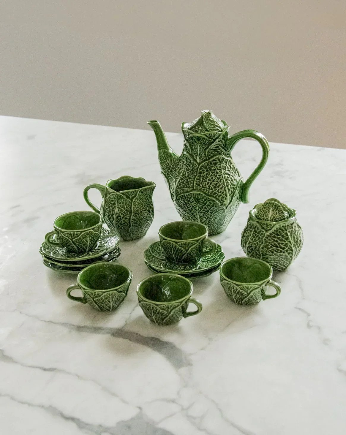 Découvrez ce service à café en barbotine de Caldas da Rainha, orné de choux sculptés dans la tradition portugaise des années 1950–60. Complet et harmonieux, il réunit cinq tasses et soucoupes, une cafetière avec couvercle, un pot à lait et un sucrier, parfait pour animer une table de café ou de thé; la barbotine offre une finition douce et lumineuse qui apporte une note rétro et élégante à vos moments conviviaux. En excellent état. Un micro-éclat sous le couvercle, invisible une fois fermé. Dimensions de la cafetière / théière : Hauteur : 20 cm Diamètre : 20 cm Dimensions des tasses : Hauteur : 4 cm Diamètre : 7 cm Dimensions des soucoupes : Diamètre : 12 cm Dimensions du pot à lait : Hauteur : 9 cm Diamètre : 12 cm Dimensions du sucrier : Hauteur : 11 cm Diamètre : 9 cm État:Occasion: Objet ayant été utilisé. Objet présentant quelques marques d'usure superficielle, ...Occasion: Objet ayant été utilisé. Objet présentant quelques marques d'usure superficielle, entièrement opérationnel et fonctionnant correctement. Il peut s'agir d'un modèle de démonstration ou d'un objet retourné en magasin après une courte période d'utilisation. les éventuelles imperfections. Marque:Debongout Type:Produit chiné Matériau:Barbotine Style:Campagne