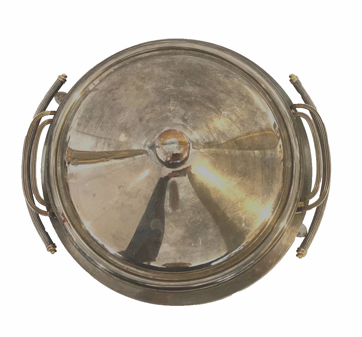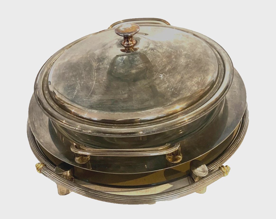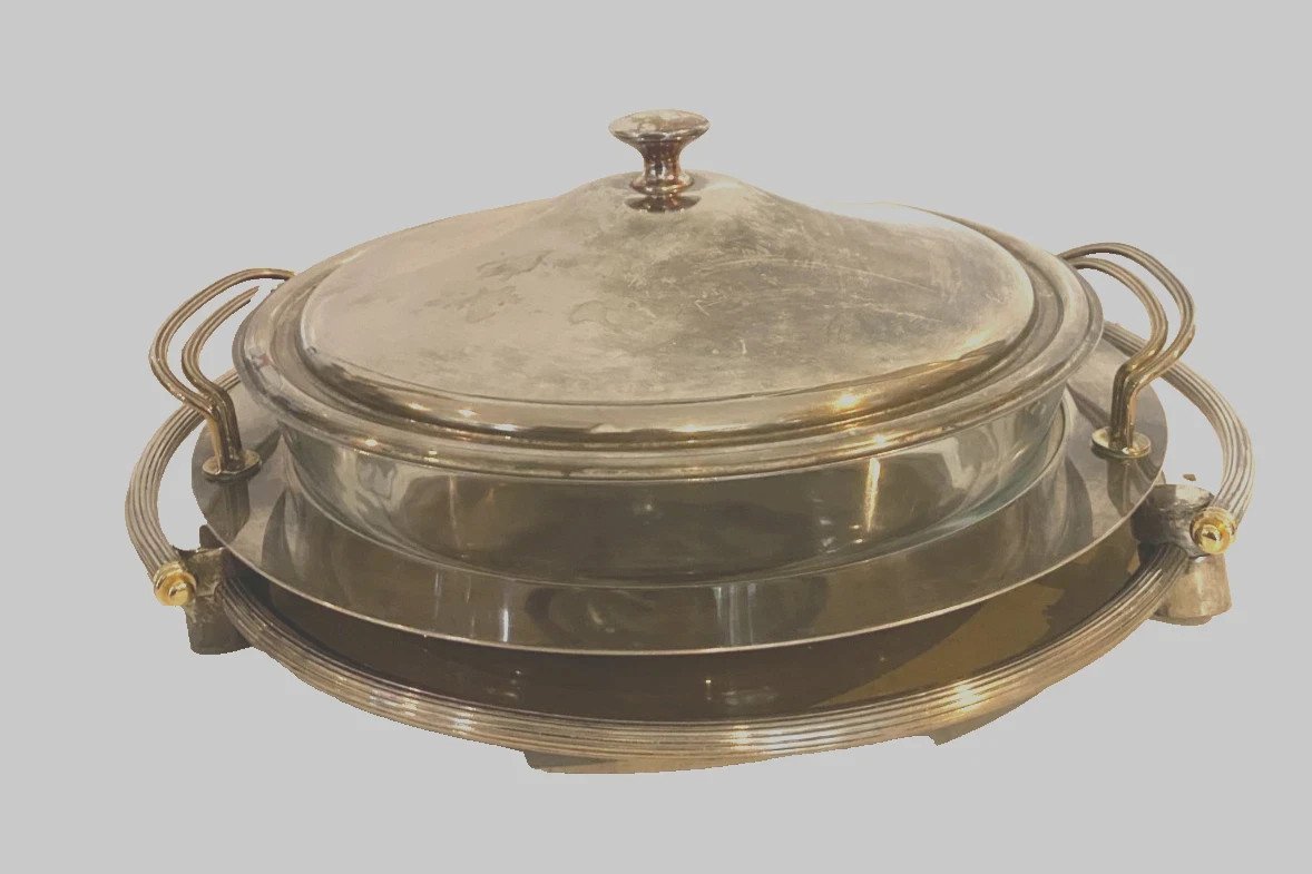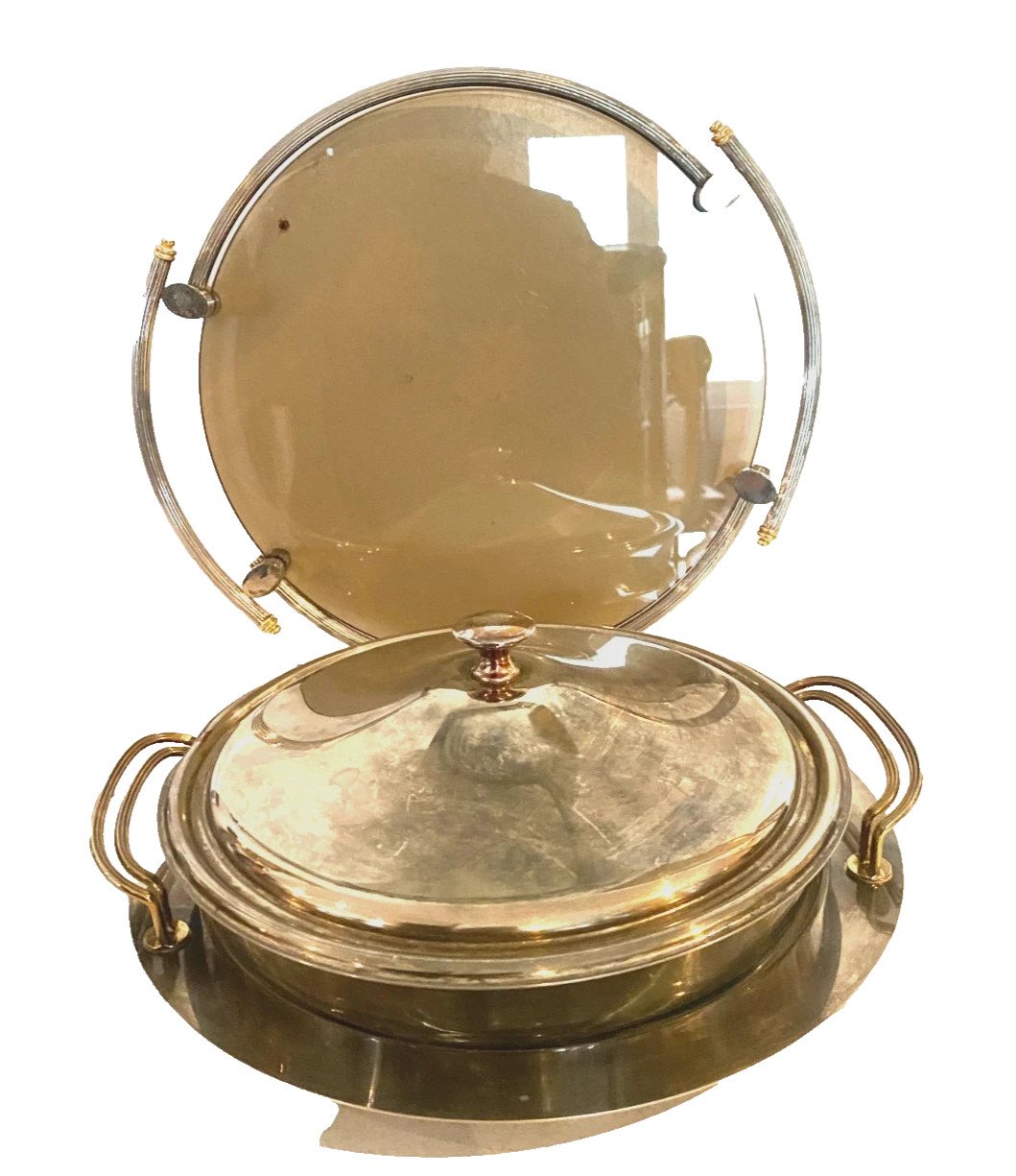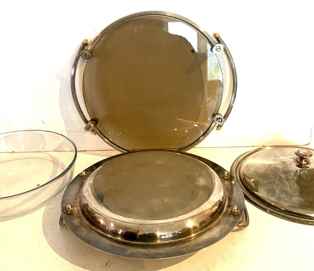 Légumier couvert et son Plateau de présentation  Cet ensemble se compose en trois partie  Légumier en verre et son couvercle en métal Le porte légumier en métal et son plateau de présentation  Bob état  Dimension   H 15 x L 36 x 32 cm  XX siècle  Type:Arts de la table, Cuisine Origine:France Période:Design du XXème Hauteur:15 Matière:Métal argenté Longueur:36 Largeur:32