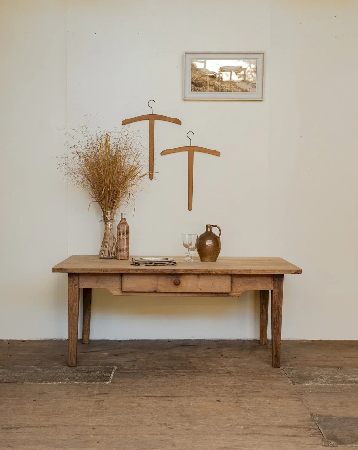 Table basse en peuplier ancienne, inspirée de l'esprit campagne, qui apporte une présence douce et authentique au salon. Le bois clair et son veinage naturel offrent une surface chaleureuse, propice à poser tasses et livres sans alourdir l'espace. Munie d'un tiroir, elle permet de ranger télécommandes et petits objets dans un format facile à intégrer. Ses proportions s'accordent aussi bien avec un intérieur contemporain que campagne. Légères traces du temps qui participent à son charme. Longueur : 129 cm Largeur : 71 cm Hauteur : 53,5 cm Hauteur tiroir : 7,5 cm État:Occasion: Objet ayant été utilisé. Objet présentant quelques marques d'usure superficielle, ...Occasion: Objet ayant été utilisé. Objet présentant quelques marques d'usure superficielle, entièrement opérationnel et fonctionnant correctement. Il peut s'agir d'un modèle de démonstration ou d'un objet retourné en magasin après une courte période d'utilisation. les éventuelles imperfections. Marque:Debongout Type:Produit chiné Matériau:Peuplier Style:Campagne Personnalisé:Tables basses