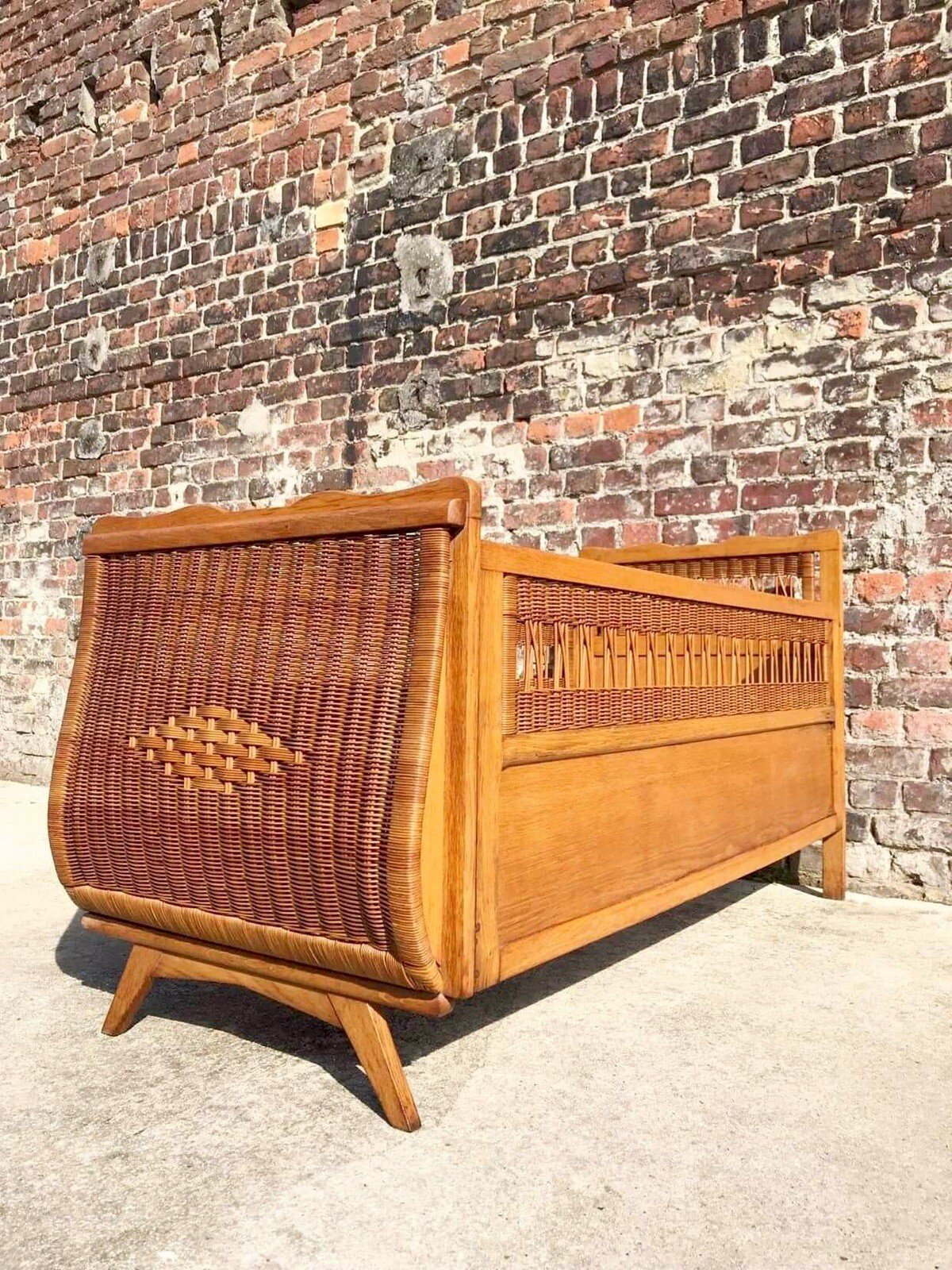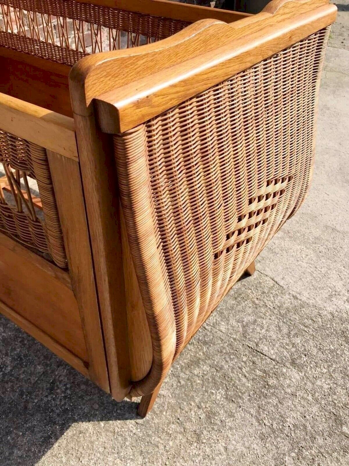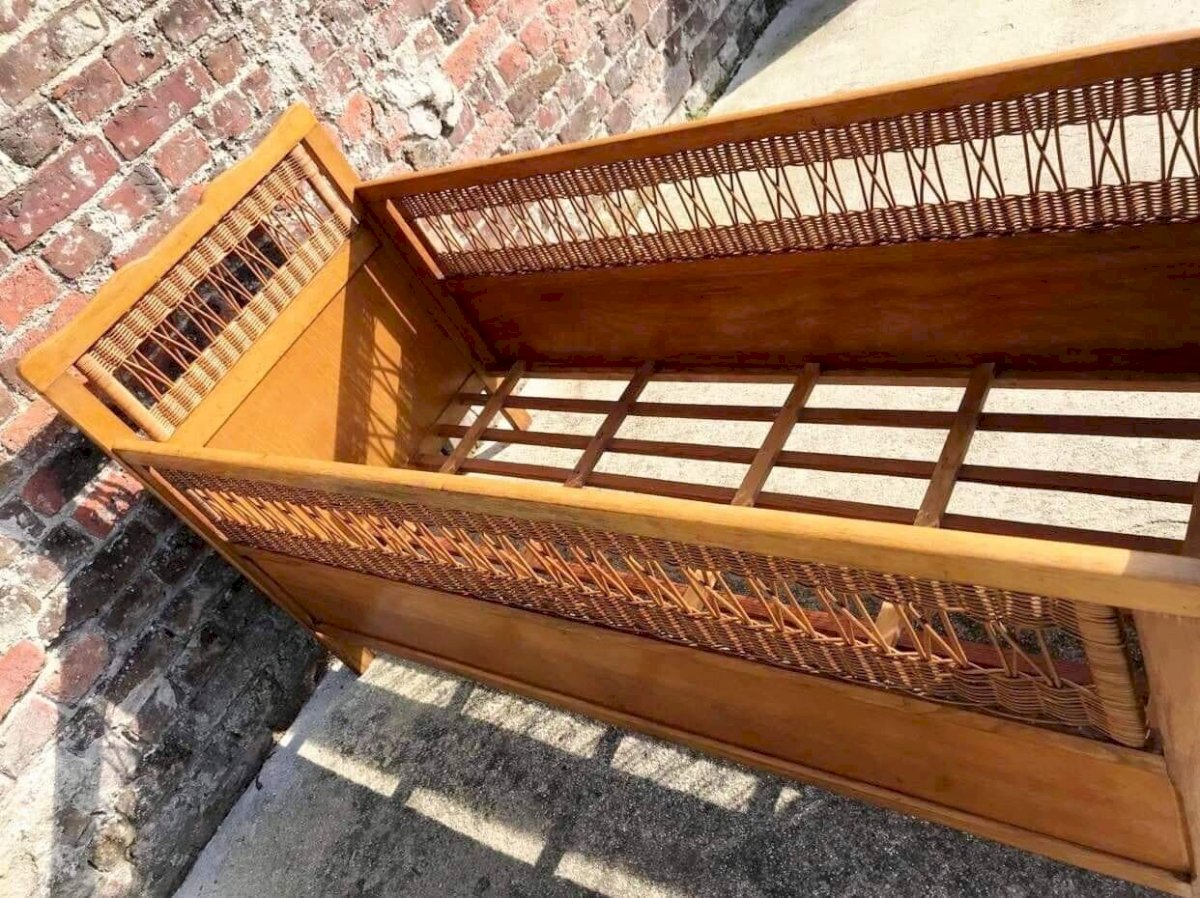 Lit Bebe Vintage En Rotin Et Osier Pieds Compas, Meuble Berceau Ancien