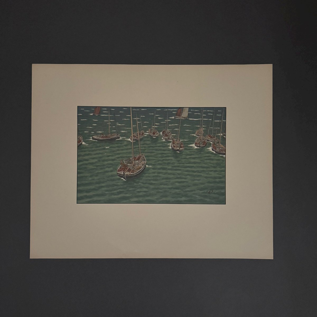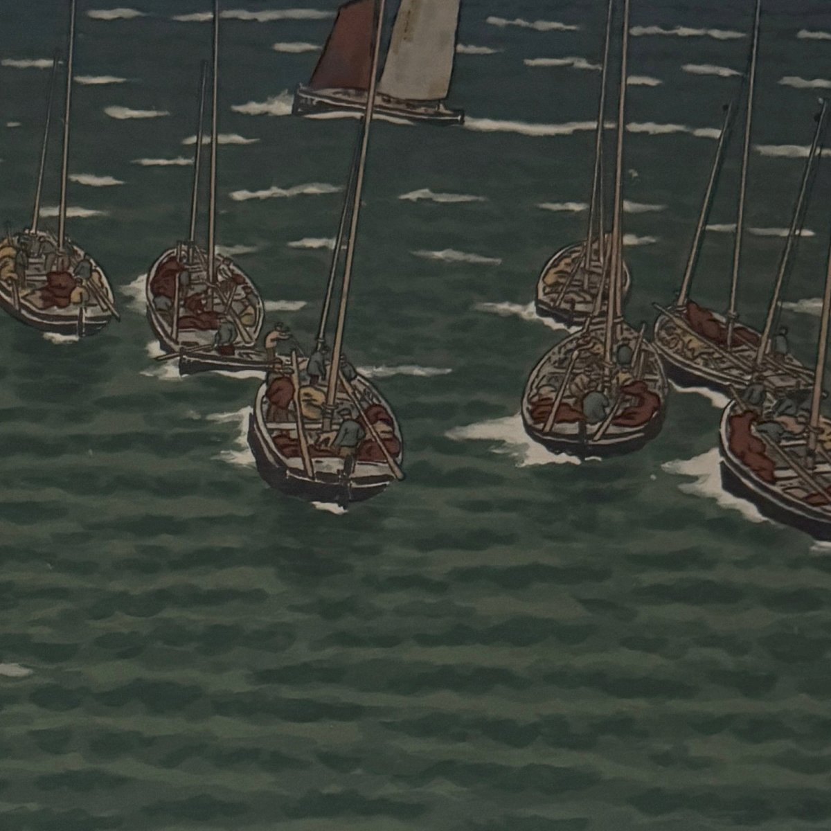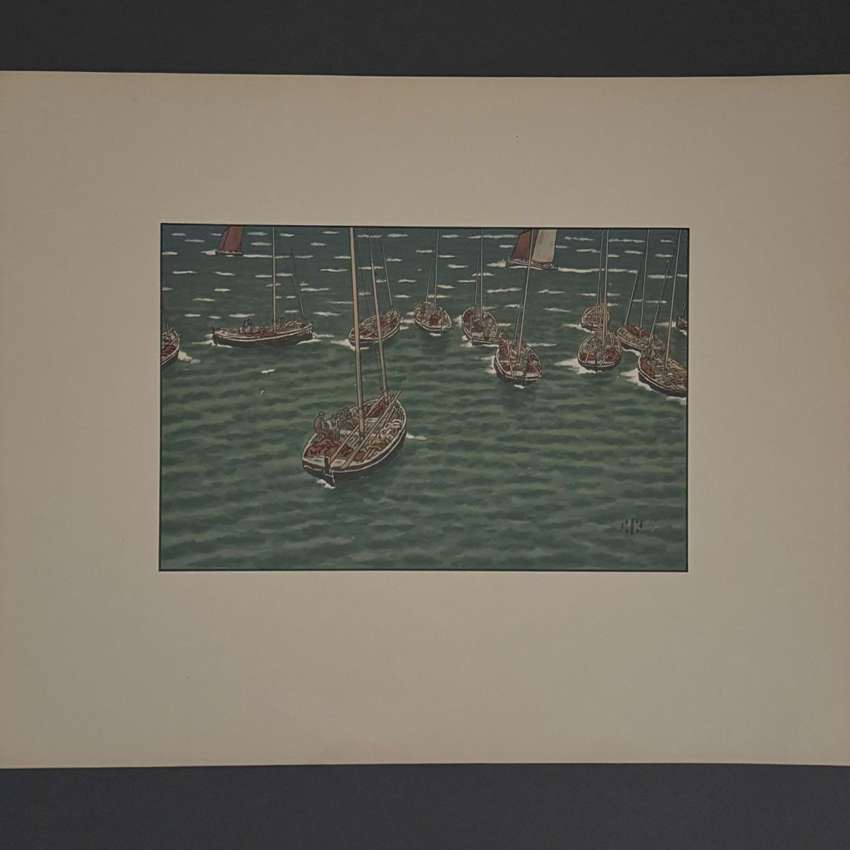 Lithographie par Henri Rivière Le Beau Pays de Bretagne - Bateaux au mouillage à Tréboul A5806 Cette lithographie “Le Beau Pays de Bretagne - Bateaux au mouillage à Tréboul” est signée Henri Rivière et porte un cachet au timbre rouge en bas à droite. L’œuvre est authentique et ancienne. La lithographie est en très bon état de conservation, les couleurs sont parfaites. Henri Rivière (1864-1951) est un artiste peintre, graveur et illustrateur français. Il commence sa carrière par le dessin puis par la gravure en taille douce et spécifiquement l’eau-forte en 1882. Parallèlement il entame une carrière de metteur en scène et scénographe, en 1886, du théâtre d’ombres au cabaret du Chat noir, spectacles qu’il améliore par la création de décors en couleurs, très novateurs. Il se consacre ensuite exclusivement à la peinture et à la gravure et s’impose dans l’histoire de l’eau-forte, de l’estampe, de la gravure sur bois, de la lithographie et de l’aquarelle (il a peint environ un millier d’aquarelles). Nos nombreuses photos vous permettent d’apprécier la qualité de cette lithographie. Pour l’état, merci de bien détailler les photos. N’hésitez pas à zoomer. Les photos font partie intégrante de la description. Dimensions : Hauteur : 45,3 cm Largeur : 56,3 cm Œuvre Hauteur : 23 cm Largeur : 35 cm A : EX10HOFZBS P : 1651417 Je reste à votre disposition pour toute question. Authenticité:Inconnu Type:Lithographie Support:Sur papier Pays d'origine:France Hauteur:45,3 cm Caractéristiques:Signée Thème:Paysage marin, Bateau Largeur:56,3 cm