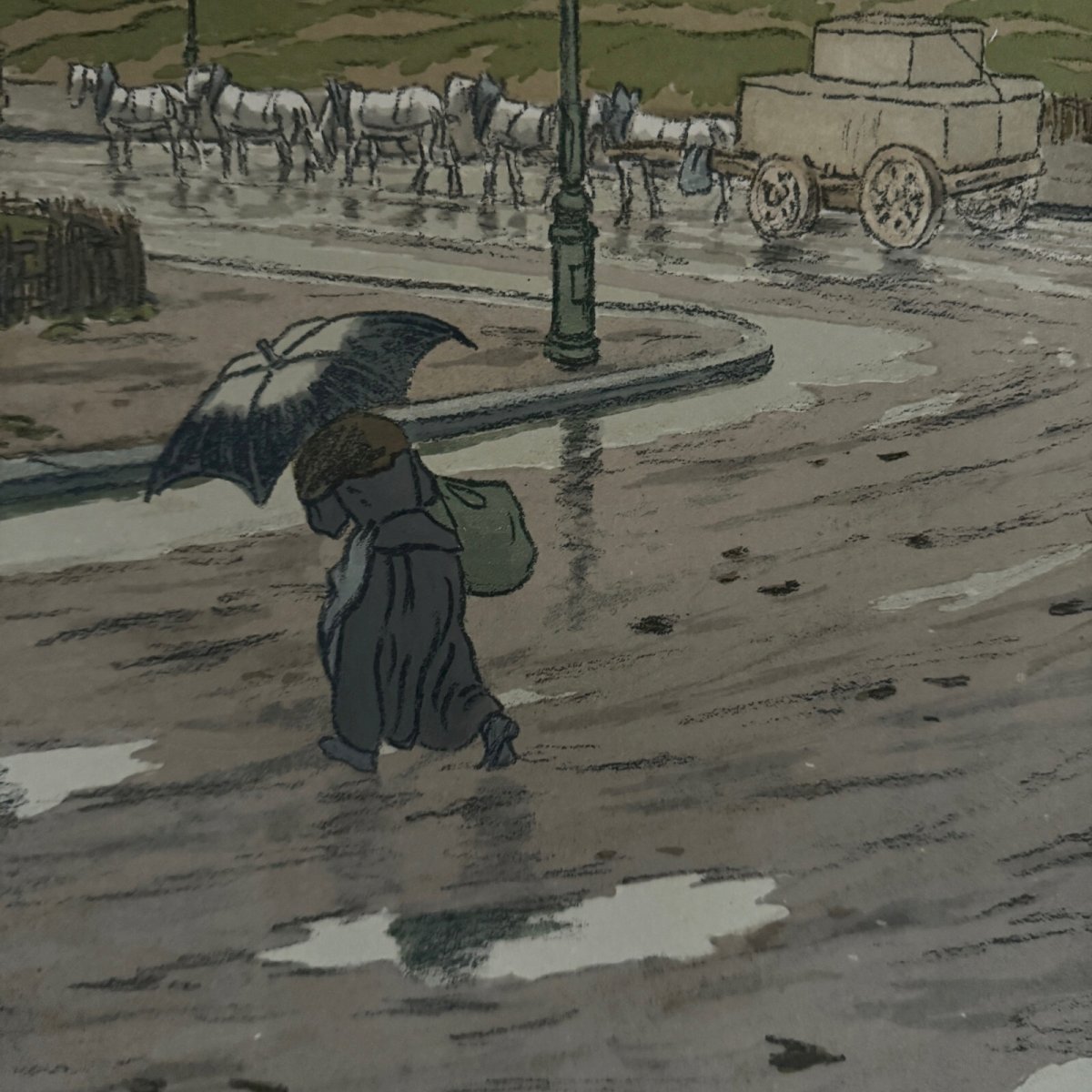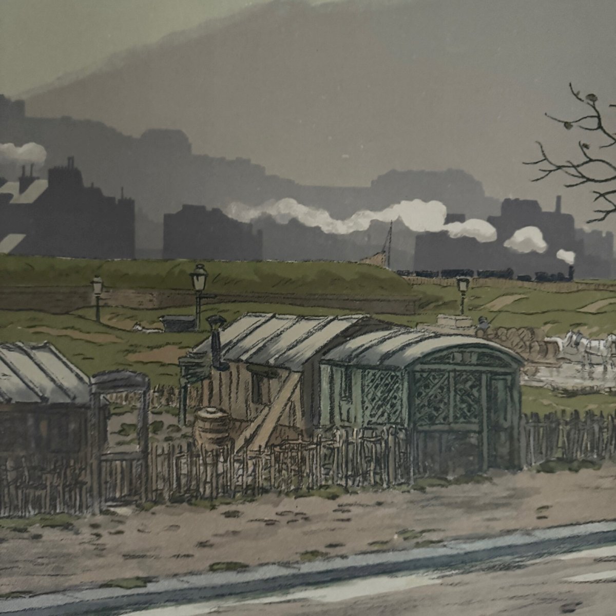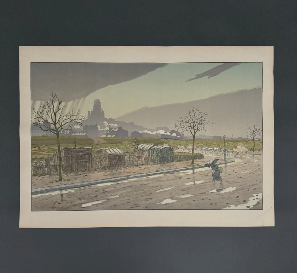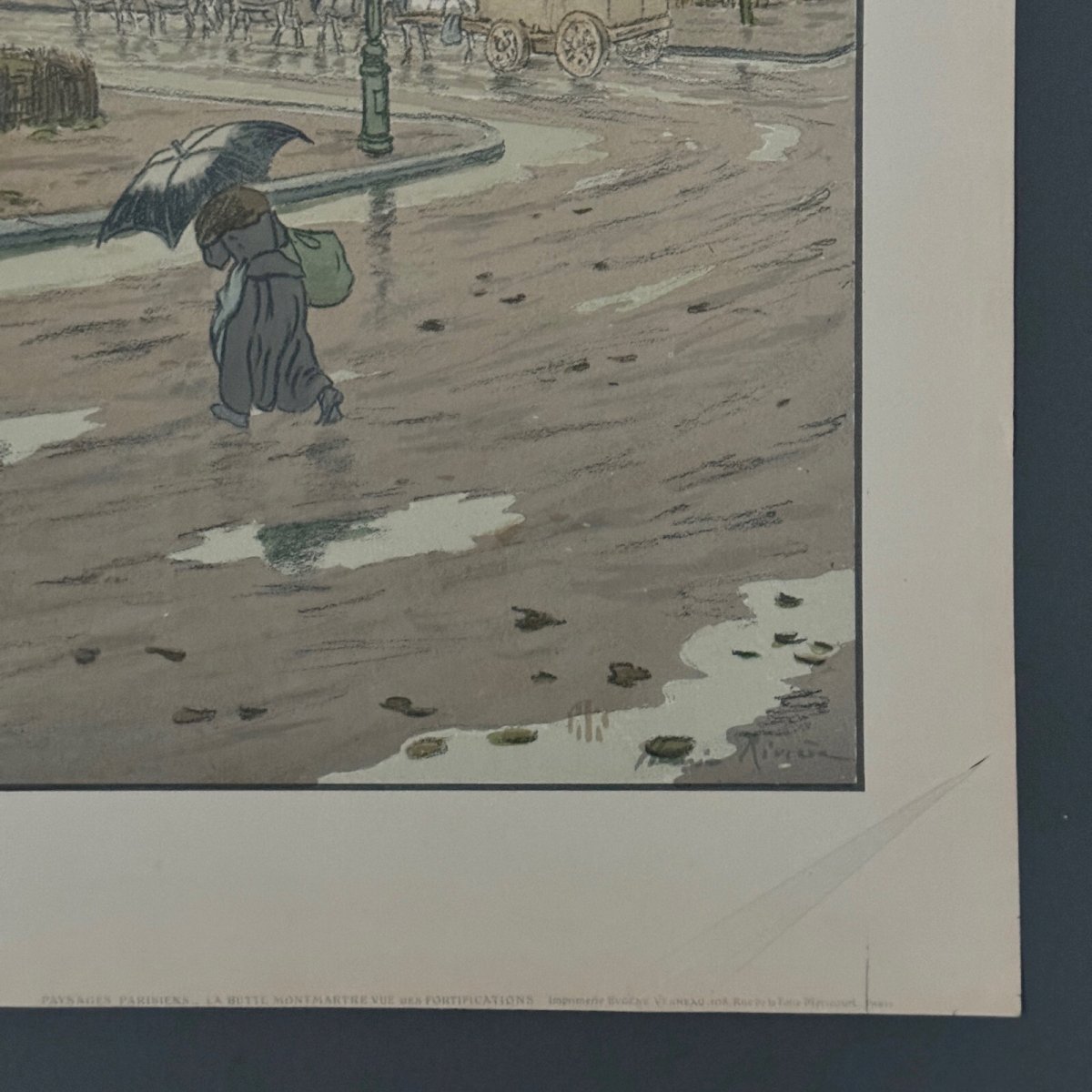 Lithographie par Henri Rivière Paysages Parisiens - La Butte Montmartre vue des Fortifications A5526 Cette lithographie “Paysages Parisiens - La Butte Montmartre vue des Fortifications” est signée Henri Rivière et porte un cachet au timbre rouge en bas à droite. L’œuvre est authentique et ancienne. Pour l’état, notons dans la marge des pliures par endroits, une déchirure (0,5 cm) à gauche, des traits d'encre et des petites taches. Sur la litho, nous signalons des petites taches et des points blancs (manque d'encre), une légère ondulation sur le haut. La lithographie est très fraiche en couleur, une fois encadrée la plupart des défauts seront peu visibles. Vendue telle que présentée. Henri Rivière (1864-1951) est un artiste peintre, graveur et illustrateur français. Il commence sa carrière par le dessin puis par la gravure en taille douce et spécifiquement l’eau-forte en 1882. Parallèlement il entame une carrière de metteur en scène et scénographe, en 1886, du théâtre d’ombres au cabaret du Chat noir, spectacles qu’il améliore par la création de décors en couleurs, très novateurs. Il se consacre ensuite exclusivement à la peinture et à la gravure et s’impose dans l’histoire de l’eau-forte, de l’estampe, de la gravure sur bois, de la lithographie et de l’aquarelle (il a peint environ un millier d’aquarelles). Nos nombreuses photos vous permettent d’apprécier la qualité de cette lithographie. Pour l’état, merci de bien détailler les photos. N’hésitez pas à zoomer. Les photos font partie intégrante de la description. Dimensions : Hauteur : 64 cm Largeur : 89,9 cm Œuvre Hauteur : 52,5 cm Largeur : 82,2 cm P : 1699789 Je reste à votre disposition pour toute question. Authenticité:Inconnu Type:Lithographie Support:Sur papier Pays d'origine:France métropolitaine Hauteur:64 cm Caractéristiques:Signée Thème:Paysage parisien Largeur:89,9 cm