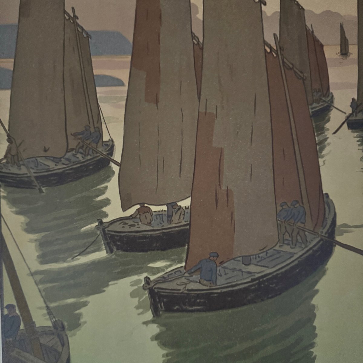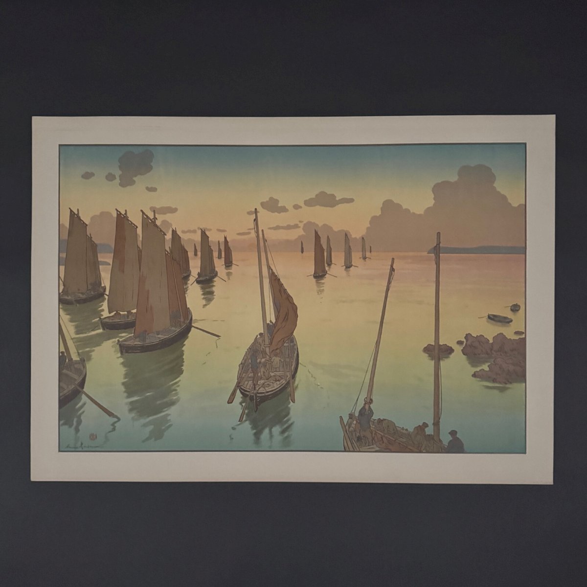 Lithographie par Henri Rivière Les Aspects de la Nature - Le Coucher de Soleil A5594 Cette lithographie “Les Aspects de la Nature - Le Coucher de Soleil” est signée Henri Rivière et porte un cachet au timbre rouge en bas à gauche. L’œuvre est authentique et ancienne. Pour l’état, notons dans la marge une petite déchirure (0,3 cm) en bas, des traits d'encre et des petites taches, des angles légèrement cornés. Sur la litho, nous signalons des petites taches. La lithographie est très fraiche en couleur, une fois encadrée la plupart des défauts seront peu visibles. Vendue telle que présentée. Henri Rivière (1864-1951) est un artiste peintre, graveur et illustrateur français. Il commence sa carrière par le dessin puis par la gravure en taille douce et spécifiquement l’eau-forte en 1882. Parallèlement il entame une carrière de metteur en scène et scénographe, en 1886, du théâtre d’ombres au cabaret du Chat noir, spectacles qu’il améliore par la création de décors en couleurs, très novateurs. Il se consacre ensuite exclusivement à la peinture et à la gravure et s’impose dans l’histoire de l’eau-forte, de l’estampe, de la gravure sur bois, de la lithographie et de l’aquarelle (il a peint environ un millier d’aquarelles). Nos nombreuses photos vous permettent d’apprécier la qualité de cette lithographie. Pour l’état, merci de bien détailler les photos. N’hésitez pas à zoomer. Les photos font partie intégrante de la description. Dimensions : Hauteur : 64,8 cm Largeur : 92,3 cm Œuvre Hauteur : 54,8 cm Largeur : 82,8 cm PAM : QKG-2277573 S : K5SZVD6E Je reste à votre disposition pour toute question. Authenticité:Inconnu Type:Lithographie Support:Sur papier Hauteur:64,8 cm Caractéristiques:Signée Thème:Paysage Largeur:92,3 cm
