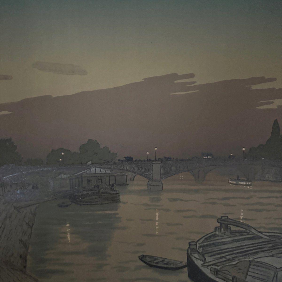 Lithographie par Henri Rivière Paysages Parisiens - Le Pont des Saints-Pères et le Louvre A5666 Cette lithographie “Paysages Parisiens - Le Pont des Saints-Pères et le Louvre” est signée Henri Rivière et porte un cachet au timbre rouge en bas à droite. L’œuvre est authentique et ancienne, elle a été éditée et imprimée par Eugène Verneau. Pour l’état, notons dans la marge des petits traits d'encre et petits trous d'épingle, des traces de pliures. La lithographie est très fraiche en couleur, une fois encadrée la plupart des défauts seront peu visibles. Vendue telle que présentée. Henri Rivière (1864-1951) est un artiste peintre, graveur et illustrateur français. Il commence sa carrière par le dessin puis par la gravure en taille douce et spécifiquement l’eau-forte en 1882. Parallèlement il entame une carrière de metteur en scène et scénographe, en 1886, du théâtre d’ombres au cabaret du Chat noir, spectacles qu’il améliore par la création de décors en couleurs, très novateurs. Il se consacre ensuite exclusivement à la peinture et à la gravure et s’impose dans l’histoire de l’eau-forte, de l’estampe, de la gravure sur bois, de la lithographie et de l’aquarelle (il a peint environ un millier d’aquarelles). Nos nombreuses photos vous permettent d’apprécier la qualité de cette lithographie. Pour l’état, merci de bien détailler les photos. N’hésitez pas à zoomer. Les photos font partie intégrante de la description. Dimensions : Hauteur : 63,9 cm Largeur : 90 cm Œuvre Hauteur : 52,4 cm Largeur : 81,8 cm S : HADXW5V6 Je reste à votre disposition pour toute question. Authenticité:Inconnu Type:Lithographie Période:XXème et contemporain Support:Sur papier Hauteur:63,9 cm Caractéristiques:Signée Thème:Paysage parisien Largeur:90 cm Pays d'origine:France métropolitaine