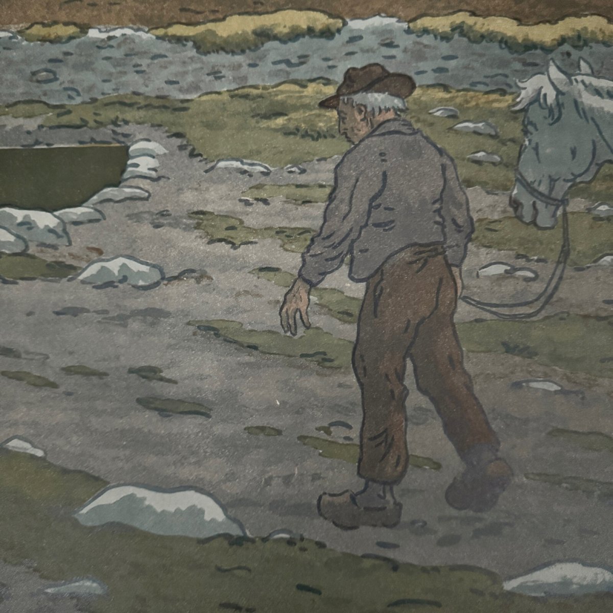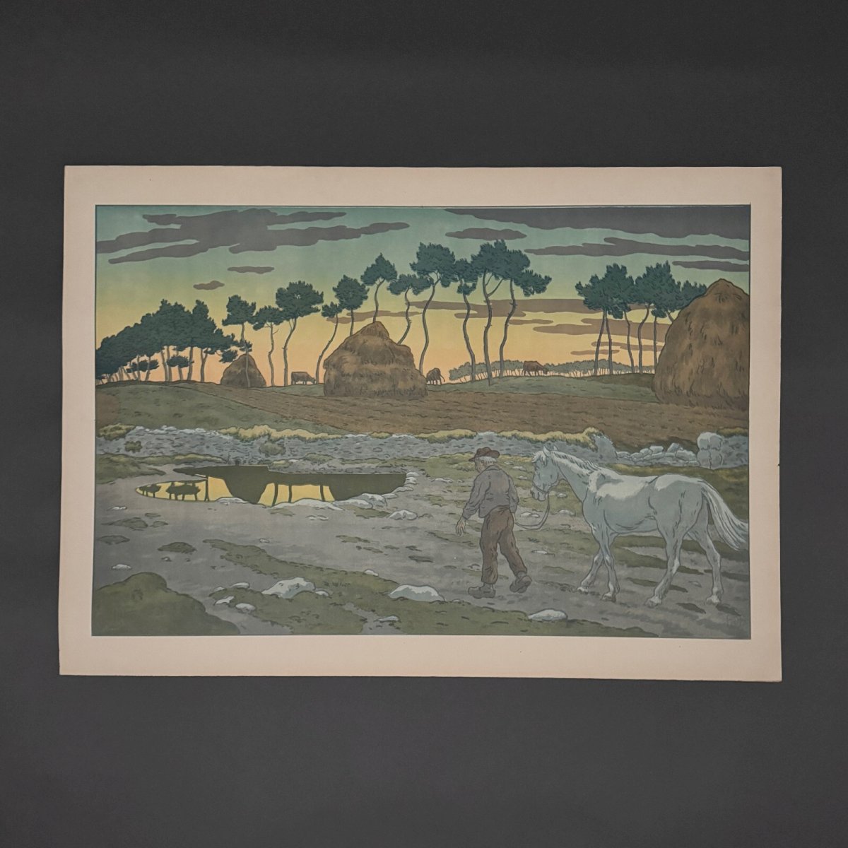 Lithographie par Henri Rivière Les Aspects de la Nature - Le Crépuscule A5675 Cette lithographie “Les Aspects de la Nature - Le Crépuscule” est signée Henri Rivière et porte un cachet au timbre rouge en bas à gauche. L’œuvre est authentique et ancienne. Pour l’état, notons dans la marge des marques de pliures, des petites déchirures (0,5 cm), des traits d'encre, des angles légèrement cornés, des petites taches. Sur la litho, nous signalons un petit manque d'encre en haut, des toutes petites taches. La lithographie est très fraiche en couleur, une fois encadrée la plupart des défauts seront peu visibles. Vendue telle que présentée. Henri Rivière (1864-1951) est un artiste peintre, graveur et illustrateur français. Il commence sa carrière par le dessin puis par la gravure en taille douce et spécifiquement l’eau-forte en 1882. Parallèlement il entame une carrière de metteur en scène et scénographe, en 1886, du théâtre d’ombres au cabaret du Chat noir, spectacles qu’il améliore par la création de décors en couleurs, très novateurs. Il se consacre ensuite exclusivement à la peinture et à la gravure et s’impose dans l’histoire de l’eau-forte, de l’estampe, de la gravure sur bois, de la lithographie et de l’aquarelle (il a peint environ un millier d’aquarelles). Nos nombreuses photos vous permettent d’apprécier la qualité de cette lithographie. Pour l’état, merci de bien détailler les photos. N’hésitez pas à zoomer. Les photos font partie intégrante de la description. Dimensions : Hauteur : 65 cm Largeur : 90,8 cm Œuvre Hauteur : 54,8 cm Largeur : 83 cm Je reste à votre disposition pour toute question. Authenticité:Inconnu Type:Lithographie Support:Sur papier Pays d'origine:France métropolitaine Hauteur:65 cm Caractéristiques:Signée Thème:Paysage Largeur:90,8 cm