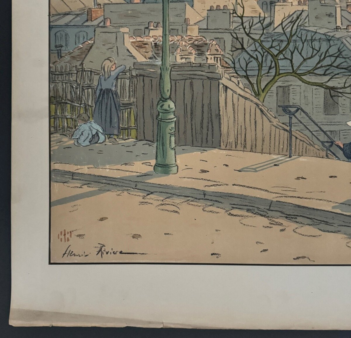 Lithographie par Henri Rivière Paysages Parisiens - Paris vu de Montmartre A5523 Cette lithographie “Paysages Parisiens - Paris vu de Montmartre” est signée Henri Rivière et porte un cachet au timbre rouge en bas à gauche. L’œuvre est authentique et ancienne. Pour l’état, notons dans la marge des traces de pliures aux angles, des petites déchirures sur les bords (de 0,3 cm à 1,5 cm), des traits d'encre et des petites taches. Sur la litho, nous signalons des petites taches par endroits. La lithographie est très fraiche en couleur, une fois encadrée la plupart des défauts seront peu visibles. Nous avons pris un maximum de photos des défauts pour que vous puissiez juger de l'état. Vendue telle que présentée. Henri Rivière (1864-1951) est un artiste peintre, graveur et illustrateur français. Il commence sa carrière par le dessin puis par la gravure en taille douce et spécifiquement l’eau-forte en 1882. Parallèlement il entame une carrière de metteur en scène et scénographe, en 1886, du théâtre d’ombres au cabaret du Chat noir, spectacles qu’il améliore par la création de décors en couleurs, très novateurs. Il se consacre ensuite exclusivement à la peinture et à la gravure et s’impose dans l’histoire de l’eau-forte, de l’estampe, de la gravure sur bois, de la lithographie et de l’aquarelle (il a peint environ un millier d’aquarelles). Nos nombreuses photos vous permettent d’apprécier la qualité de cette lithographie. Pour l’état, merci de bien détailler les photos. N’hésitez pas à zoomer. Les photos font partie intégrante de la description. Dimensions : Hauteur : 64,5 cm Largeur : 90 cm Œuvre Hauteur : 52,5 cm Largeur : 82,3 cm S : Y7C7UCAY Je reste à votre disposition pour toute question. Authenticité:Inconnu Type:Lithographie Support:Sur papier Caractéristiques:Signée Thème:Paysage