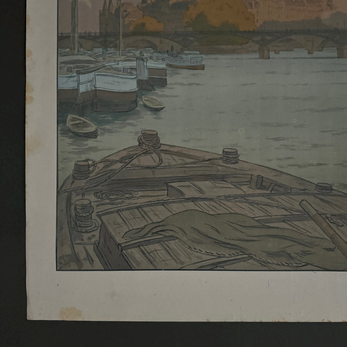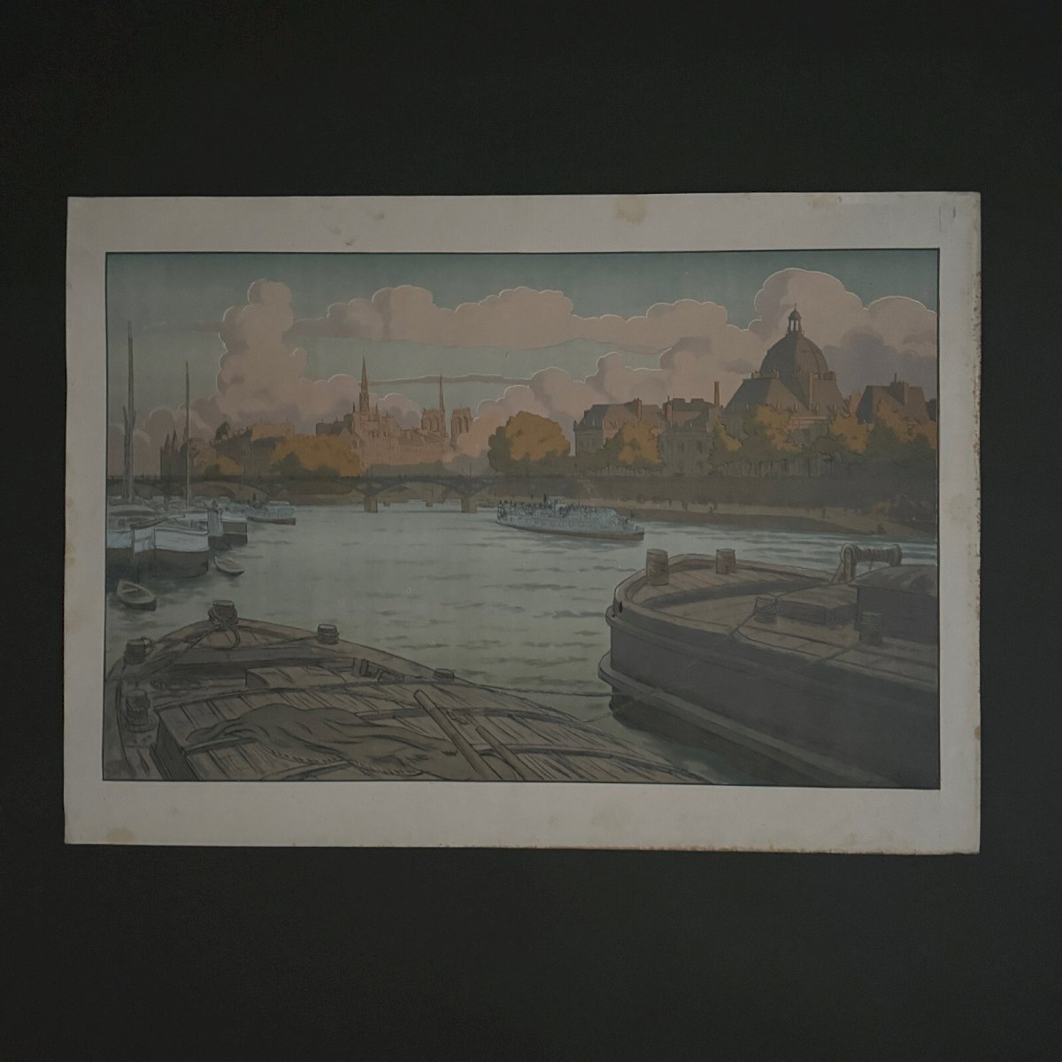 Lithographie sur papier de Chine par Henri Rivière Paysages Parisiens - L'Institut et la Cité A5570 Cette lithographie “Paysages Parisiens - L’Institut et la Cité” est signée Henri Rivière et porte un cachet au timbre rouge en bas à droite. L’œuvre est authentique et ancienne, il s’agit d’un rare tirage sur papier de Chine édité et imprimé par Eugène Verneau. Pour l’état, notons dans la marge des petites déchirures (de 0,2 cm à 1 cm), des petites taches et des salissures, des traces de pliures sur les bords, des traits d'encre. Sur la litho, nous signalons des petites taches, un petit trou à gauche (0,2 cm et déchirure 2 cm). La lithographie est très fraiche en couleur, une fois encadrée la plupart des défauts seront peu visibles. Vendue telle que présentée. Henri Rivière (1864-1951) est un artiste peintre, graveur et illustrateur français. Il commence sa carrière par le dessin puis par la gravure en taille douce et spécifiquement l’eau-forte en 1882. Parallèlement il entame une carrière de metteur en scène et scénographe, en 1886, du théâtre d’ombres au cabaret du Chat noir, spectacles qu’il améliore par la création de décors en couleurs, très novateurs. Il se consacre ensuite exclusivement à la peinture et à la gravure et s’impose dans l’histoire de l’eau-forte, de l’estampe, de la gravure sur bois, de la lithographie et de l’aquarelle (il a peint environ un millier d’aquarelles). Nos nombreuses photos vous permettent d’apprécier la qualité de cette lithographie. Pour l’état, merci de bien détailler les photos. N’hésitez pas à zoomer. Les photos font partie intégrante de la description. Dimensions : Hauteur : 64,5 cm Largeur : 90 cm Œuvre Hauteur : 57,2 cm Largeur : 82,4 cm S : XSQXBQGS Je reste à votre disposition pour toute question. Authenticité:Inconnu Type:Lithographie Support:Sur papier Hauteur:64,5 cm Caractéristiques:Signée Thème:Paysage parisien Largeur:90 cm