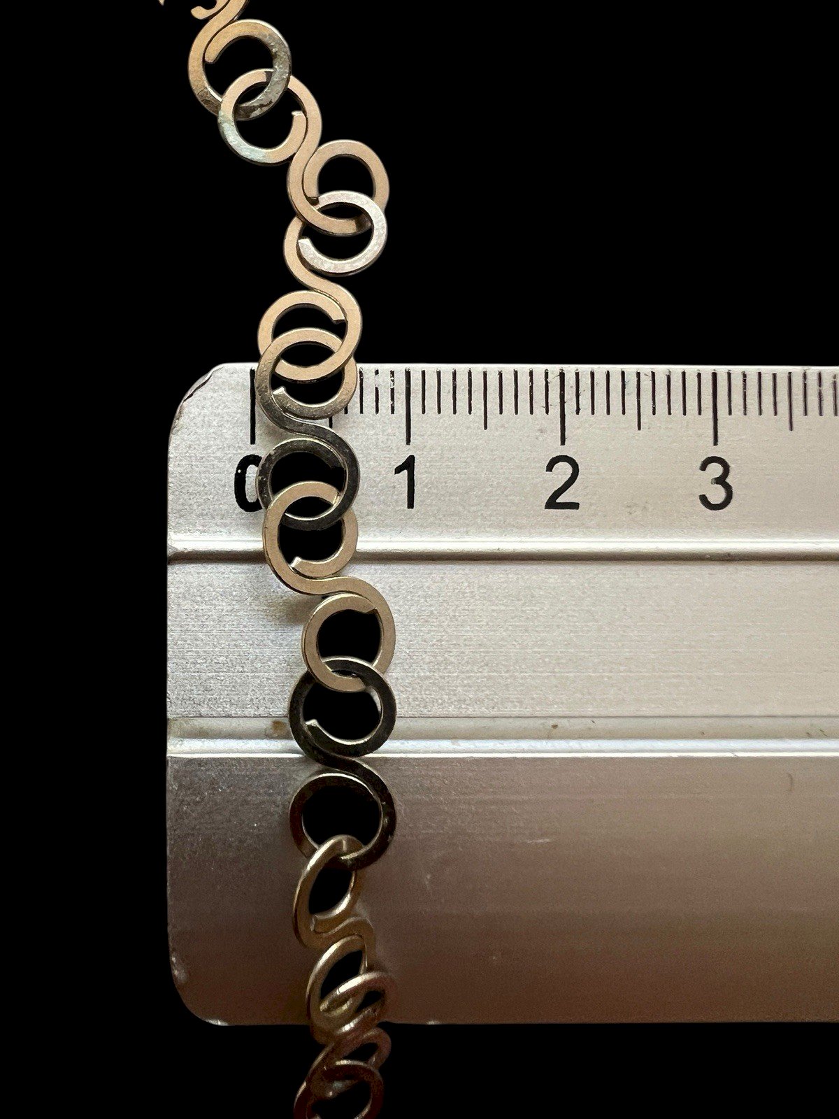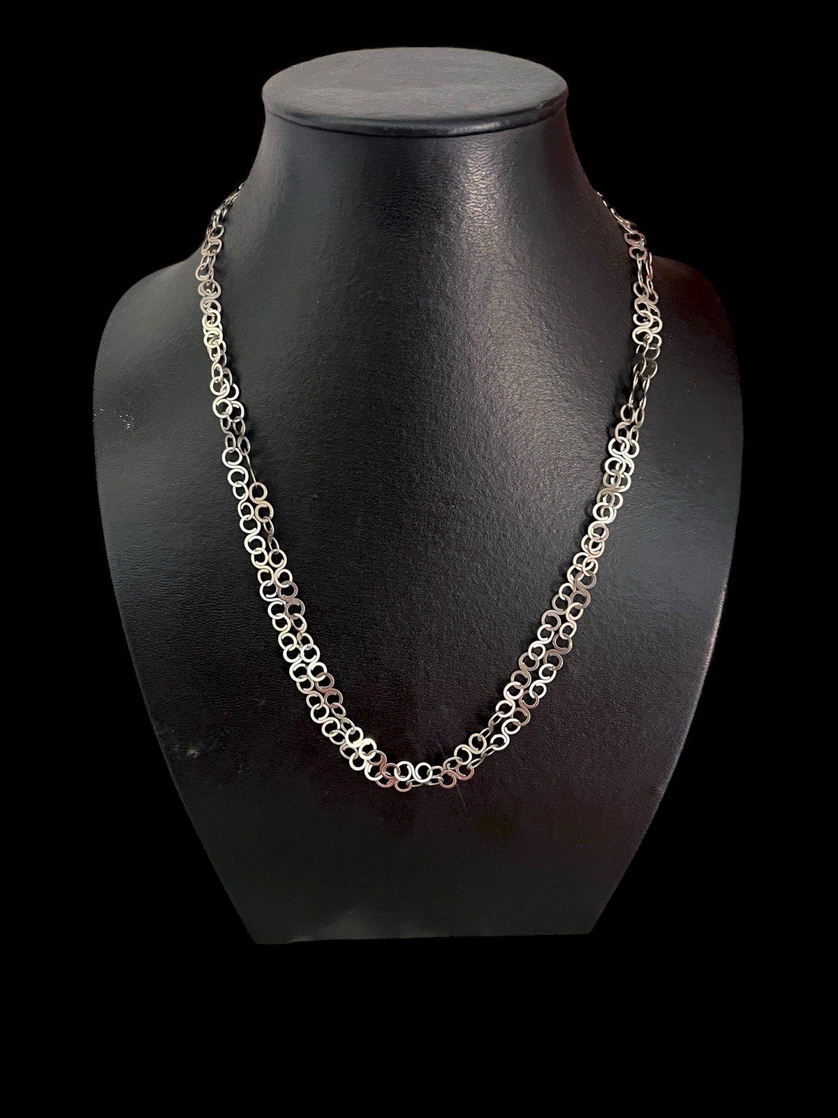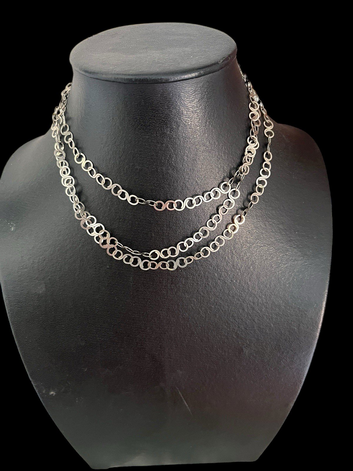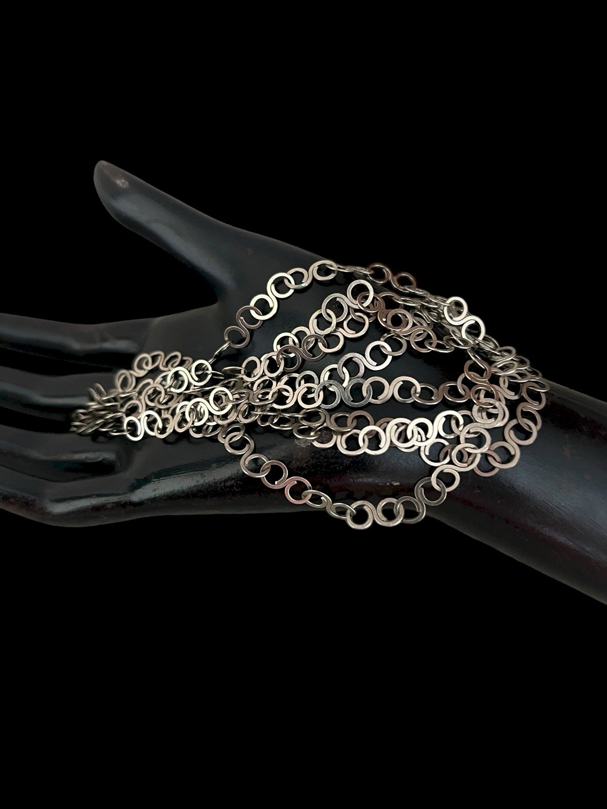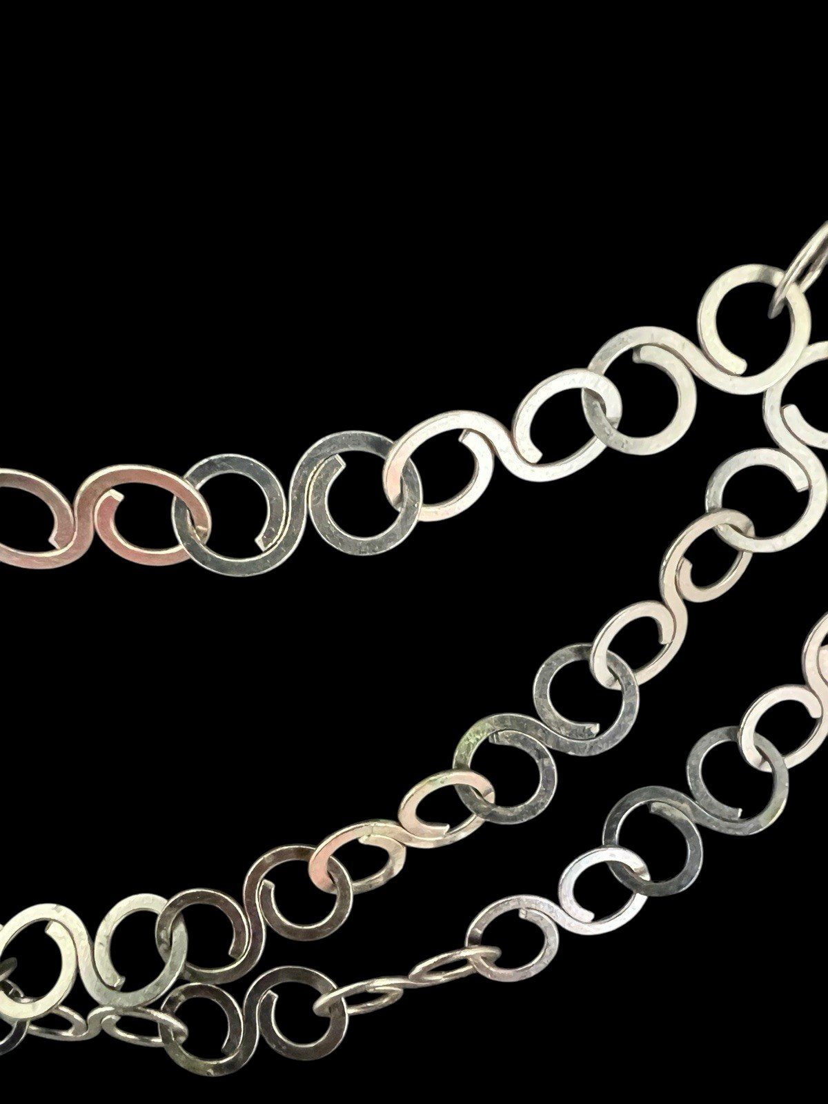 Long sautoir design vers 1970-bijoux de créateur-vintage-pièce collector. Élégant collier sautoir vintage, design des années 1970 Découvrez ce magnifique collier long, un véritable bijou de créateur qui incarne l'esthétique audacieuse et le design minimaliste des années 1970. Sa conception unique en fait un accessoire de mode intemporel. Caractéristiques du bijou : * Période : Circa 1970. * Style : Design de créateur. * Matériaux : Métal chromé acier * Dimensions : * Hauteur portée : environ 62 cm. * Longueur totale dépliée : environ 125 cm. * Largeur des maillons ronds : environ 6 mm. * État : Excellent état vintage, avec une usure minime qui témoigne de son histoire et de son authenticité. Ce collier sautoir se porte facilement seul pour une touche d'élégance discrète, ou peut être superposé avec d'autres colliers pour un look plus moderne. C'est une pièce de collection parfaite pour les amateurs de bijoux vintage. État:Occasion: Objet ayant été porté. ...Occasion: Objet ayant été porté. les éventuelles imperfections. Type:Sautoir Thème:Designer Pierre dominante:Aucune Pierre Marque:Bijoux de créateur Couleur dominante:Argenté Matière:Acier Longueur:Plus de 90 cm