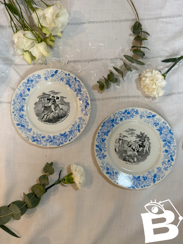 Deux assiettes parlantes anciennes Niederweiler, décor bleu avec scènes figuratives au centre et frise florale.