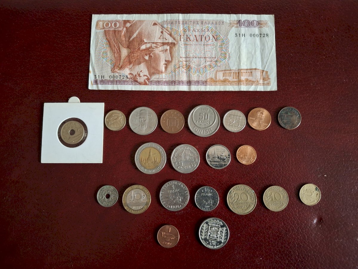 Le billet sont est un 'retour de vacances' de Grèce. Une pièce de 1 cent 1996 des Iles Salomon qui manque dans quasiment toutes les collections, d'autres pièces, France et Thailande ‘retour de vacances’, Tunisie 1950 ....