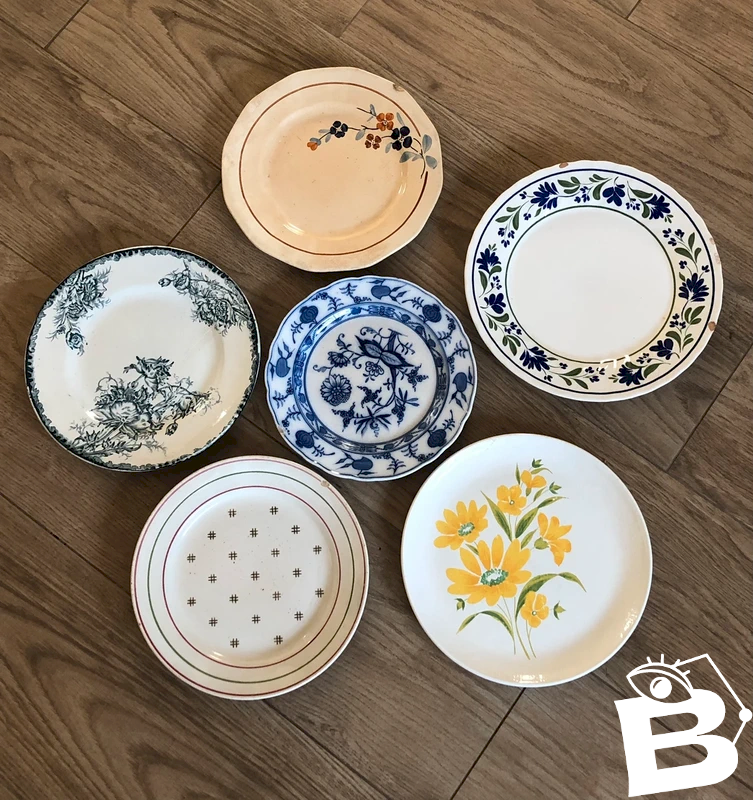 Lot de 6 assiettes plates anciennes dépareillées dans leurs jus , voir les défauts en photos