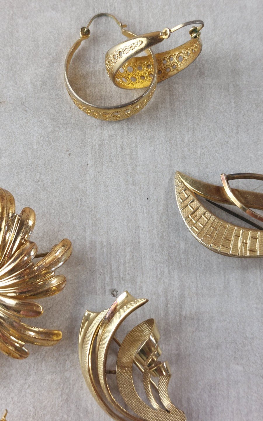 Lot d'anciens bijoux / fond de tiroir, broches, pendentif, boucle d'oreille, en métal doré, vintage en bon état marqués Amerik K&L, Amerikaner A*D v oir photos  Consultez mes autres objets  !  réduction des frais de port en cas d'achat groupé État:OccasionObjet ayant été porté. les éventuelles imperfections. Couleur dominante:Doré