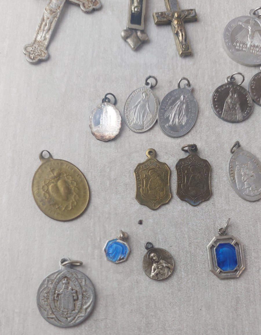 Grand lot d'anciens pendentifs / médaillons religieux, en métal argenté en bon état dimensions de la grande croix 6,5 cm X 4,2 cm voir photos  Consultez mes autres objets  !  réduction des frais de port en cas d'achat groupé État:OccasionObjet ayant été utilisé. les éventuelles imperfections. Type:Christianisme Sous-type:Lot Matière:Métal