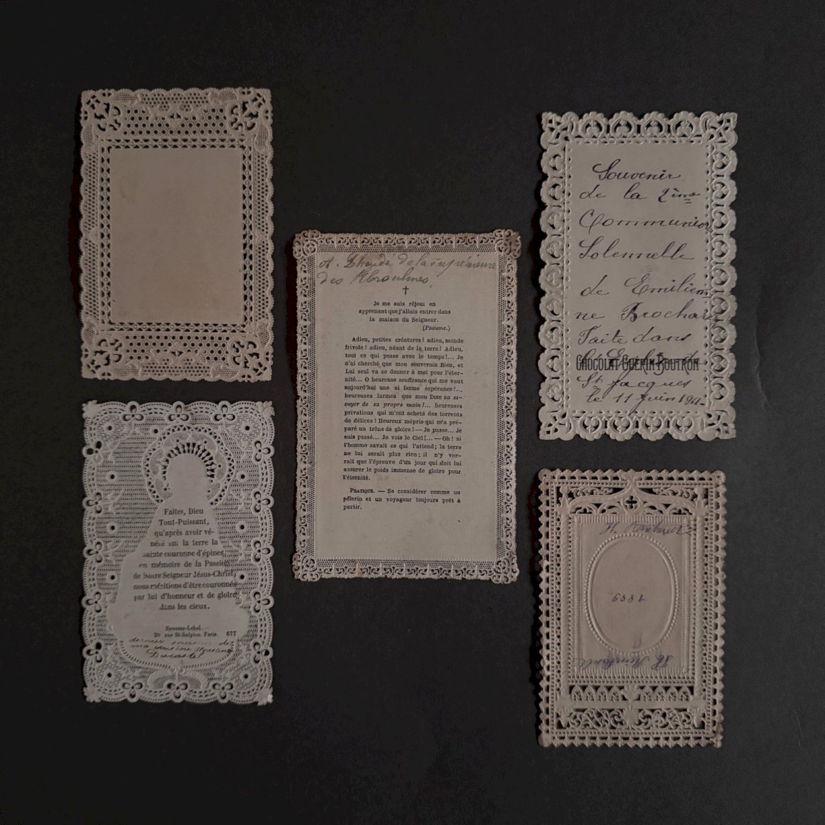 Lot de 10 canivets images pieuses anciennes A5791 Ces canivets, images pieuses sont anciens. Pour l’état, notons un léger jaunissement du papier et des petites taches brunes.   Le canivet est une image pieuse « en vogue du XVIIe à la fin du XIXe siècle, illustrant un thème religieux. Les bords et parfois l’ensemble de l’image étaient souvent traités (ajourés) pour imiter la dentelle ». Cet effet de broderie est obtenu au moyen d’un outil que l’on appelle aussi canivet qui permet une perforation du papier (parchemin, carton…). Nos photos vous permettent d'apprécier la qualité de l'objet. Merci de bien détailler les photos. N'hésitez pas à zoomer . Les photos font partie intégrante de la description. Dimensions : - St Joachim et Ste Anne Hauteur : 12,2 cm Largeur : 8,1 cm - Vierge Marie Hauteur : 9,5 cm Largeur : 6,3 cm   Je reste à votre disposition pour toute question. État:OccasionObjet ayant été utilisé. les éventuelles imperfections. Type:Christianisme Sous-type:Icône, Image pieuse Matière:Papier, Carton