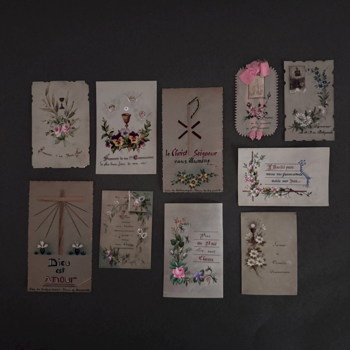 Lot de 10 images pieuses anciennes A5790 Ces images pieuses sont anciennes. Pour l’état, notons un léger jaunissement du papier et des petites taches brunes, le ruban rose est usé, une déchirure. Nos photos vous permettent d'apprécier la qualité de l'objet. Merci de bien détailler les photos. N'hésitez pas à zoomer . Les photos font partie intégrante de la description. Dimensions : - Dieu est amour  Hauteur : 12,6 cm Largeur : 7,9 cm - avec ruban rose Hauteur : 8 cm Largeur : 4,9 cm   Je reste à votre disposition pour toute question. État:OccasionObjet ayant été utilisé. les éventuelles imperfections. Type:Christianisme Sous-type:Icône, Image pieuse Pays d'origine:France Matière:Papier, Carton