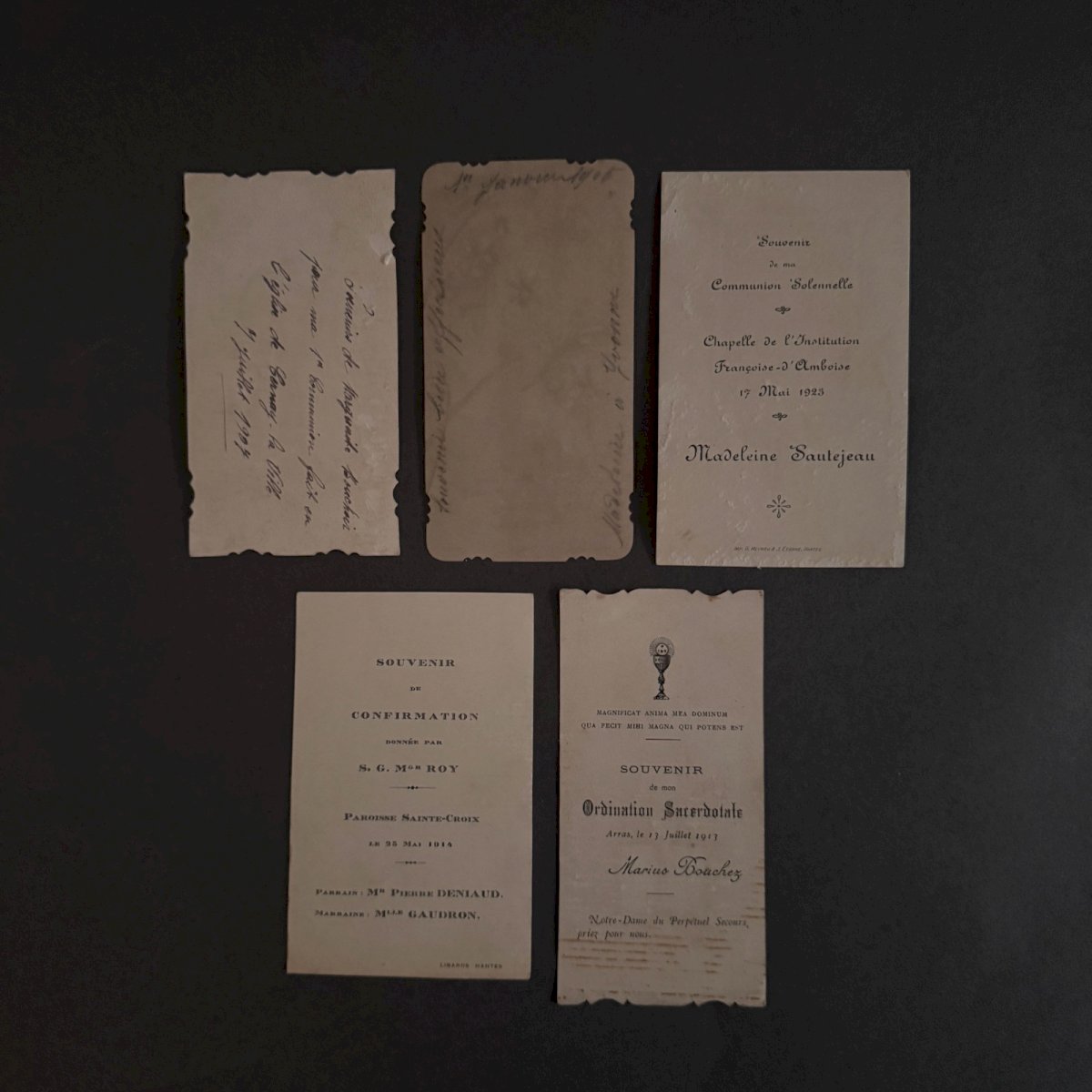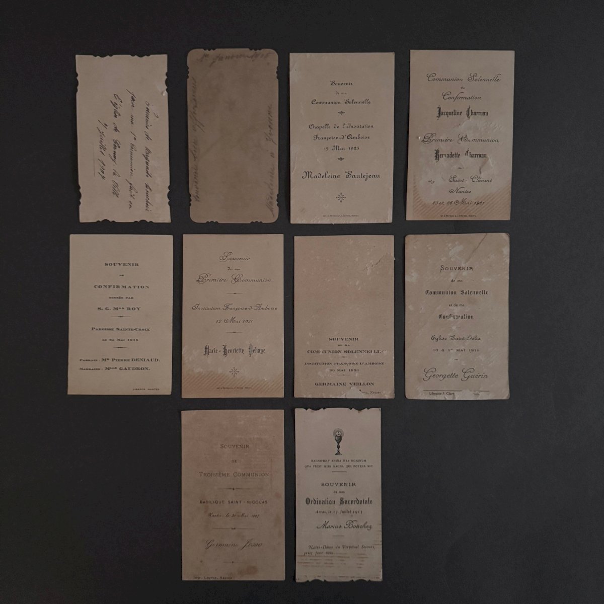 Lot de 10 images pieuses anciennes A5794 Ces images pieuses sont anciennes. Pour l'état, notons un léger jaunissement du papier et des petites taches brunes. Nos photos vous permettent d'apprécier la qualité de l'objet. Pour l'état, merci de bien détailler les photos. N'hésitez pas à zoomer . Les photos font partie intégrante de la description. Dimensions : - Saint Jean Hauteur : 11,7 cm Largeur : 7,1 cm - Cantique de la Sainte Vierge Hauteur : 11,1 cm Largeur : 6,3 cm   Je reste à votre disposition pour toute question. État:OccasionObjet ayant été utilisé. les éventuelles imperfections. Type:Christianisme Sous-type:Icône, Image pieuse Pays d'origine:France Matière:Papier, Carton