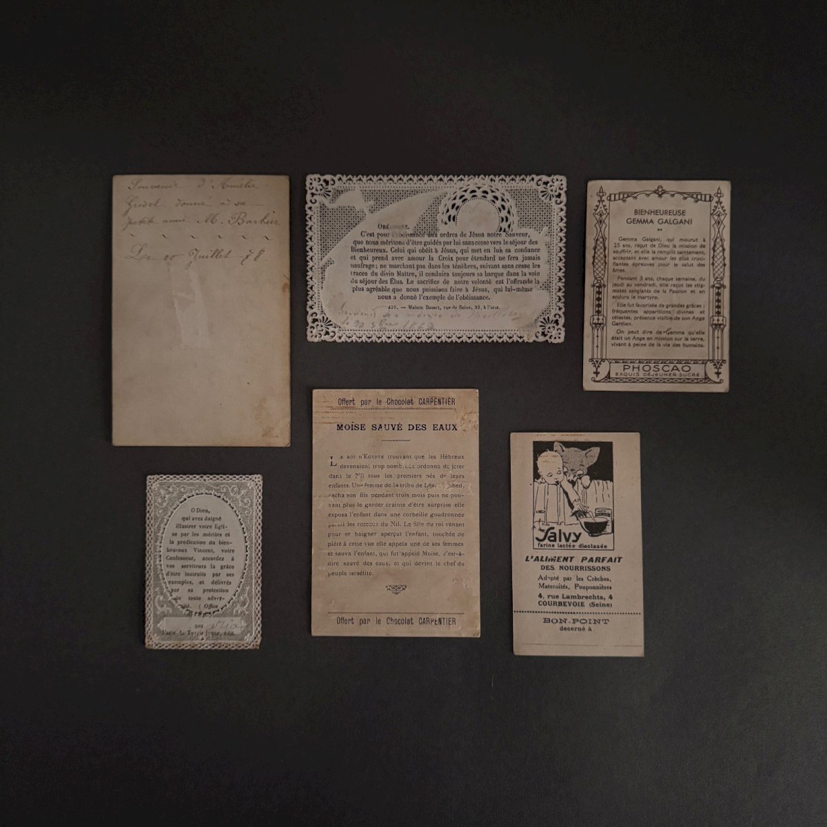 Lot de 10 images pieuses anciennes M3740 Ces images pieuses sont anciennes. Pour l’état, notons un léger jaunissement du papier et des petites taches brunes, quelques coins abimés. Nos photos vous permettent d'apprécier la qualité de ces objets. Merci de bien détailler les photos. N'hésitez pas à zoomer . Les photos font partie intégrante de la description. Dimensions : - la plus petite Hauteur : 7,5 cm Largeur : 5,1 cm - la plus grande Hauteur : 10,8 cm Largeur : 7,7 cm   Je reste à votre disposition pour toute question. État:OccasionObjet ayant été utilisé. les éventuelles imperfections. Type:Christianisme Sous-type:Icône, Image pieuse Pays d'origine:France Matière:Papier, Carton
