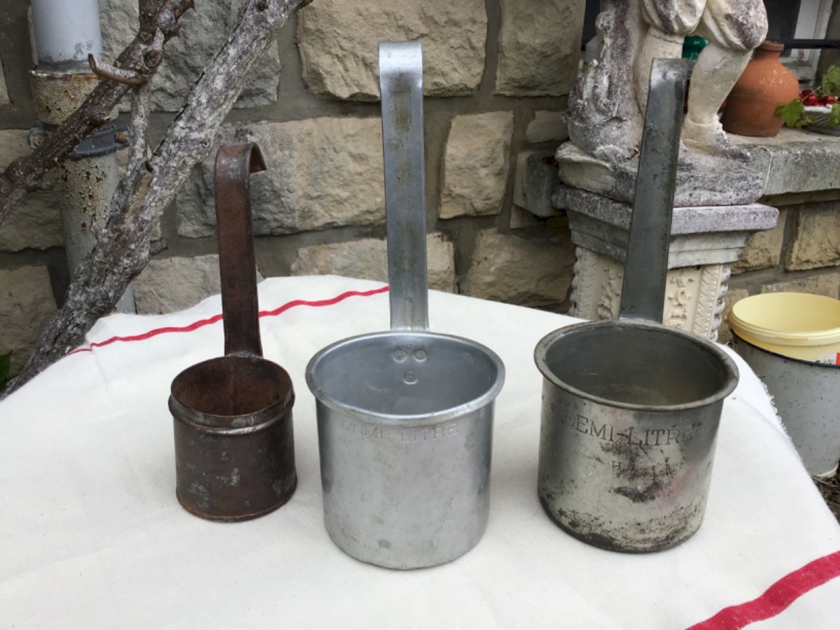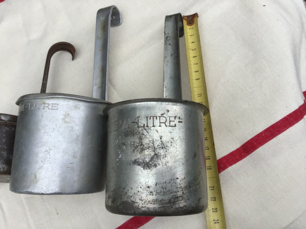 Lot de 3 Ancienne mesure à lait 2 demi-litre et 1 quart-de-litre aluSEB et fer