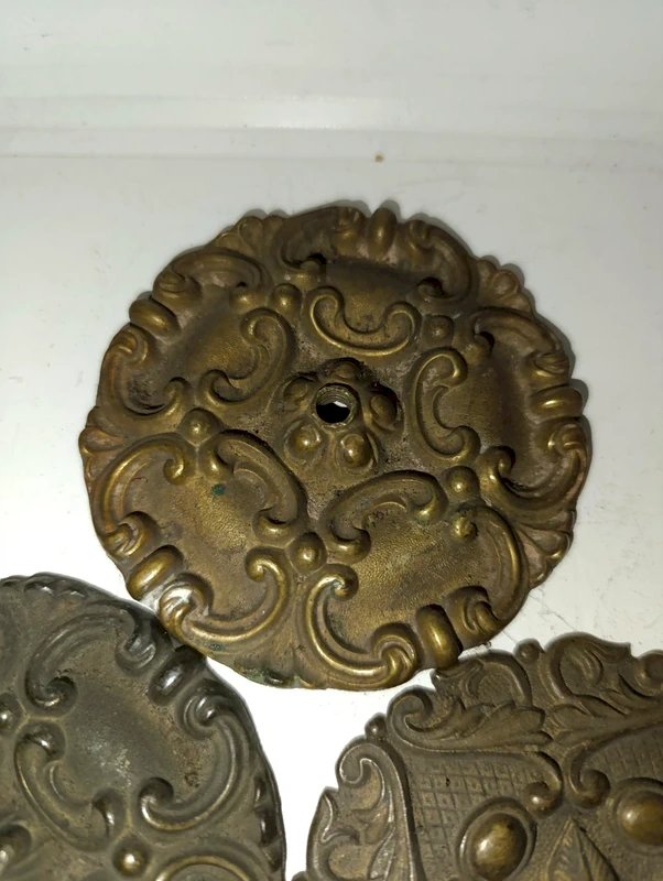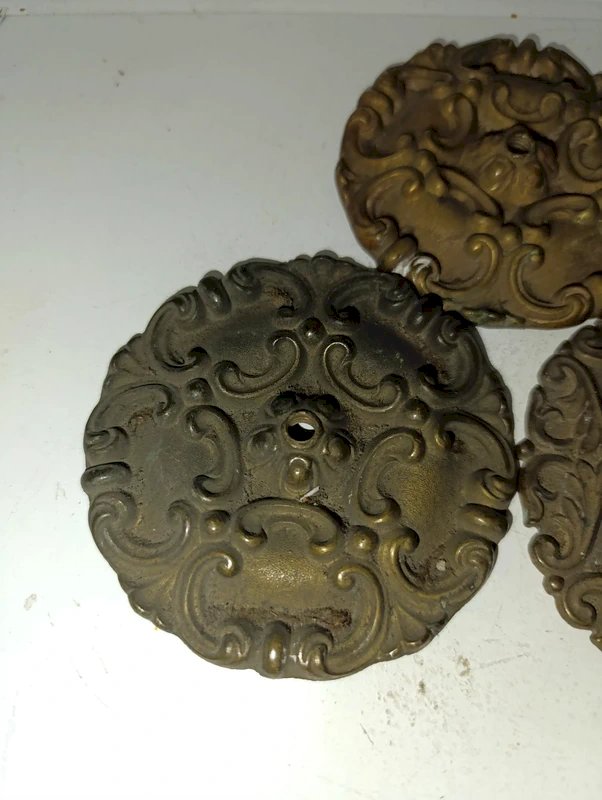 lot de 3 anciennes poignee de porte decor rosace en laiton en bon etat deux sont percees et une non diametre 9cm patine du temps