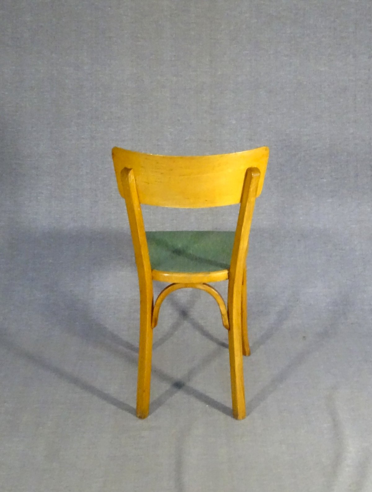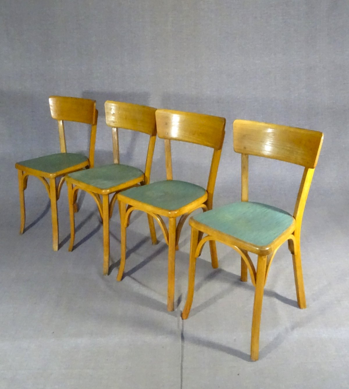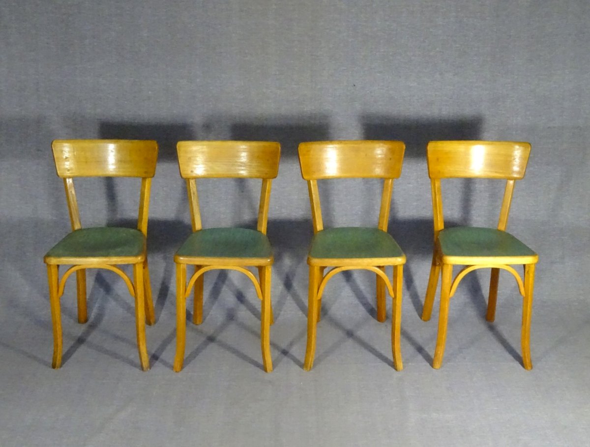 Set de 4 Chaises Baumann N°58 – Cuisine- Bistrot- Un modèle avéré dès 1955, voir catalogue. Assise rare, recouverte de linoleum vert amande, un revêtement au départ conçu pour les sols domestiques, à base de fibre de lin et d’huile de lin. Il existait sous divers coloris. Sièges en parfait état, prêts à servir. Estampillées Baumann. Ils ont la teinte « chêne doré » nommée ainsi par Baumann à la sortie de la guerre. Nous proposons gracieusement la pose de patins vissés, en feutre comprimé, (origine Allemagne) qui empêchent toute sonorité de résonnance. Dimensions : Hauteur d’assise : 46,5 cm, Hauteur Totale :81 cm- Assise :37X37 cm Plus de photos et renseignements sur demande. Expédition France, Europe, retrait Alsace. État:OccasionObjet ayant été utilisé. Objet présentant quelques marques d'usure superficielle, entièrement opérationnel et fonctionnant correctement. Il peut s'agir d'un modèle de démonstration ou d'un objet retourné en magasin après une courte période d'utilisation. les éventuelles imperfections. Couleur:Vert Marque:Baumann Type:Chaise Hauteur:81 Longueur:45 Largeur:42